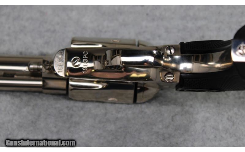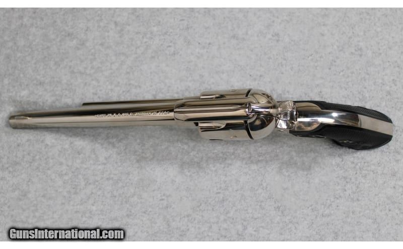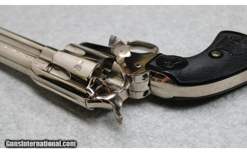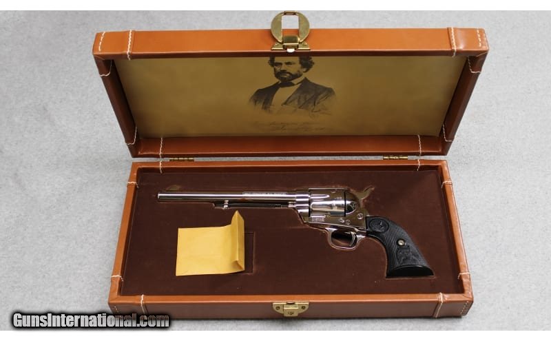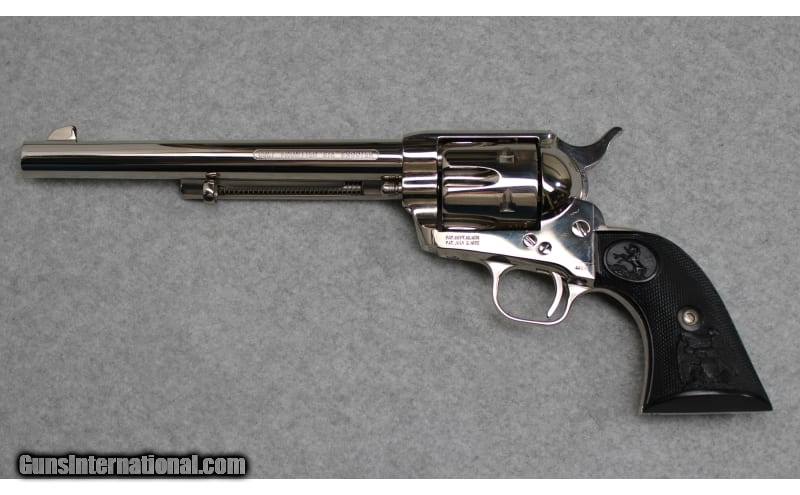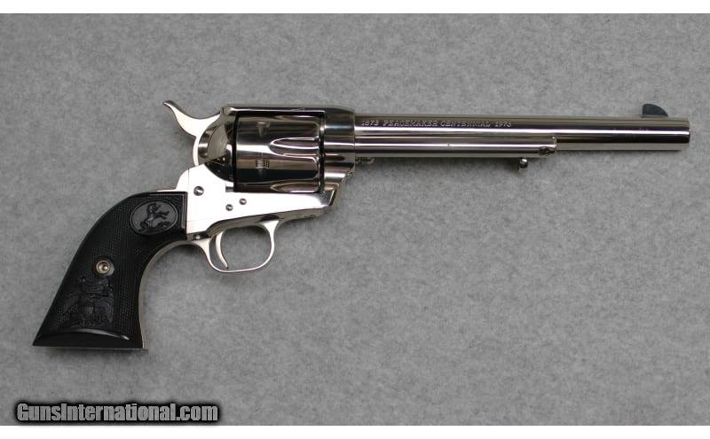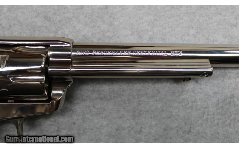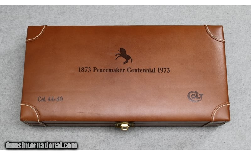 Description: Colt Frontier Six Shooter Centennial Single Action Army revolver chambered in .44 WCF (.44-40 Winchester). Introduced by Colt in 1973 as a limited run to commemorate the 100th anniversary of the introduction of the Colt model 1873 this revolver bears the serial number 1983PC. Features include a 7-1/2 inch nickel plated barrel and frame with hard rubber grips. In overall excellent condition, the revolver has wear as one would expect from a firearm of its age. Comes with a factory presentation case in very good condition. .44-40 Winchester SOLD Metal Condition: Excellent with Very Minor Handling Marks Wood Condition: Very Good with Minor Handling Marks Bore Condition: Clear with Light Pitting and Frosting Barrels: 7.5 inch Butt Pad: Hard Rubber Weight: 2 Lbs 6 Oz Sights: Front Blade Item Location: Fort Worth, TX |