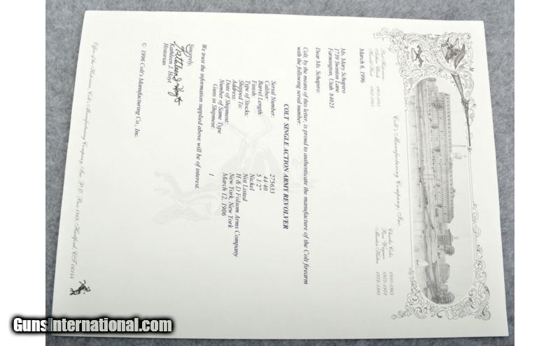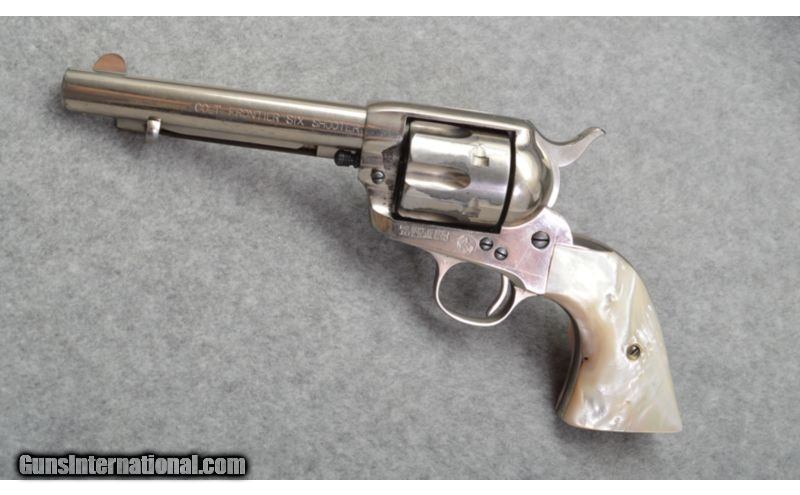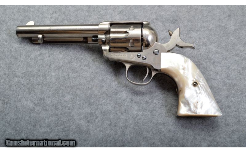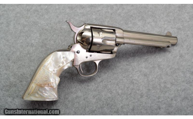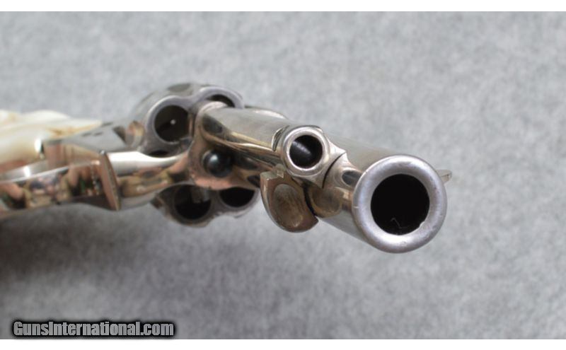 Description: SOLD Curio/Relic: Yes Manufacturer: 1906 Caliber Info: .44-40 Winchester Metal Condition: Very Good with some usage/handling marks. There are a few spots of the nickel finish wearing on the sharp edges. A few small pits are present. The cylinder and part of the receiver has some nickel finish wear and blemishes. Bore Condition: Excellent, bright and good lands Barrels: 5 ½ Inches Butt Pad: Custom white grips with a ¿Bull¿ detail Sights: Front blade sight with rear fixed sight Extras: Letter of authenticity from Colt Item Location: Farmington, UT |
