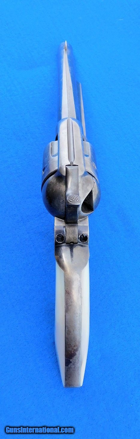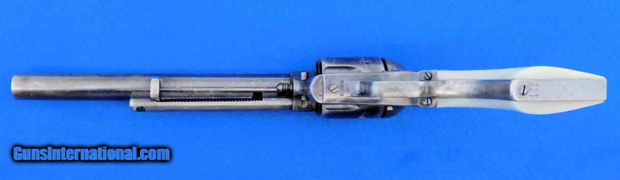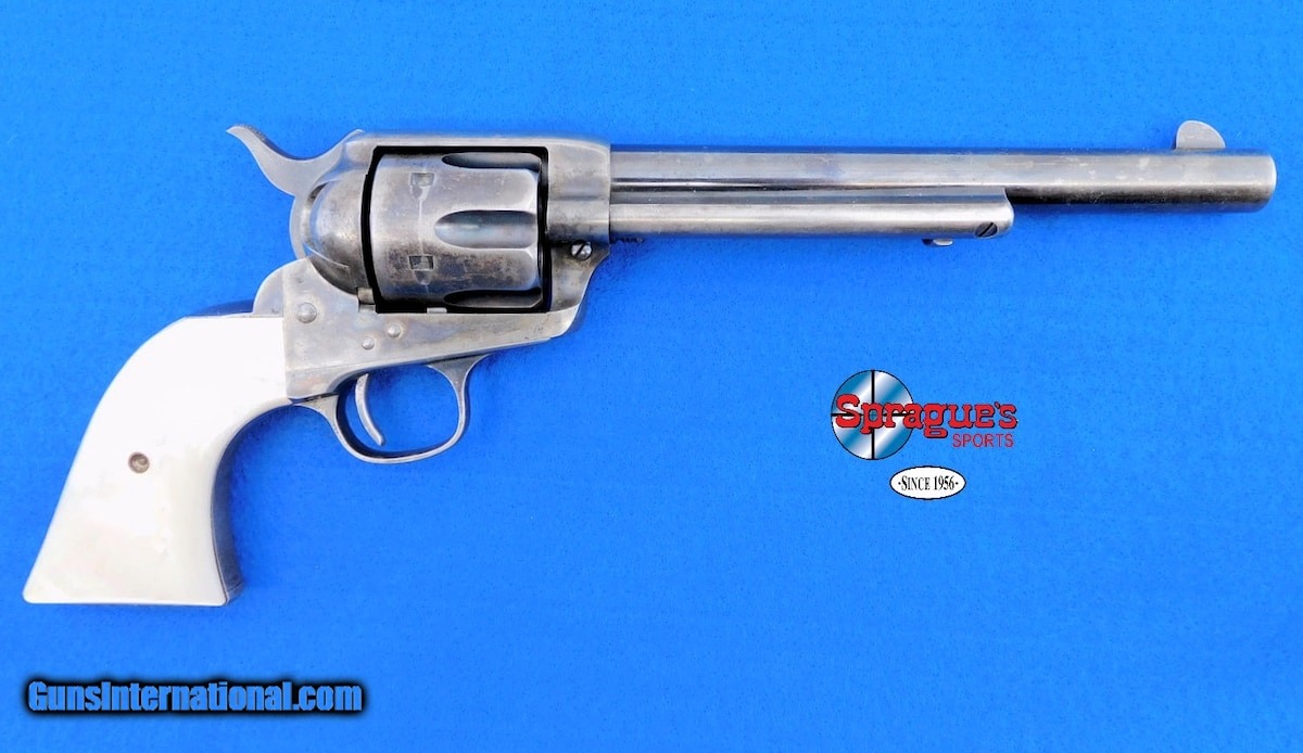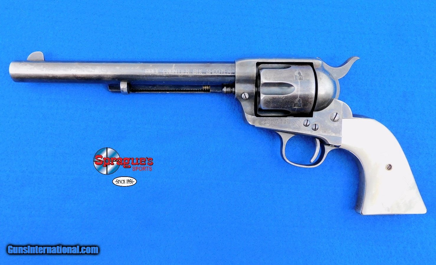 Description: Guns Listing ID: 497897 This Colt Frontier Shooter is a 1st generation single action revolver manufactured in 1896 and chambered in .44-40. The blued 7 1/2\" barrel has a shiny bore with strong rifling, with \"COLT‚‚S PT. F. A. MFG Co. HARTFORD CT. U.S.A.\" stamped on the top, and \"COLT FRONTIER SIX SHOOTER\" stamped on the left side. Patent dates are stamped on the left side of the color case hardened action with the circled Rampant Colt logo beside. Matching serials on the action, trigger guard, and frame butt. The action is tight and locks up firmly. Mother of Pearl grips are installed on the revolver with the original hard rubber grips included. Details of this original historical revolver are supported by the included Colt Office of the Colt Historian Letter dated March 30, 2022. We will accept C&R for this revolver. This will be a GREAT revolver for your collection! 12839 SOLD Manufacturer: COLT Model: FRONTIER SIX SHOOTER Caliber Info: .44-40 Condition: Used - Non-Certified Barrels: 7.5 BARREL Finish: BLUED |