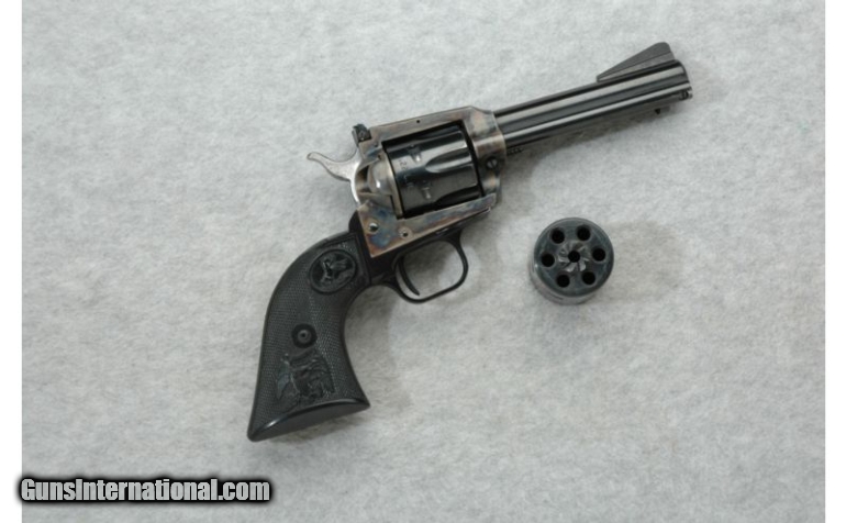 Description: SOLD Caliber Info: .22 L.R. and .22 Magnum Chambers: 6 shot Metal Condition: Good. A little blue wear at bore left side and spots on the cylinder. Bore Condition: Very good. Barrels: 4.4 inches. Triggers: SA Stock: Colt checkered hard black plastic. Case colored receiver. Weight: 30 oz. Sights: Serrated blade front. Adjustable notch rear. Extras: Comes with two interchangeable cylinders. Item Location: Richfield, WI |