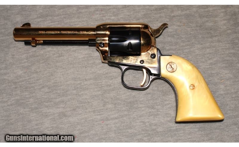 Description: As new condition with display box. Classic Colt single action rimfire revolver celebrating the Nebraska Centennial. Gold barrel and frame, black 6 shot fluted cylinder and grip frame, fixed sights and factory Colt grips. An excellent choice for Colt or Nebraska collcectors. .22 Long Rifle SOLD Chambers: Revolver Metal Condition: As new Bore Condition: Bright Barrels: 4 3/4' Triggers: Single action Butt Pad: Colt grips Sights: "Fixed rear, blade front sights Item Location: La Vista, NE |
