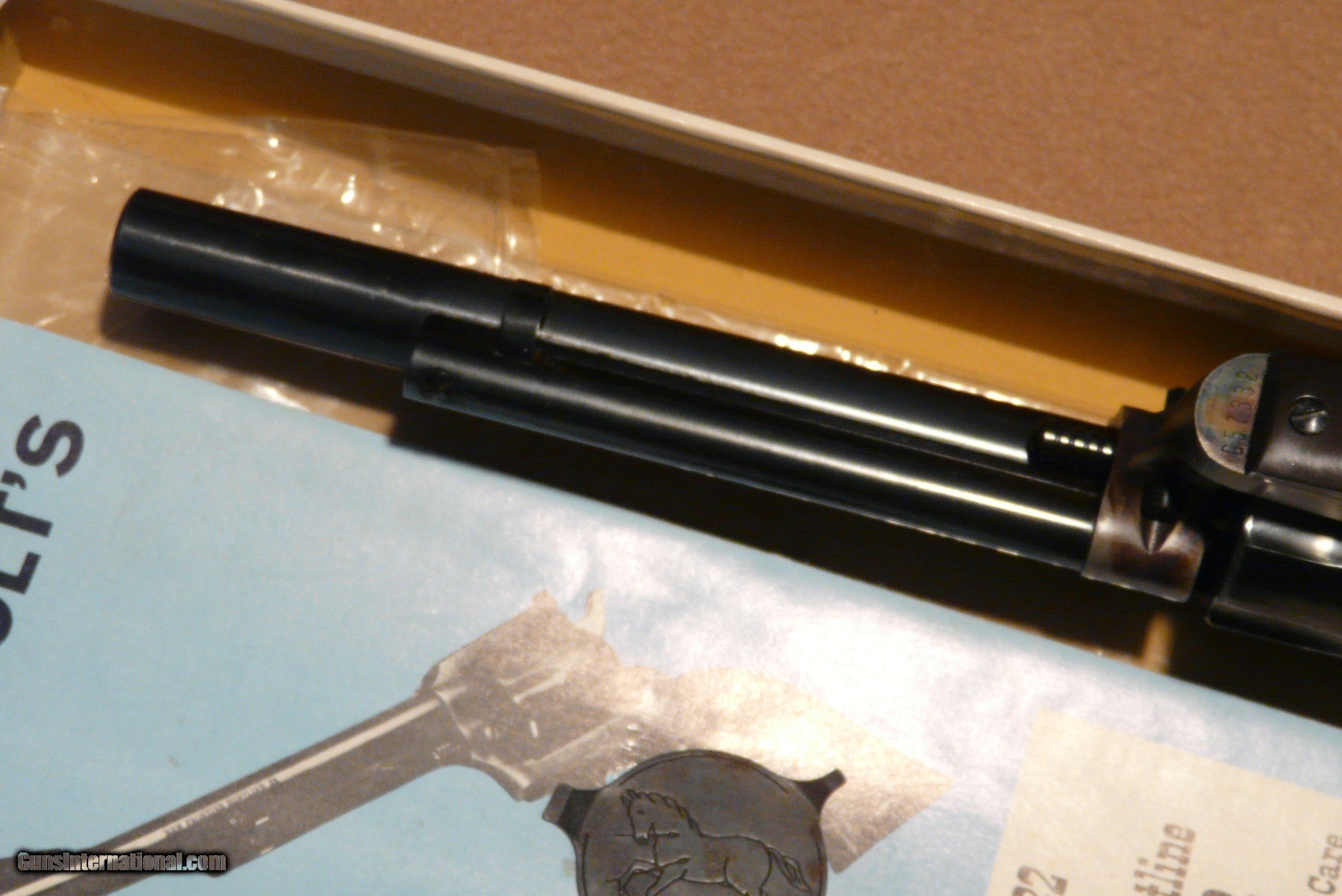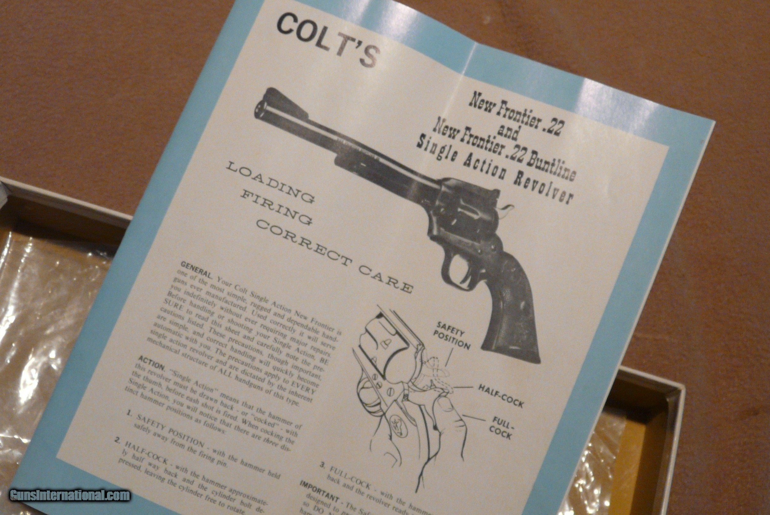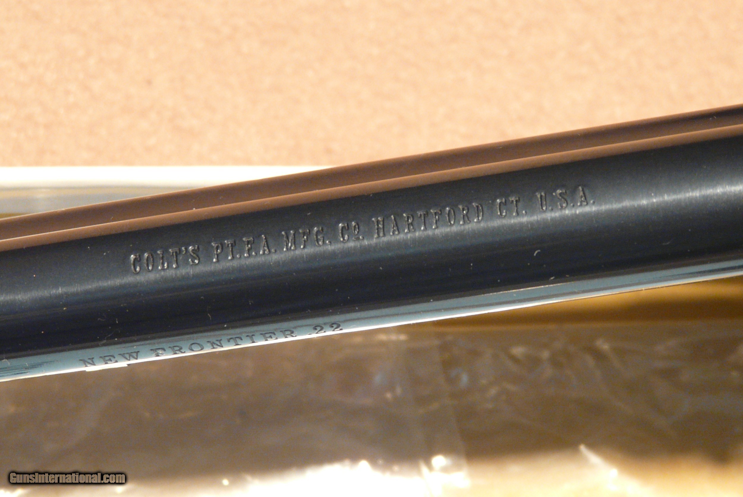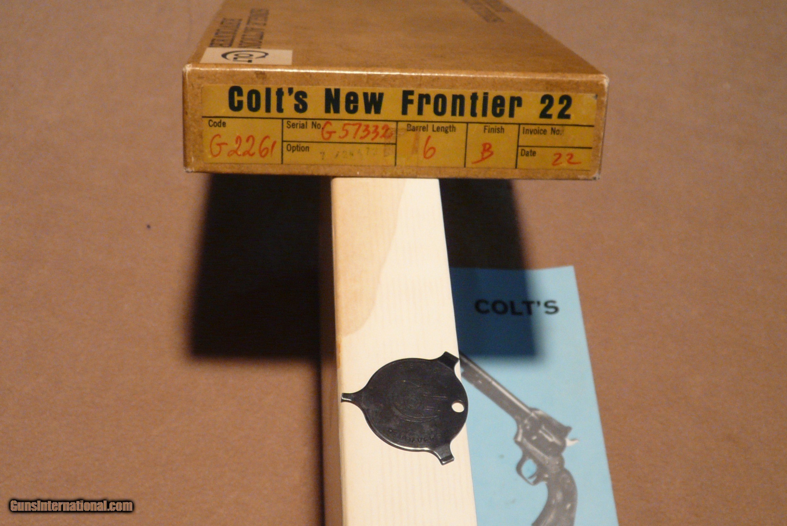 Description: This is a mint condition new Frontier that has fired 6 shots from each cylinder? Owner says he had to do it many years ago, 1972 ?? As you can see in pics, it is in new condition and mint case color and blue, not a mark on the gun , black factory grips, the box is near mint also, and comes with pamphlet and round colt screwdriver. SOLD |