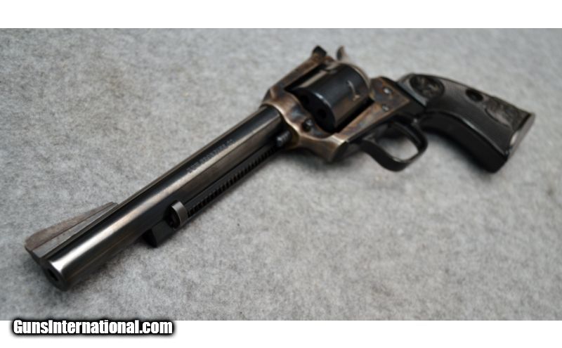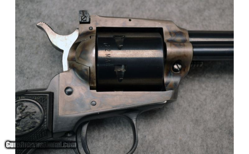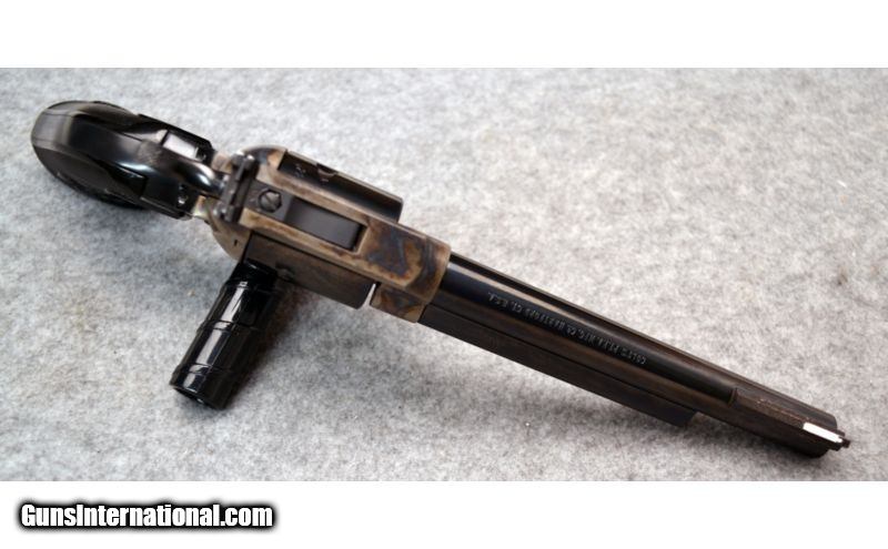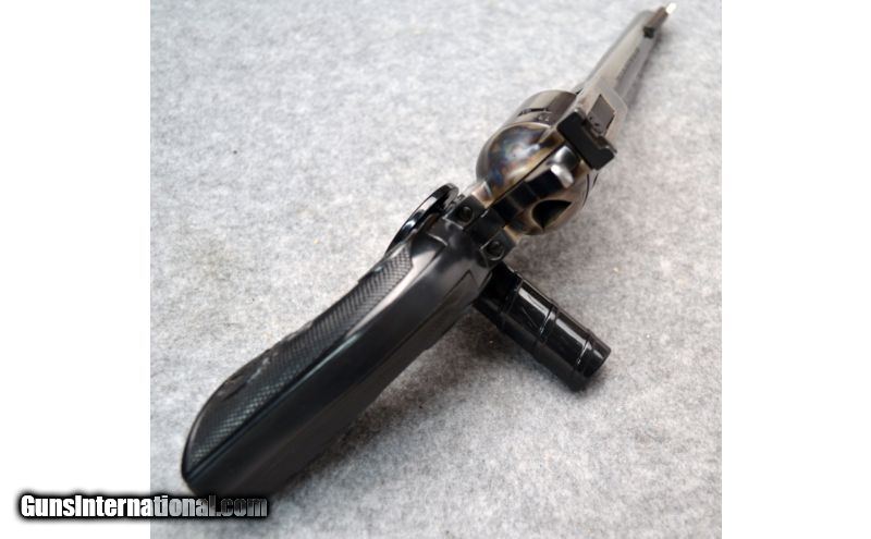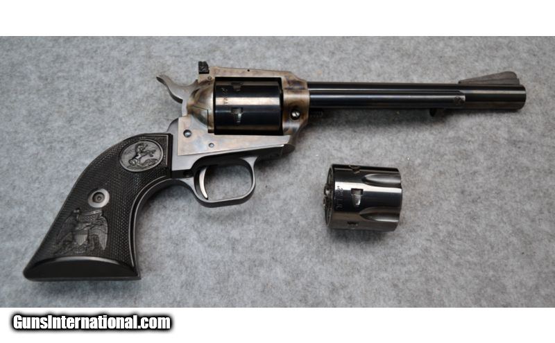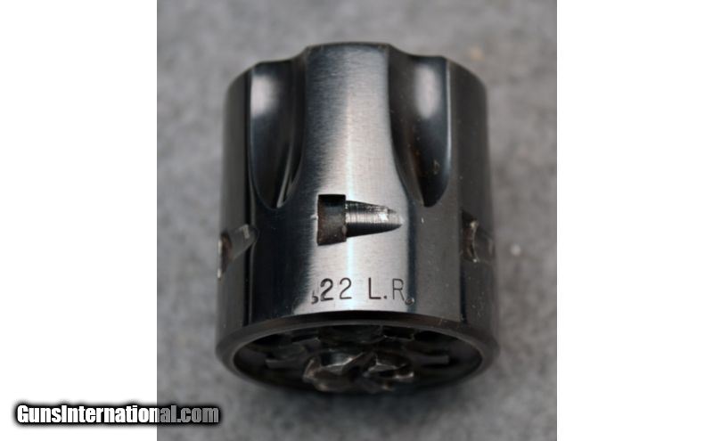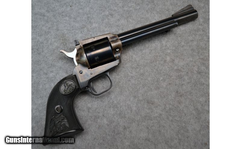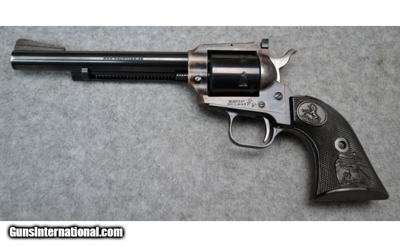 Description: Very good condition overall with nice case hardening on the frame. Comes with additional .22 LR cylinder. SOLD Manufacturer: Circa 1974-1975 Caliber Info: .22 Magnum, .22 LR Metal Condition: Very good with finish wear on barrel and front sight Bore Condition: Excellent Barrels: 6 Triggers: Single action Stock: Black checkered synthetic Sights: Front fixed ramp with white insert, adjustable rear square notch Item Location: Christiana, DE |