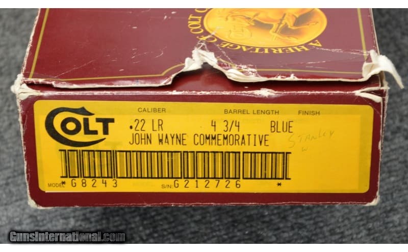 Description: For your consideration, a Colt New Frontier chambered in .22 Long Rifle. This piece is a commemorative tribute celebrating the legendary actor Marion Robert "John Wayne" Morrison. A such, it features a nickel plated hammer, cylinder, ejector rod, base pin, and screws in striking contrast with the blued and case colored finish of the remainder. This piece dates to 1984. .22 Long Rifle SOLD Chambers: 6 Metal Condition: Excellent Wood Condition: Excellent Bore Condition: Excellent Barrels: 4.5 Triggers: Smooth Face Weight: 1.75 lbs Sights: Iron Sights Item Location: Hamburg, PA |