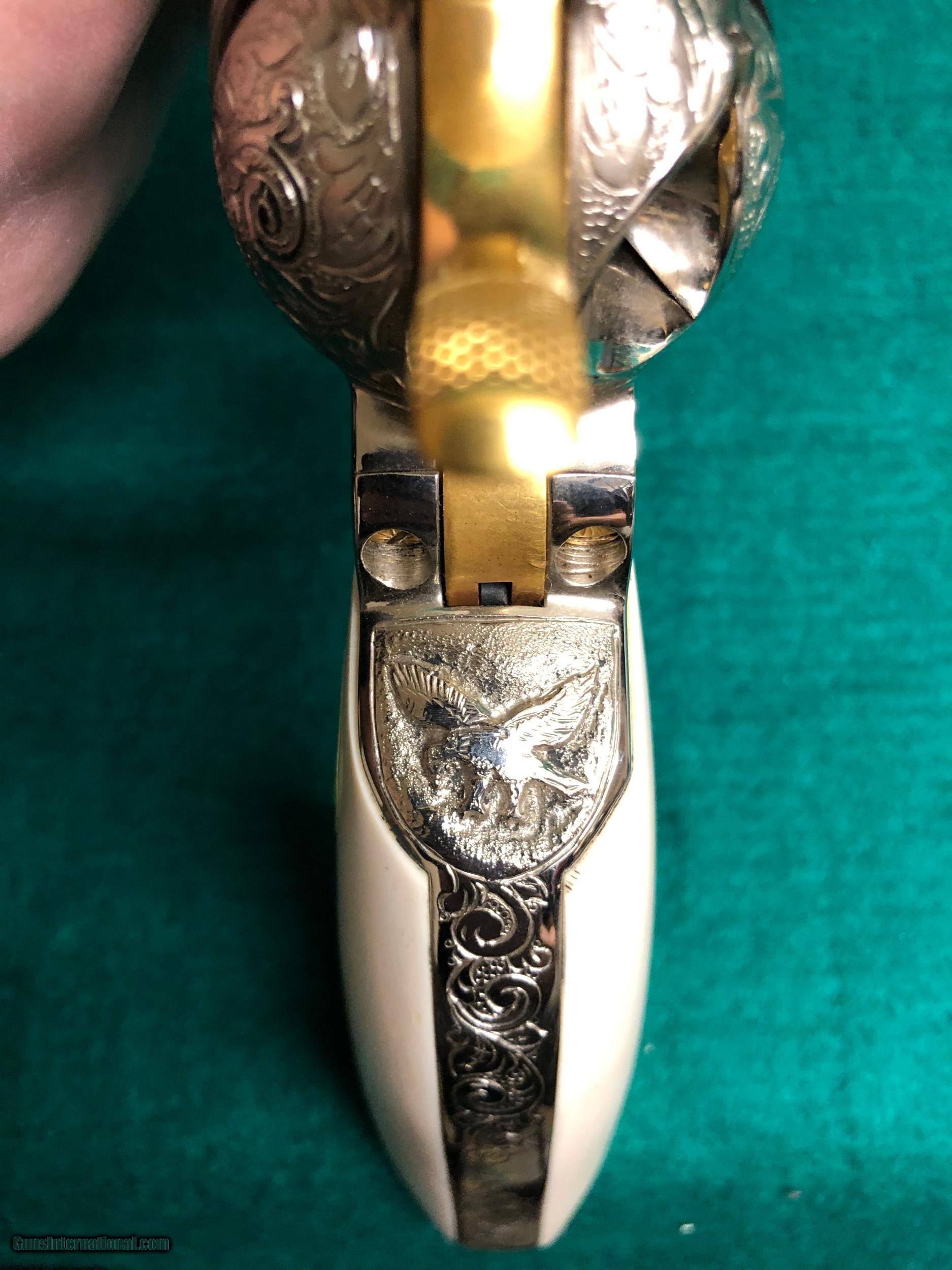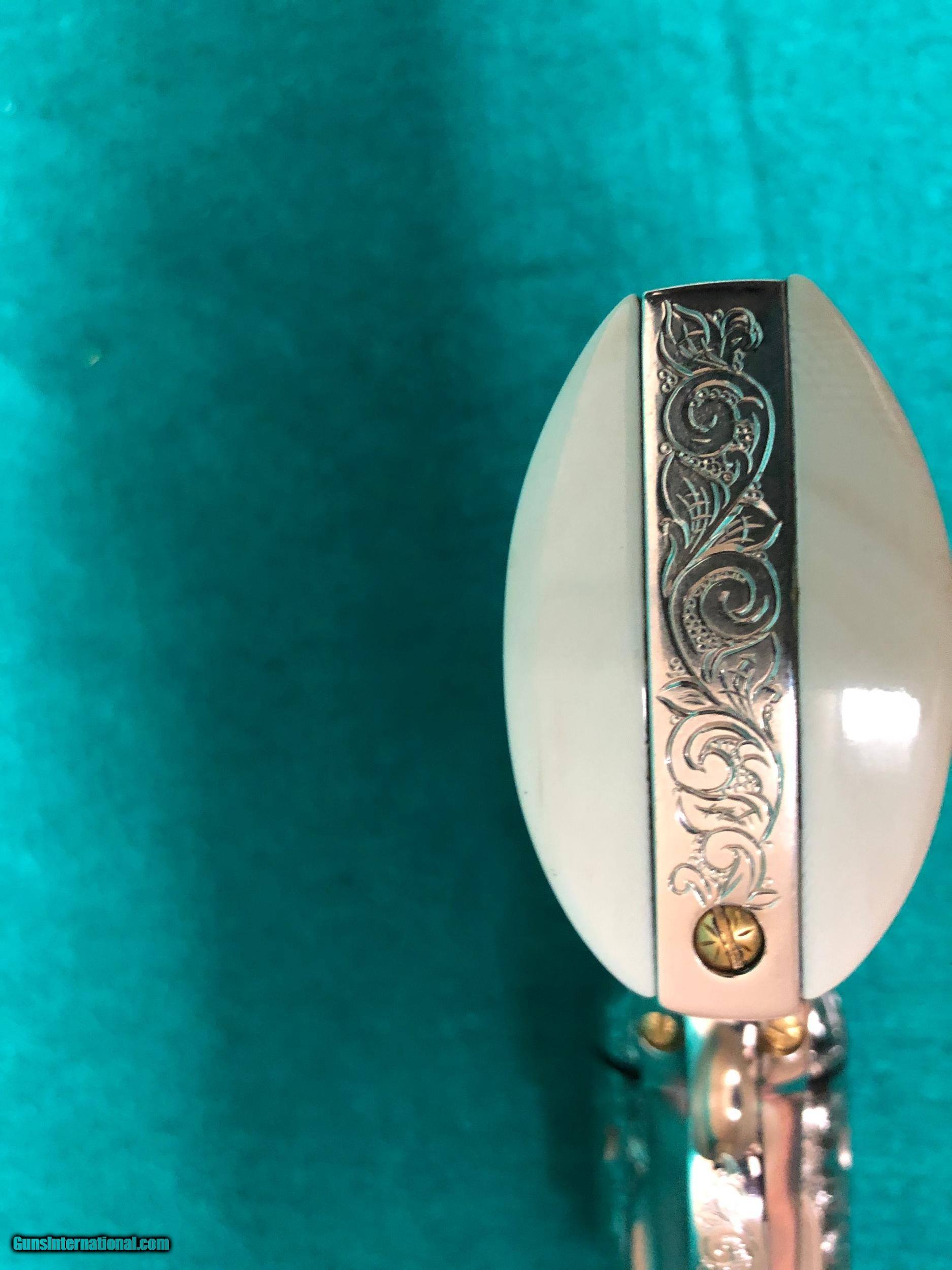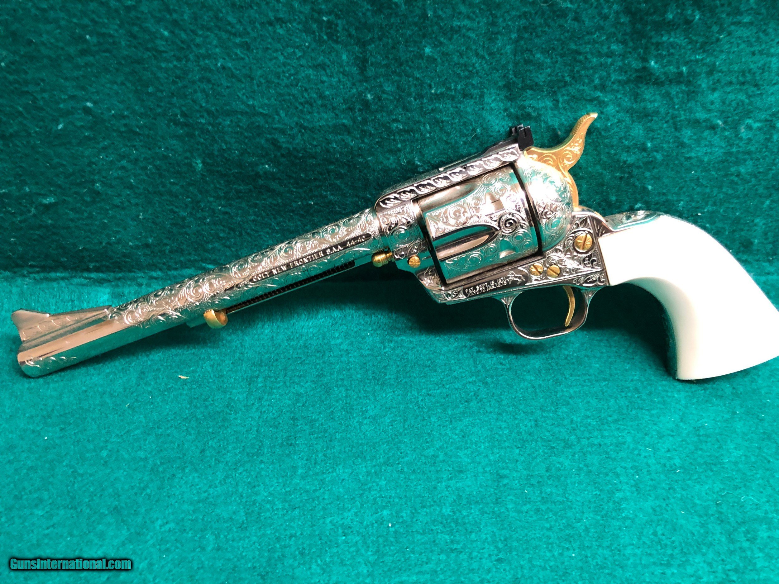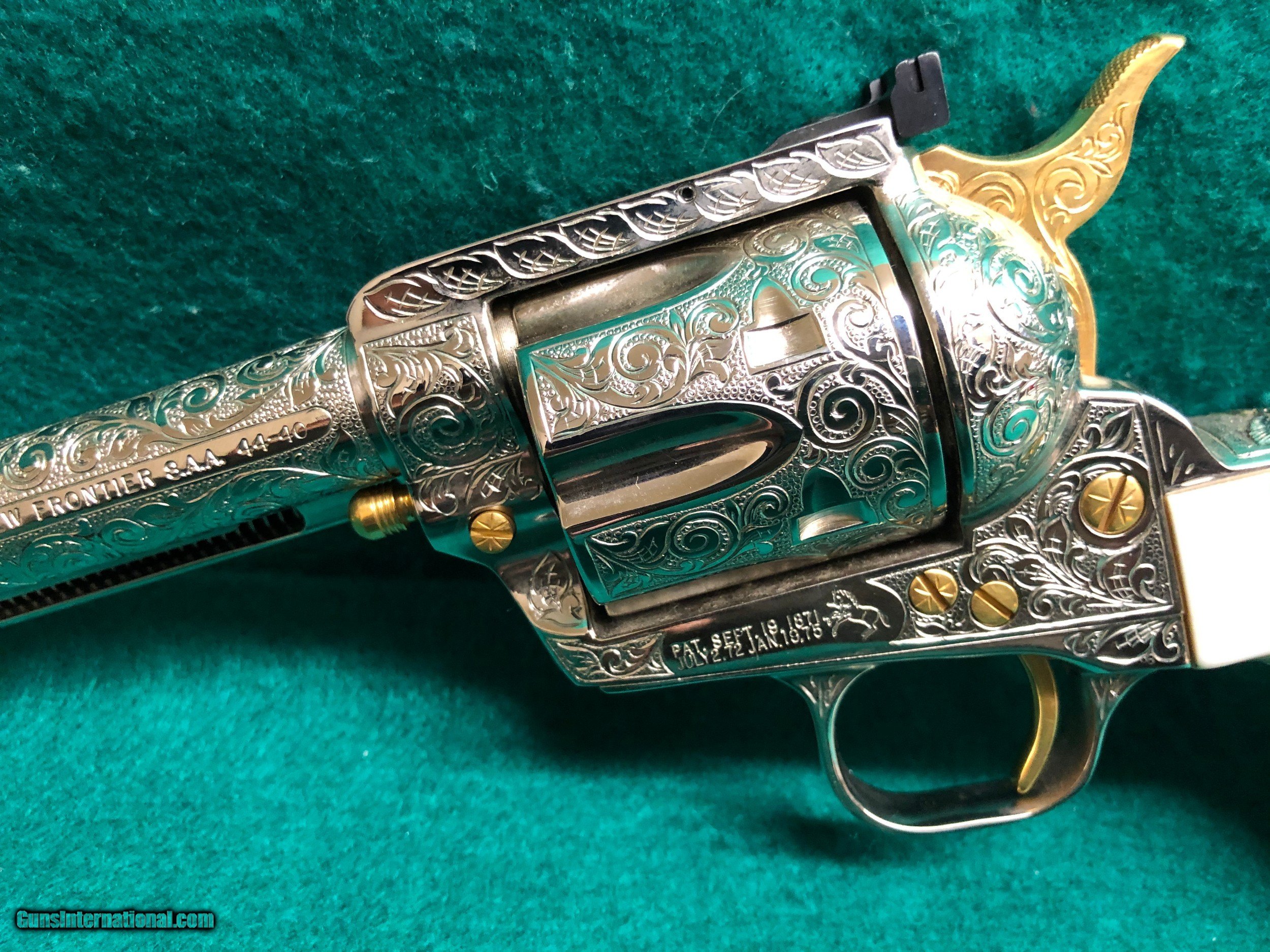 Description: COLT NEW FRONTIER SAA 44-40 CALIBER IN NICKEL FINISH. THIS REVOLVER HAS STYLISH ENGRAVING BY BRIAN MEARS OF NORTHERN CALIFORNIA AND HAS GOLD PLATED HAMMER, TRIGGER AND EJECTOR ROD HANDLE. THE GRIPS ARE MADE OF IVORY AND NICELY FIT TO THE FRAME. SOLD Handgun Caliber: .44-40 Winchester (.44 WCF) Manufacturer: COLT Model: NEW FRONTIER SAA Barrel Length: 7.5 Condition: AMAZING |