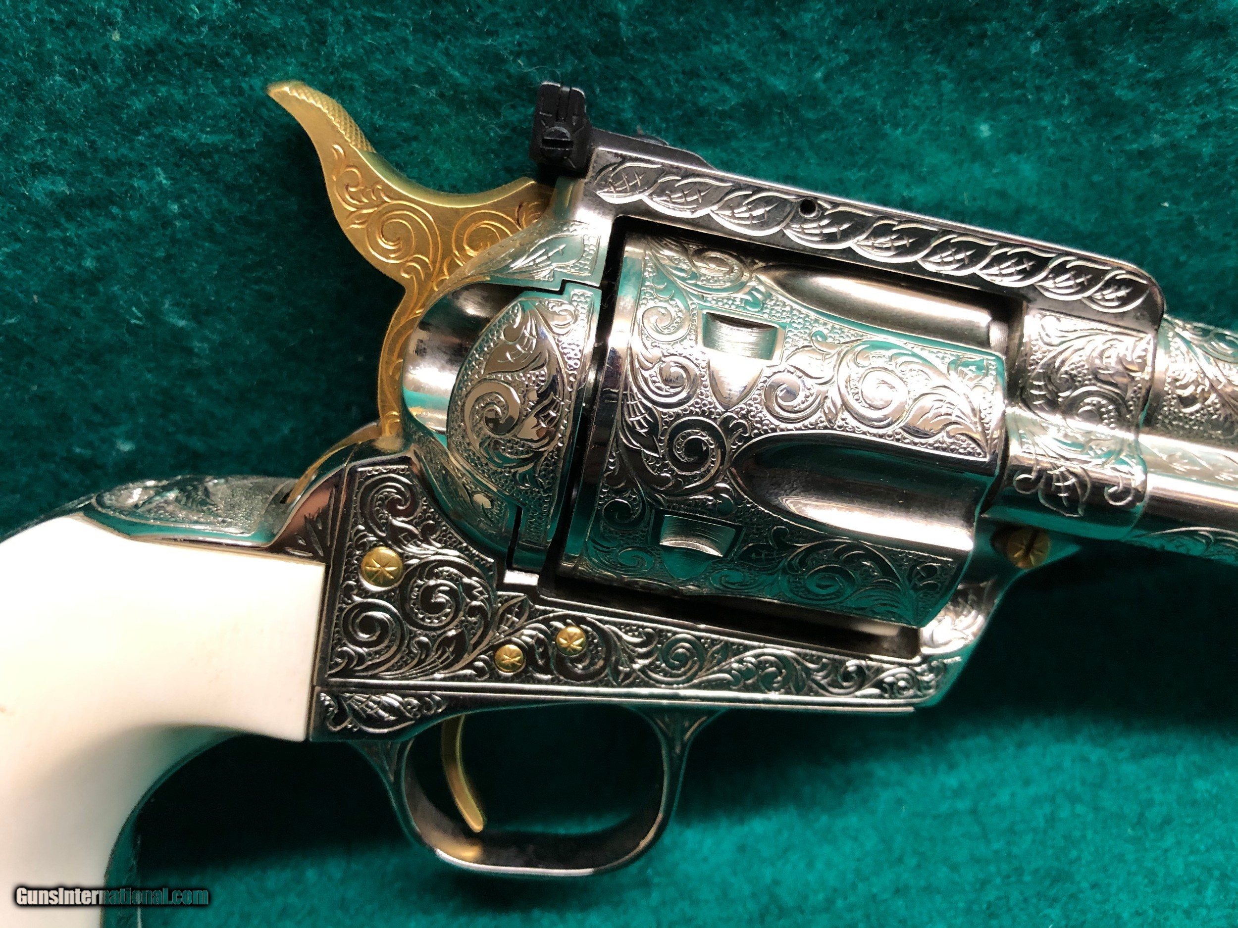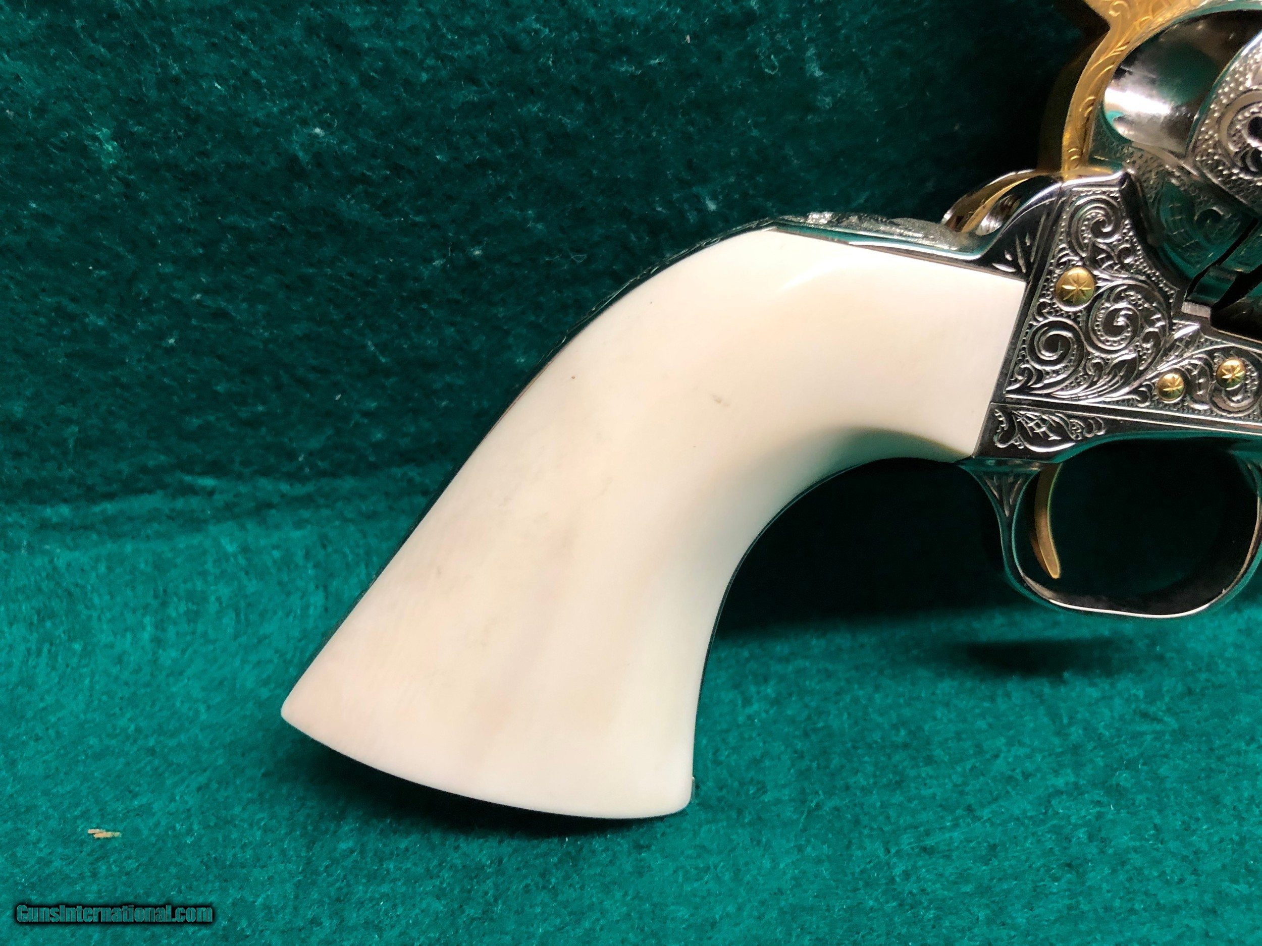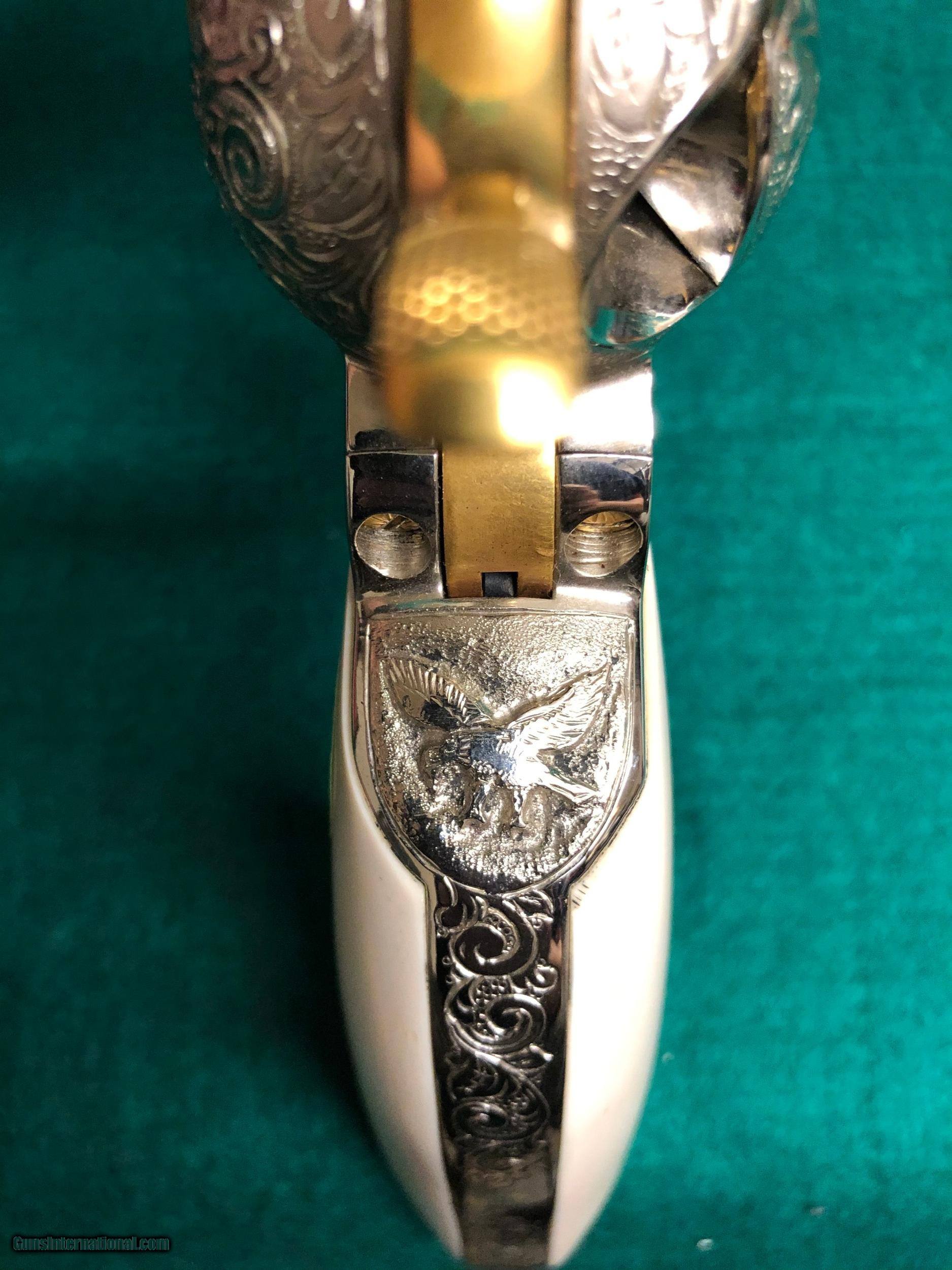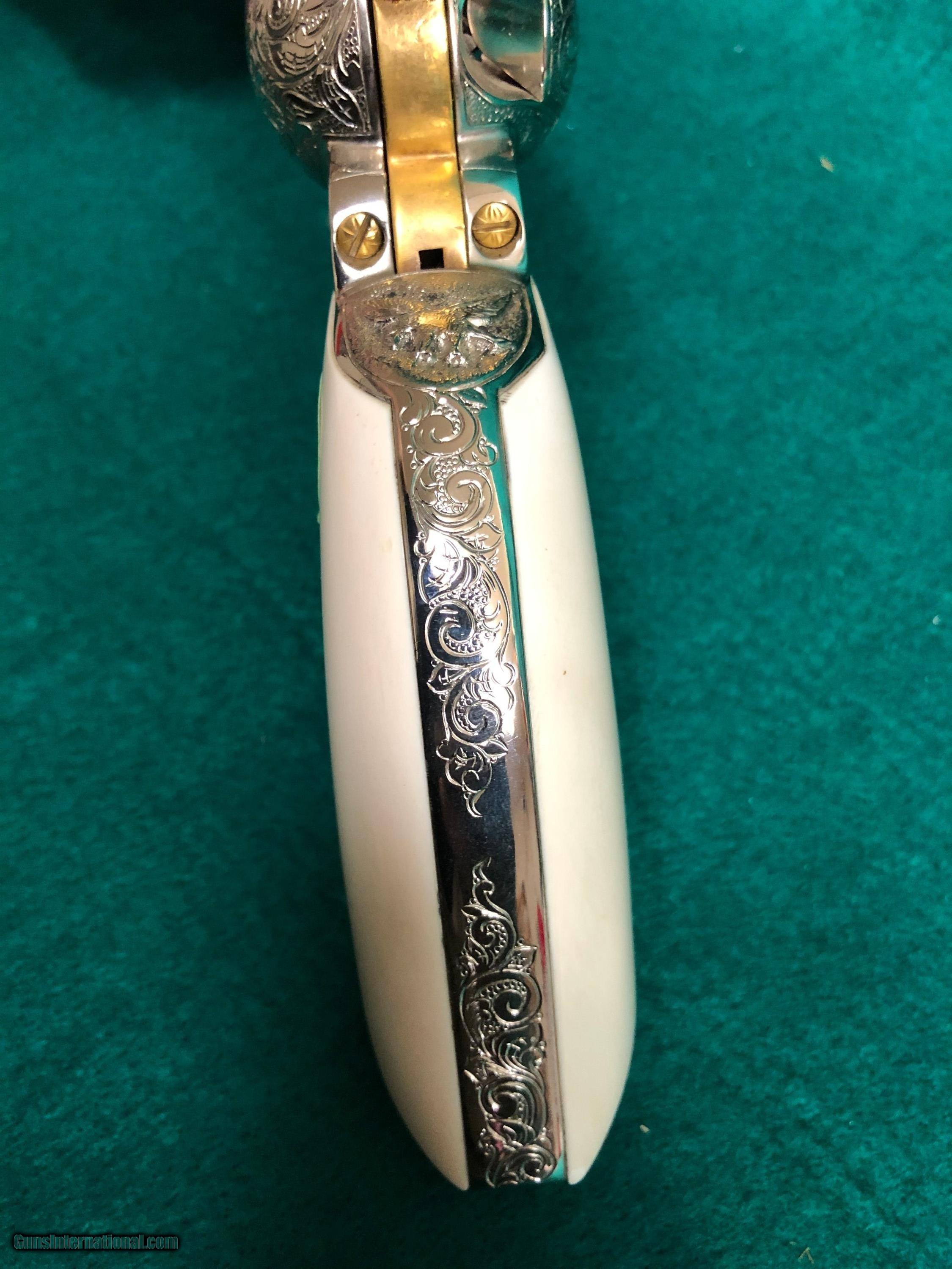 Description: COLT NEW FRONTIER SAA 44-40 CALIBER IN NICKEL FINISH. THIS REVOLVER HAS STYLISH ENGRAVING BY BRIAN MEARS OF NORTHERN CALIFORNIA AND HAS GOLD PLATED HAMMER, TRIGGER AND EJECTOR ROD HANDLE. THE GRIPS ARE MADE OF IVORY AND NICELY FIT TO THE FRAME. SOLD Handgun Caliber: .44-40 Winchester (.44 WCF) Manufacturer: COLT Model: NEW FRONTIER SAA Barrel Length: 7.5 Condition: AMAZING |