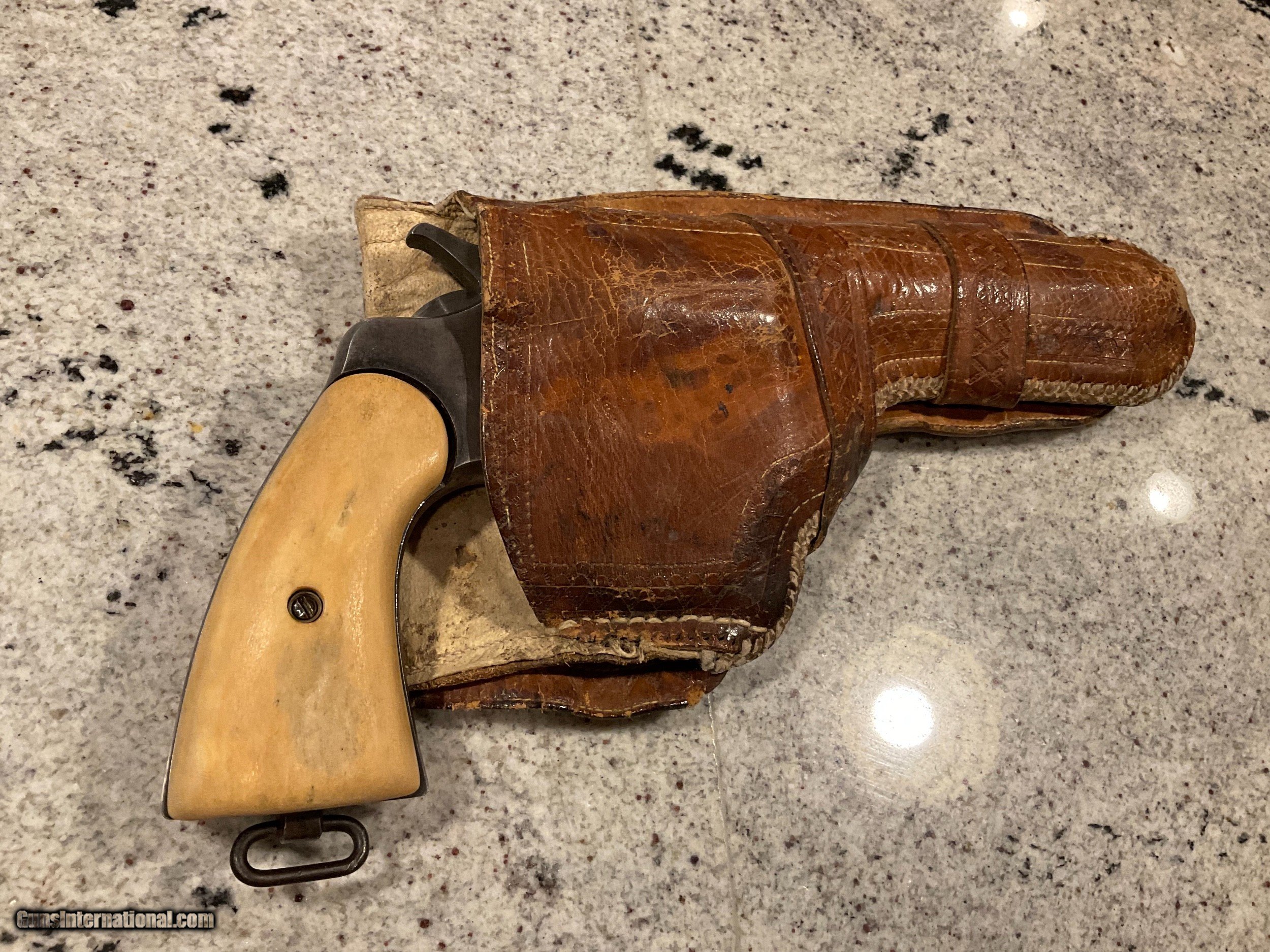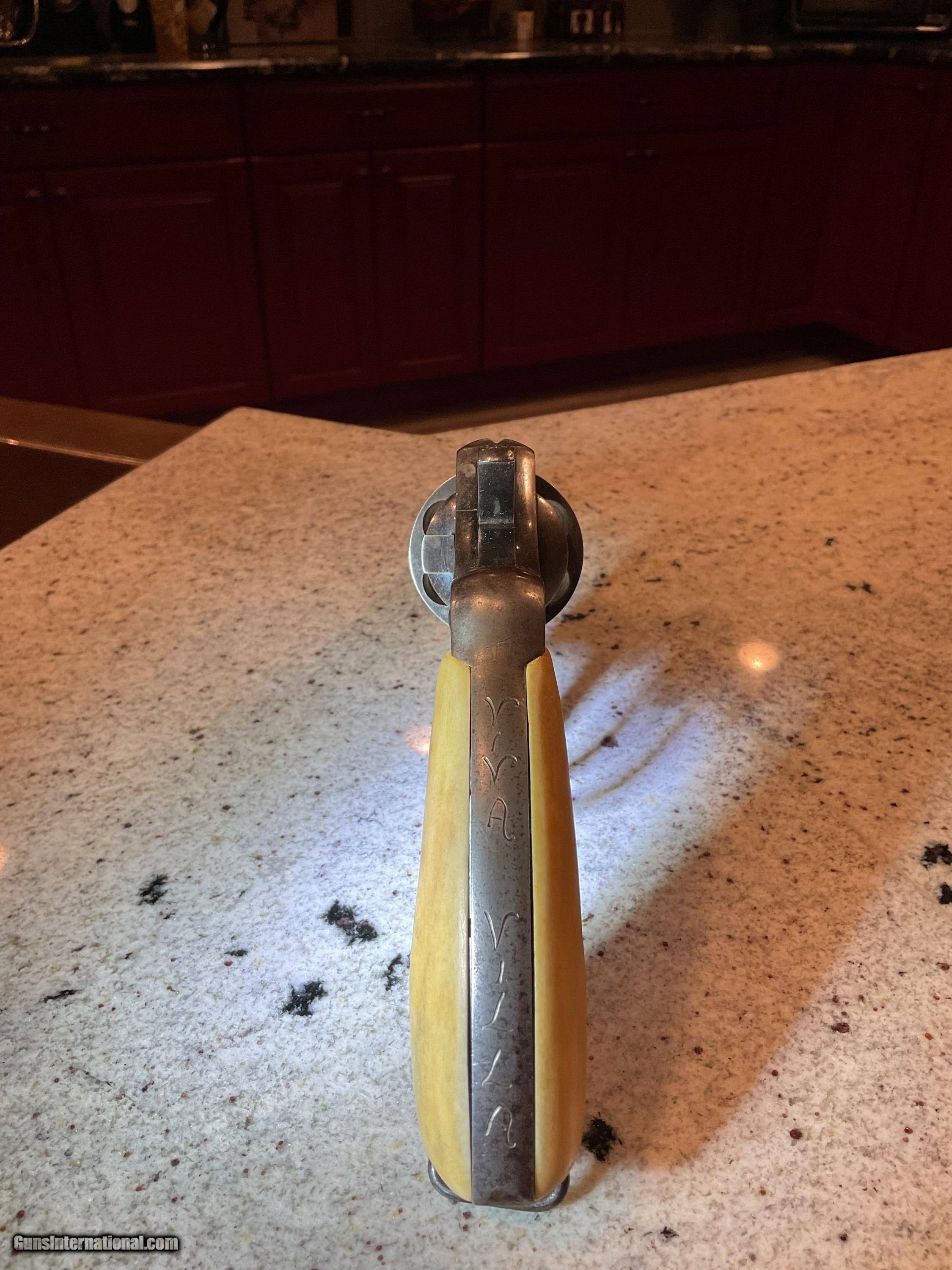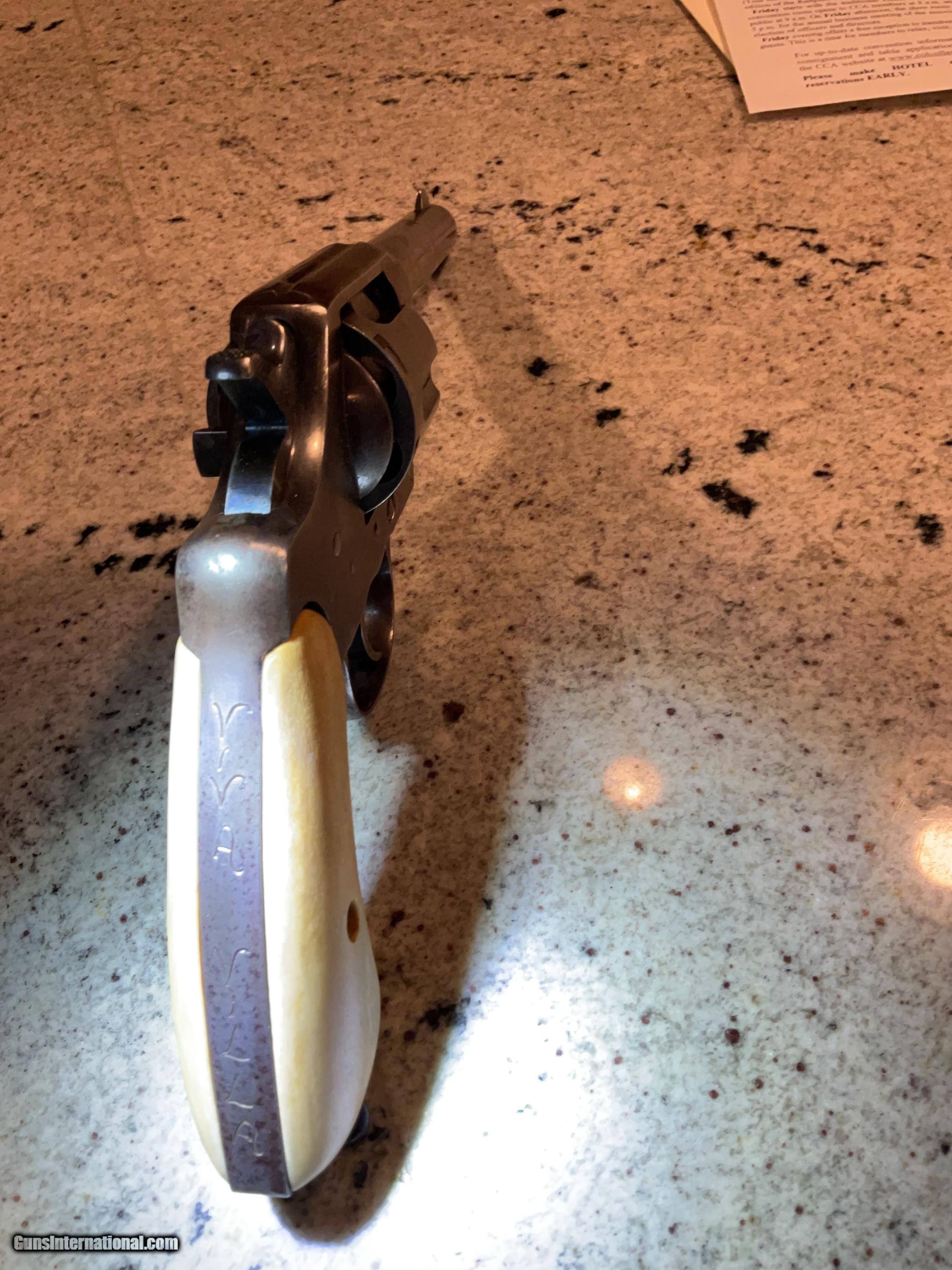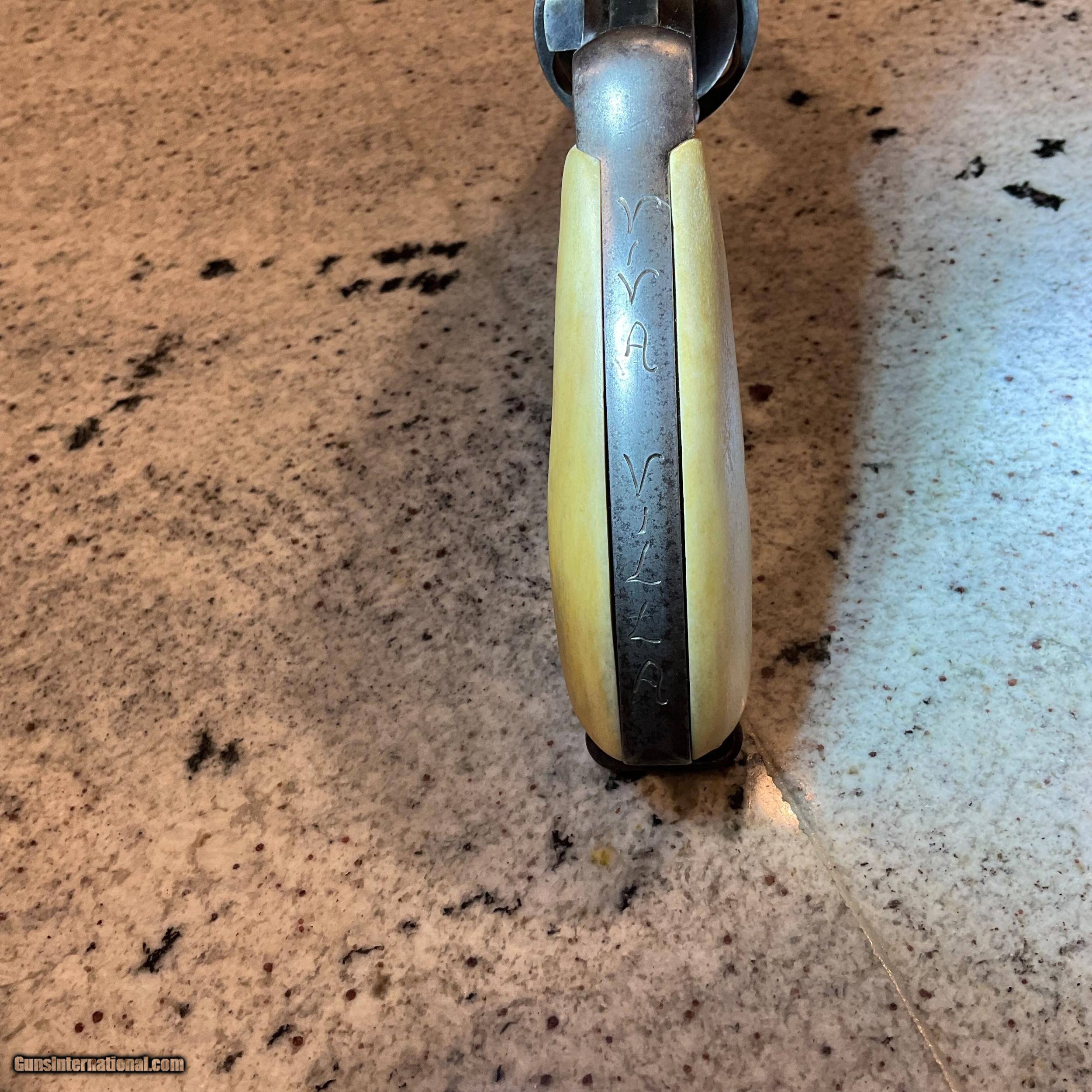 Description: SOLD THANKS GENE! Reduced price before going back in the safe!!!! $2,200. COLLECTORS/ STORE OWNERS *** YOU NEED THIS PISTOL FOR SHOW ! ! This pistol was manufactured no later than January 11, 1909, when it was shipped to a hardware store in St. Louis, Missouri by COLT. This is confirmed by the Colt Letter of Authenticity shown in photos. Everyone knows that St. Louis is "The Gateway To The West". PONCHO VILLA was a Mexican hero/villain depending on how you see him. A rogue Mexican General. Pancho, born in 1878 was assinated in 1923. He joined the Mexican Revolution in 1910 thru 1920 and for a few months between 1912 and 1913 was actually exiled to The United States. He made several trips to the US after his exile to meet with US Generals to get their support of his campaign's in Mexico. The reason for the history lesson is this. The back strap on this 1909 Colt .44-40 Revolver has an etched inscription "Viva Villa"! Now we can't say it belonged to Poncho. However, the life & time of this revolver is correct to have been owed by Poncho! The etching is not new. It has been on this gun forever. The holster is time correct and woven as Mexican holsters were made. Furthermore, who and for what reason would someone over the past 110 years make this etching to acknowledge/honor Villa unless he was the owner or the owner was a supporter?? In any event, this revolver is a piece of history and with more investigation could be a priceless artifact. "Poncho Villa lived by the pistol and died by it." El Passo Times July 21, 1923. PLACE THIS PISTOL IN YOUR COLLECTION OR STORE FRONT TO START CONVERSATIONS OR FOSTER SALES! Colt New Service .44-40 Revolver 5 1/2" Bbl Grips are made from bone Finish is a little thin in some areas Excellent bore Tight action Colt Factory Letter included Holster included Shipping/insurance to your FFL in lower 48 ($25) Price $2,700 (now $2,200) SOLD |