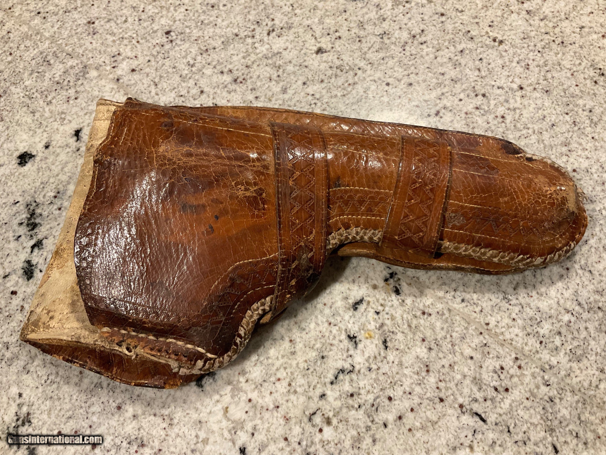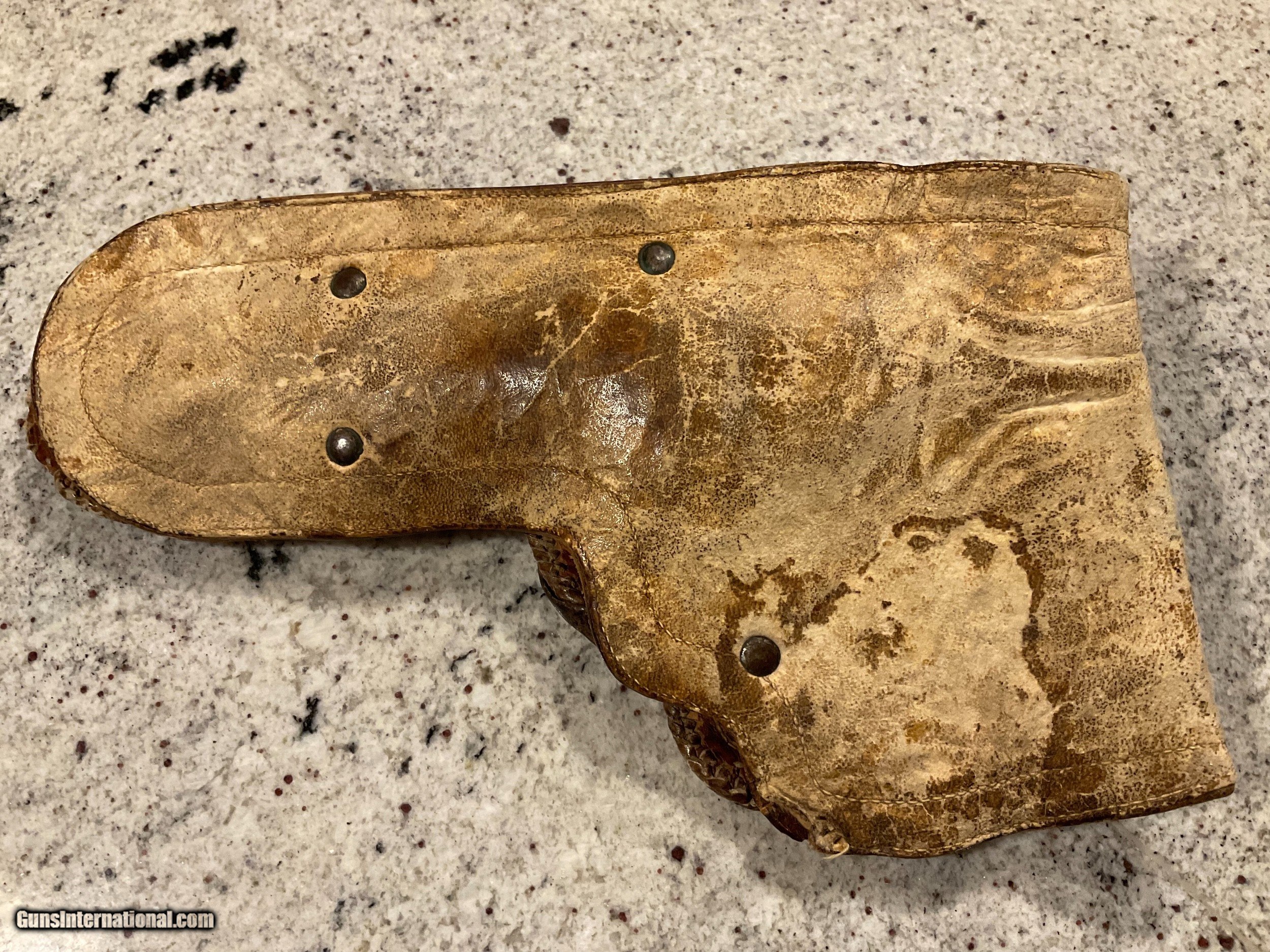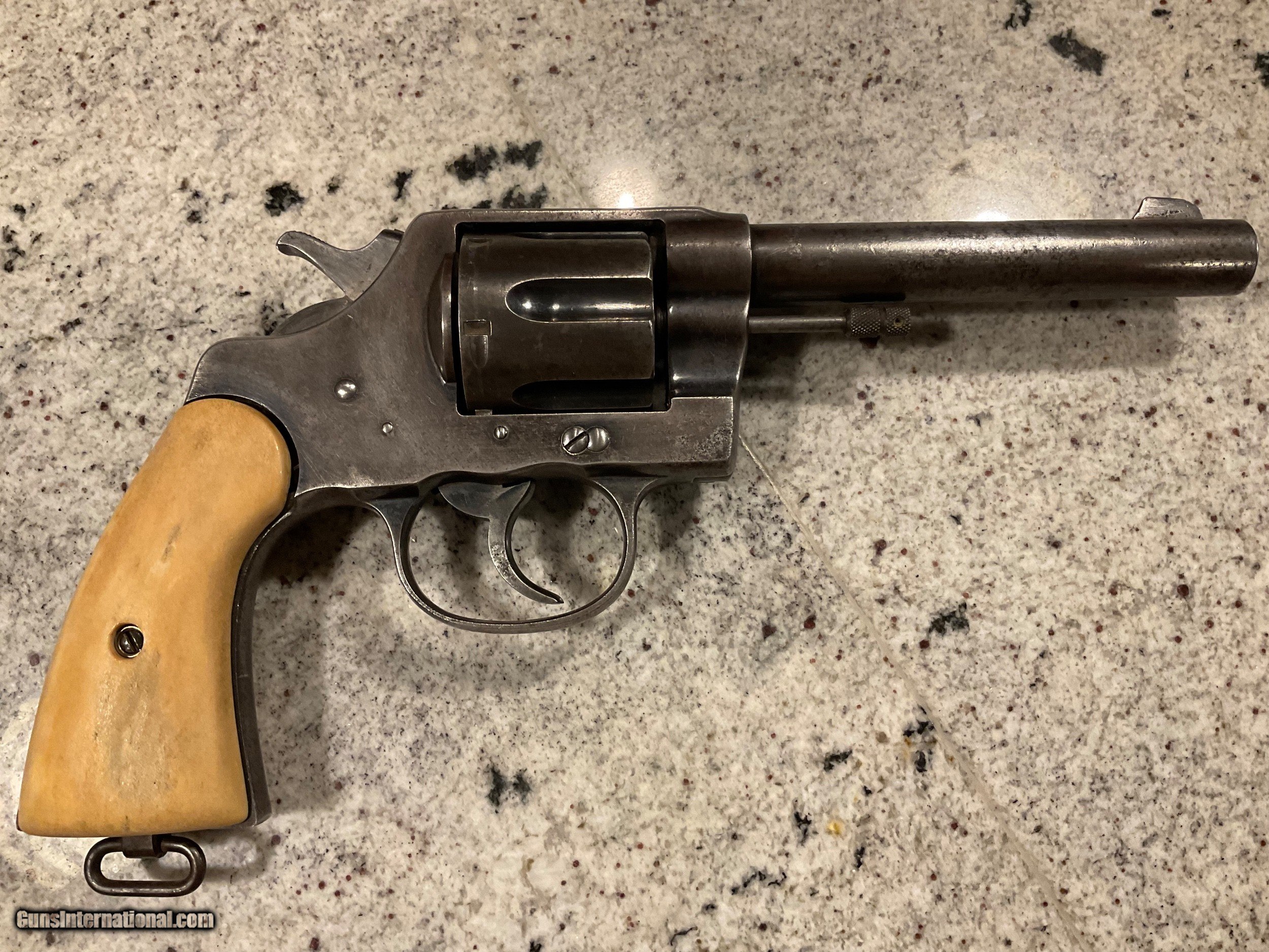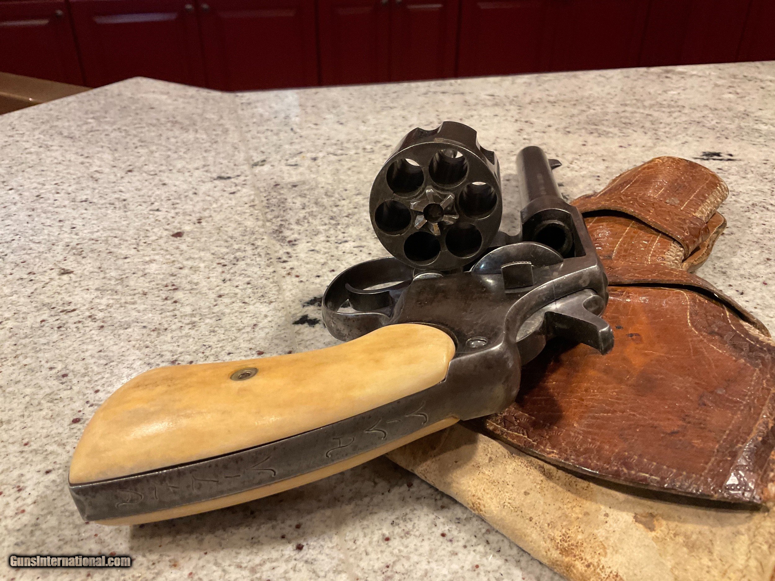 Description: SOLD THANKS GENE! Reduced price before going back in the safe!!!! $2,200. COLLECTORS/ STORE OWNERS *** YOU NEED THIS PISTOL FOR SHOW ! ! This pistol was manufactured no later than January 11, 1909, when it was shipped to a hardware store in St. Louis, Missouri by COLT. This is confirmed by the Colt Letter of Authenticity shown in photos. Everyone knows that St. Louis is "The Gateway To The West". PONCHO VILLA was a Mexican hero/villain depending on how you see him. A rogue Mexican General. Pancho, born in 1878 was assinated in 1923. He joined the Mexican Revolution in 1910 thru 1920 and for a few months between 1912 and 1913 was actually exiled to The United States. He made several trips to the US after his exile to meet with US Generals to get their support of his campaign's in Mexico. The reason for the history lesson is this. The back strap on this 1909 Colt .44-40 Revolver has an etched inscription "Viva Villa"! Now we can't say it belonged to Poncho. However, the life & time of this revolver is correct to have been owed by Poncho! The etching is not new. It has been on this gun forever. The holster is time correct and woven as Mexican holsters were made. Furthermore, who and for what reason would someone over the past 110 years make this etching to acknowledge/honor Villa unless he was the owner or the owner was a supporter?? In any event, this revolver is a piece of history and with more investigation could be a priceless artifact. "Poncho Villa lived by the pistol and died by it." El Passo Times July 21, 1923. PLACE THIS PISTOL IN YOUR COLLECTION OR STORE FRONT TO START CONVERSATIONS OR FOSTER SALES! Colt New Service .44-40 Revolver 5 1/2" Bbl Grips are made from bone Finish is a little thin in some areas Excellent bore Tight action Colt Factory Letter included Holster included Shipping/insurance to your FFL in lower 48 ($25) Price $2,700 (now $2,200) SOLD |