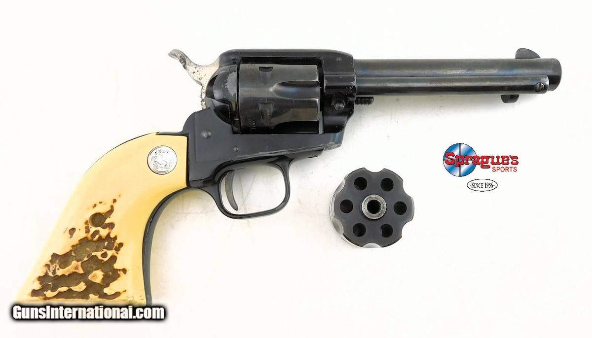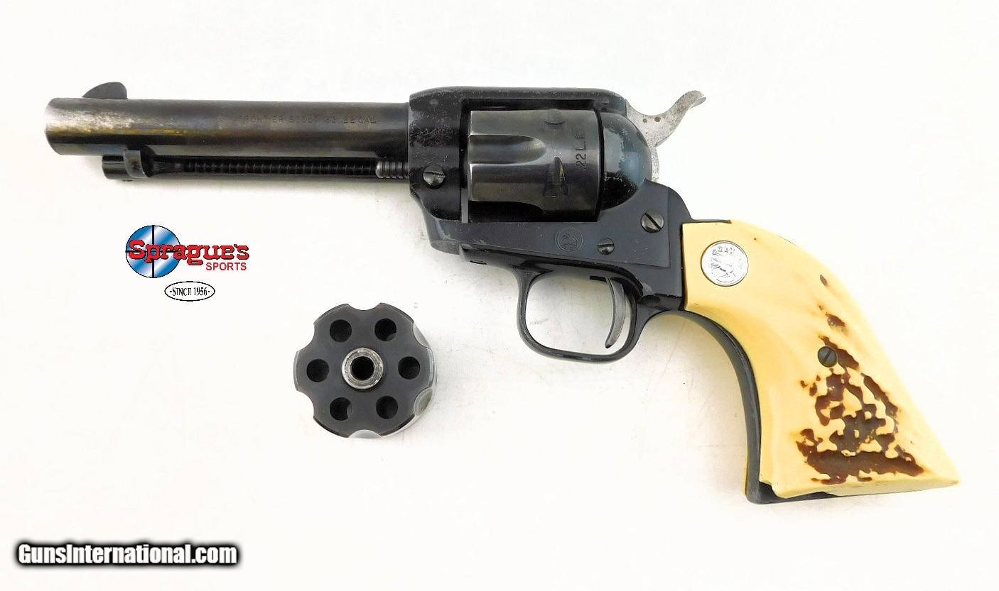 Description: Guns Listing ID: 332806 Colt Frontier Scout SA Revolver MFG 1965 Combination .22 LR - .22 Mag, 4 1/2" barrel, good bore, fixed sights, interchangeable cylinders, tight action, holster wear on barrel - frame, and Staglite grips with chip on bottom of left grip. This will be a fun addition to your next outing. SOLD Manufacturer: COLT RIMFIRE Model: Frontier Scout Caliber Info: .22 LR/.22 MAG Condition: Used - Non-Certified Barrels: 4.5 BARREL Finish: BLUED |