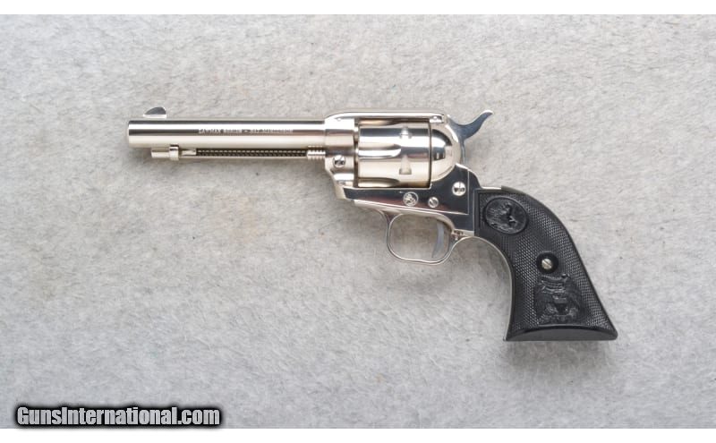 Description: This Colt Model Single Action Frontier Scout Lawman-Series Bat Masterson is a nickel plated 6 shot single action revolver in .22 Long Rifle Cal. It has a 4 5/8 inch barrel. A blade front sight and an integral notch rear sight. The grip is a checkered hard black plastic with an eagle with shield and the Colt horse logo. S/N 1346LM. Comes in a display case. .22 Long Rifle SOLD Chambers: 6 shot. Metal Condition: Excellent. Bore Condition: Excellent. Barrels: 4 5/8 inch nickel plated. Triggers: Single Action. Weight: 32 oz. Sights: Blade front. Integral notch rear. Item Location: Richfield, WI |