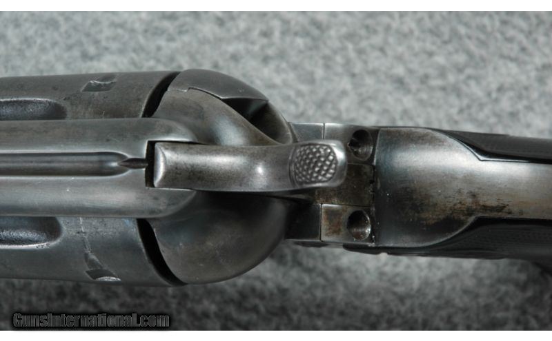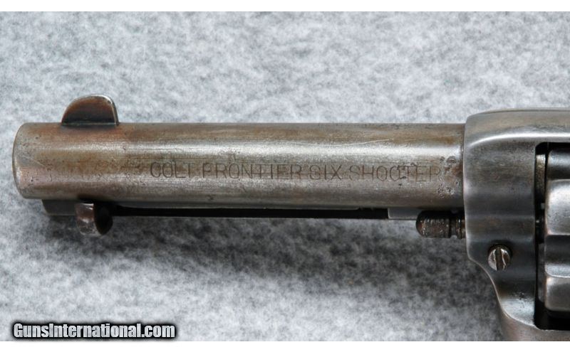 Description: Colt SAA Frontier Six Shooter .44-40 Win. This gun has the roll marked "Frontier Six Shooter". The bore is bright with good rifling, but does have a ring of corrosion from a stuck bullet. There is no bulge in the barrel. The cylinder ratchet appears in good shape and the timing is good. The cylinder lock appears to have some wear. Most of the screws have been boogered and the cylinder pin has been pliered. There is some external pitting on the barrel and the front of the frame. The frame has been wire brushed and we are not sure if it has been refinished as so little finish remains. The grips are worn , but not chipped or cracked. This gun appears to be all original parts. SOLD Manufacturer: 1901 Chambers: 6 Barrels: 4 3/4 Triggers: Single Action Narrow Stock: Colt Hard Rubber Butt Pad: Square Butt Weight: 2 Lbs., 6 Ozs. Sights: Blade & Notch Item Location: Woodbury, MN |