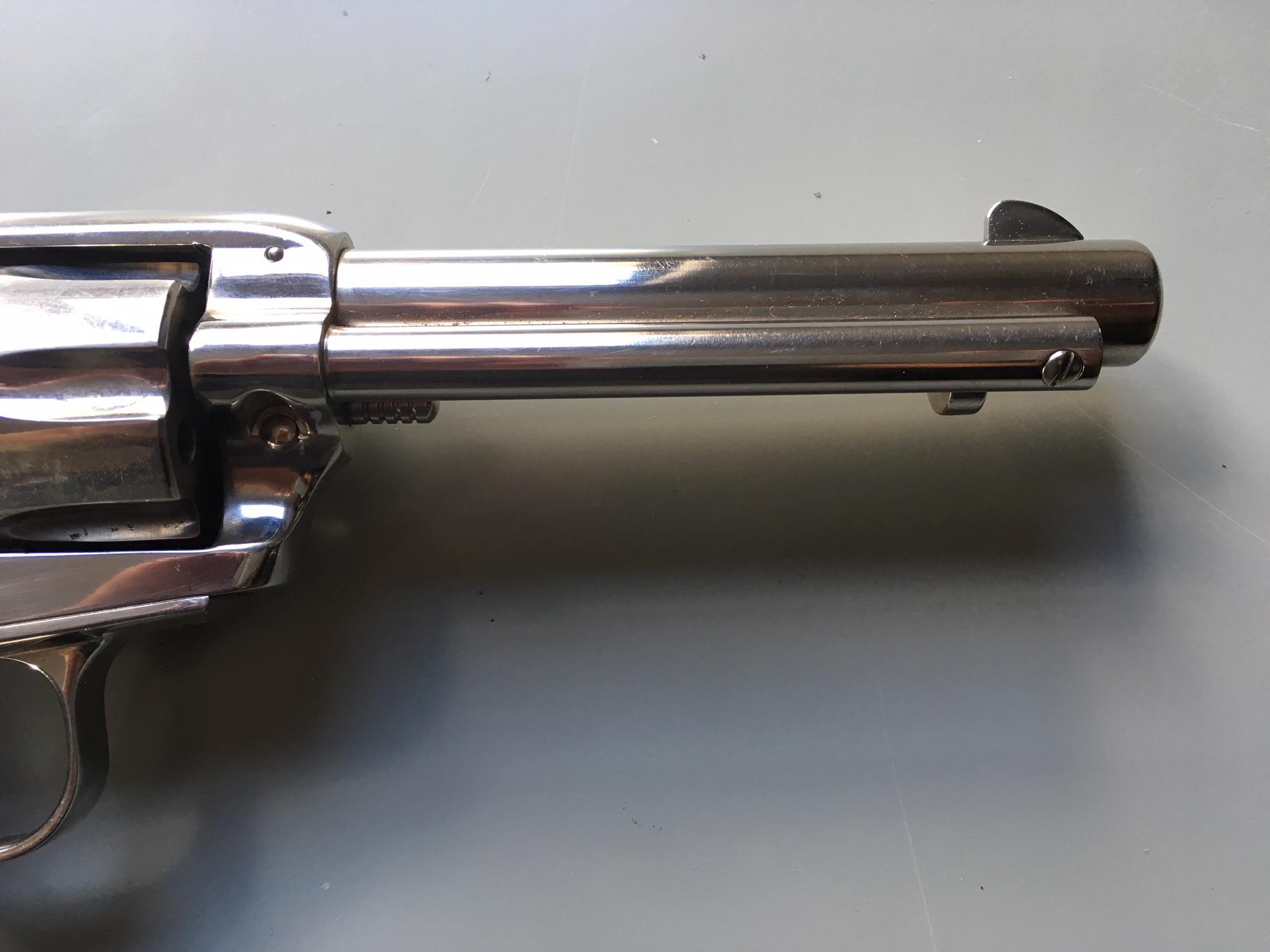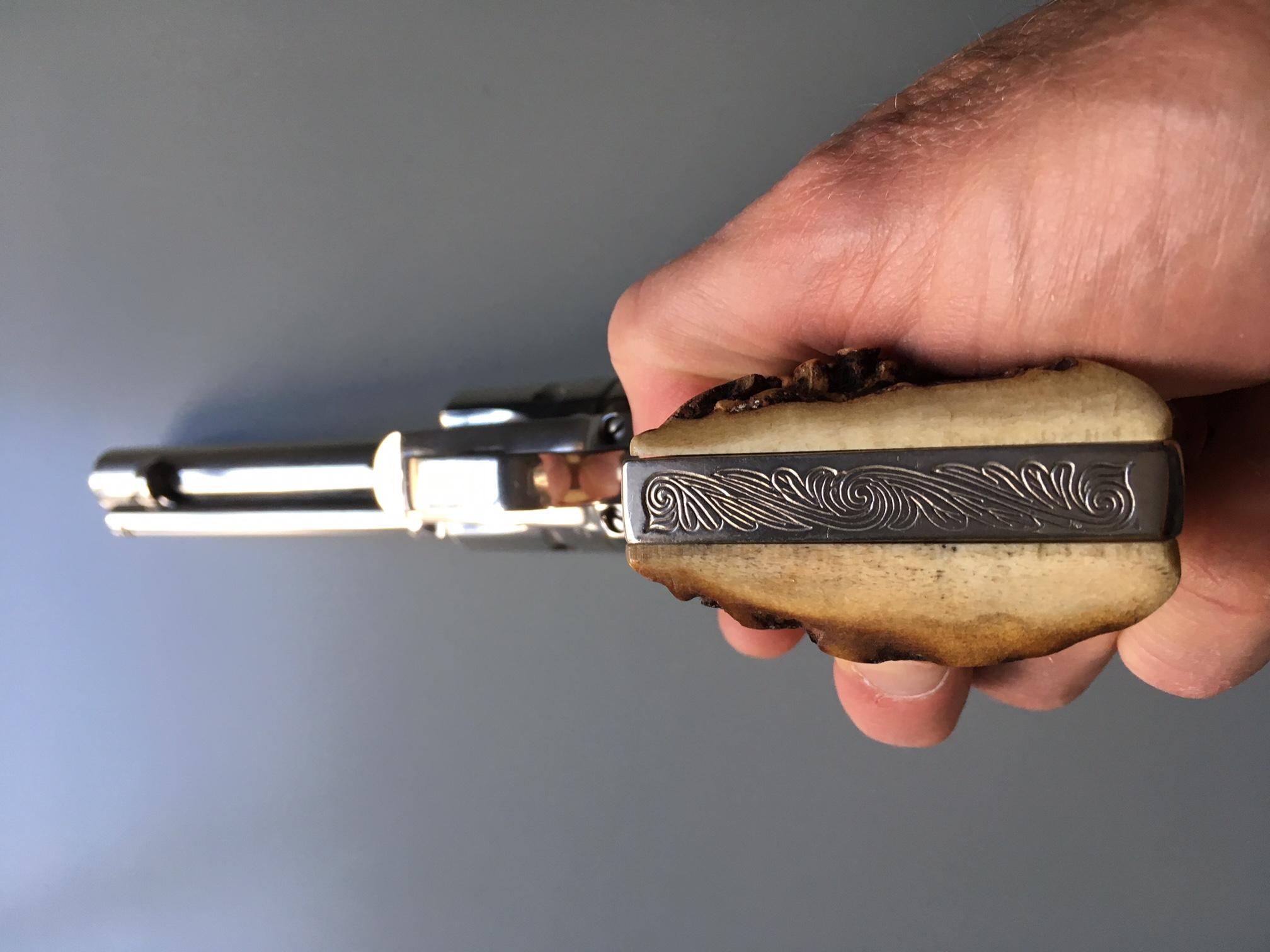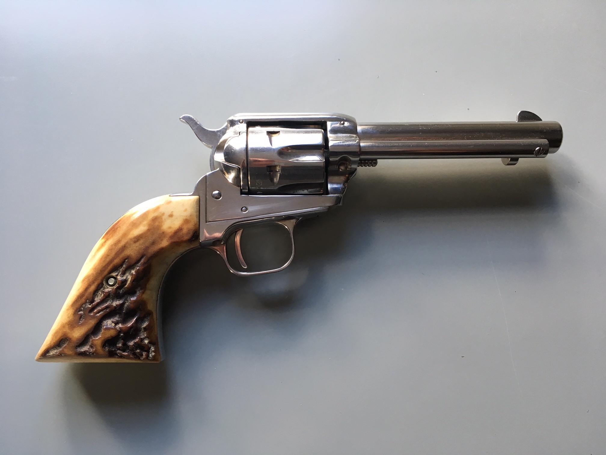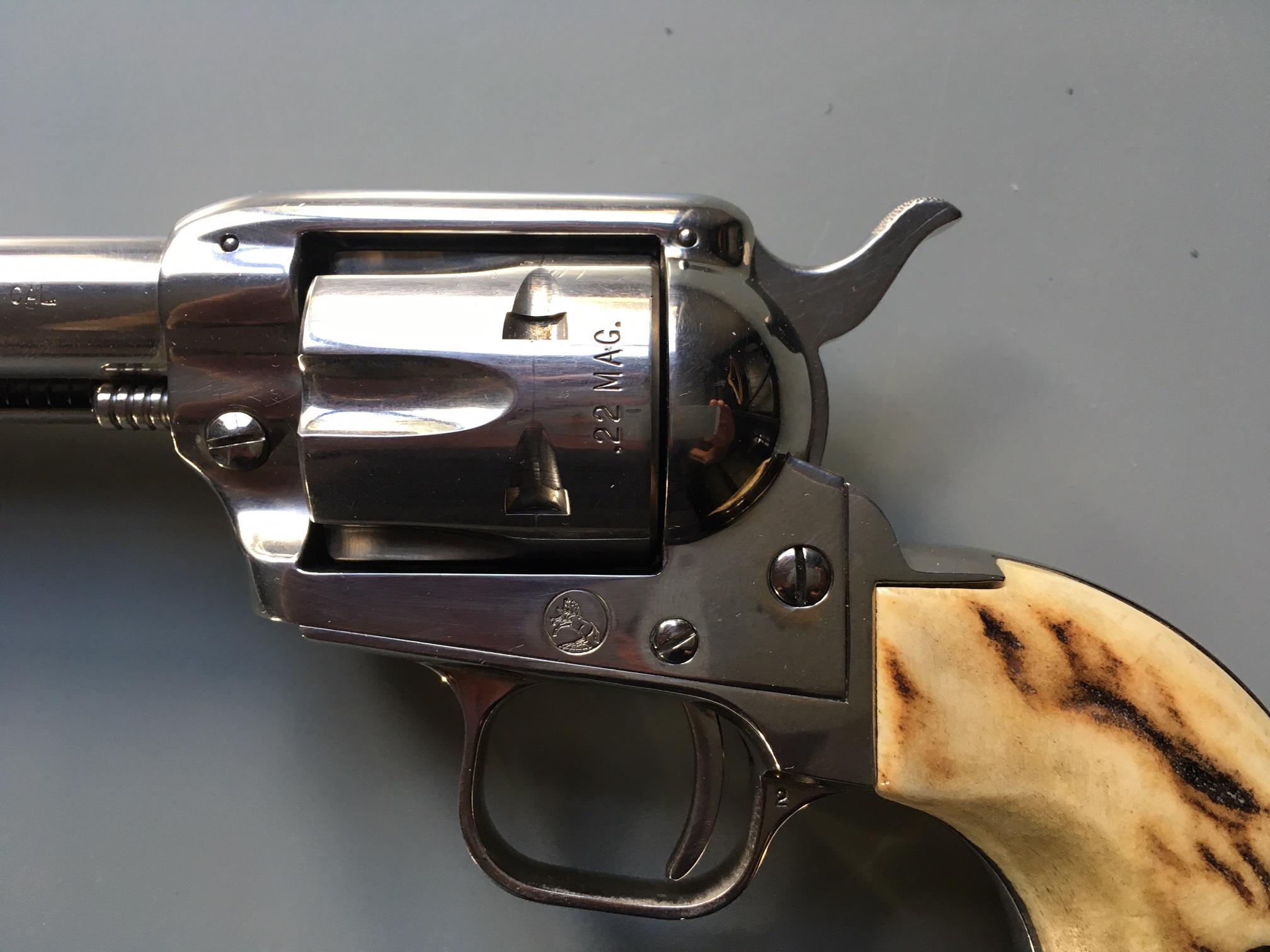 Description: Colt Frontier Scout single action revolver in .22LR with a second cylinder in .22 magnum. Barrel length is 4.75”. Manufactured in 1969. Excellent condition. Stag horn grips are in excellent condition. Includes the original box and instruction manual. SOLD Manufacturer: COLT’S PTFA MFG. CO. Hartford, Conn. Model: Frontier Scout Caliber Info: .22LR and .22 mag. Chambers: 6 Condition: Excellent Metal Condition: Excellent Bore Condition: Excellent Barrels: one Barrel Type: round Action: single action Triggers: one Sights: front Manufacture Date: 1969 Engraving: on the butt Extras: cylinder, set of grips Case: original box Item Location: Arizona |