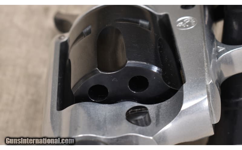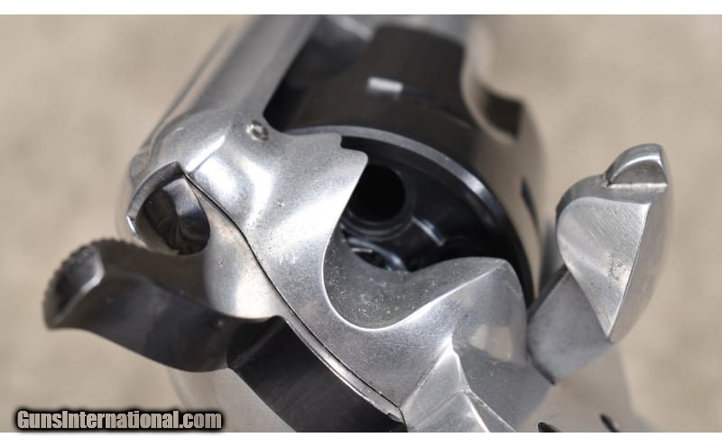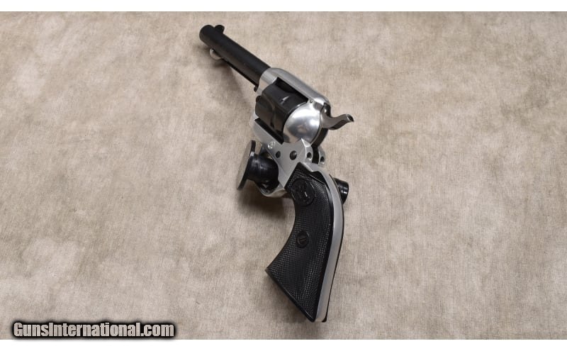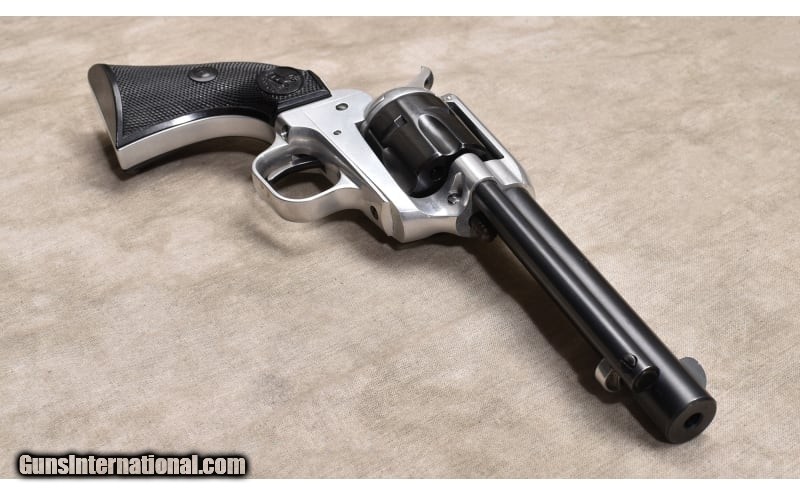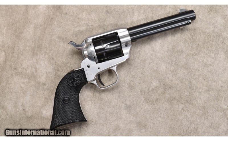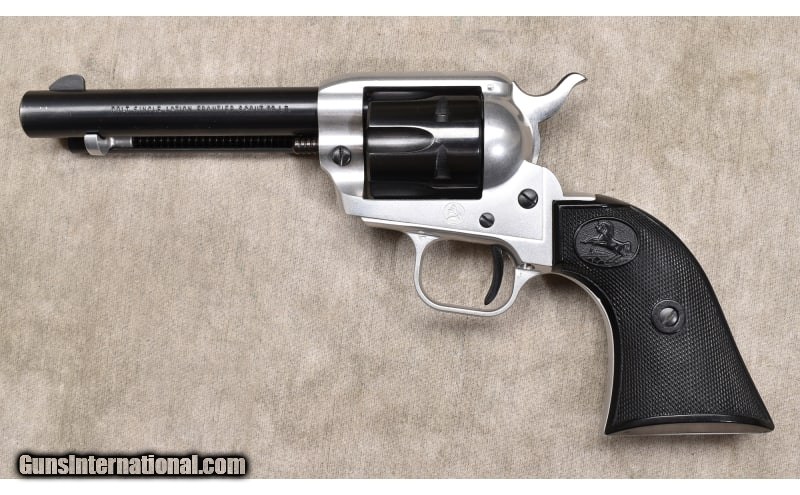 Description: This New Frontier dates to 1957 and doesn't appear to have been fired much, if at all. There is no turn line and the faces are clean. The revolver features blue steel barrel, cylinder, hammer, and trigger. The frame is 'in the white' aluminum. .22 Long Rifle SOLD Chambers: 6 rounds Metal Condition: "Very good. There is a little blue wear around the muzzle, and a couple of fine scratches on the aluminum frame. Wood Condition: Excellent. Bore Condition: Shiny and bright with crisp rifling. Barrels: 4-3/4 inch Triggers: Factory single action only Butt Pad: Black synthetic. Weight: 23 oz. Sights: Blade and top-strap groove. Item Location: Rogers |