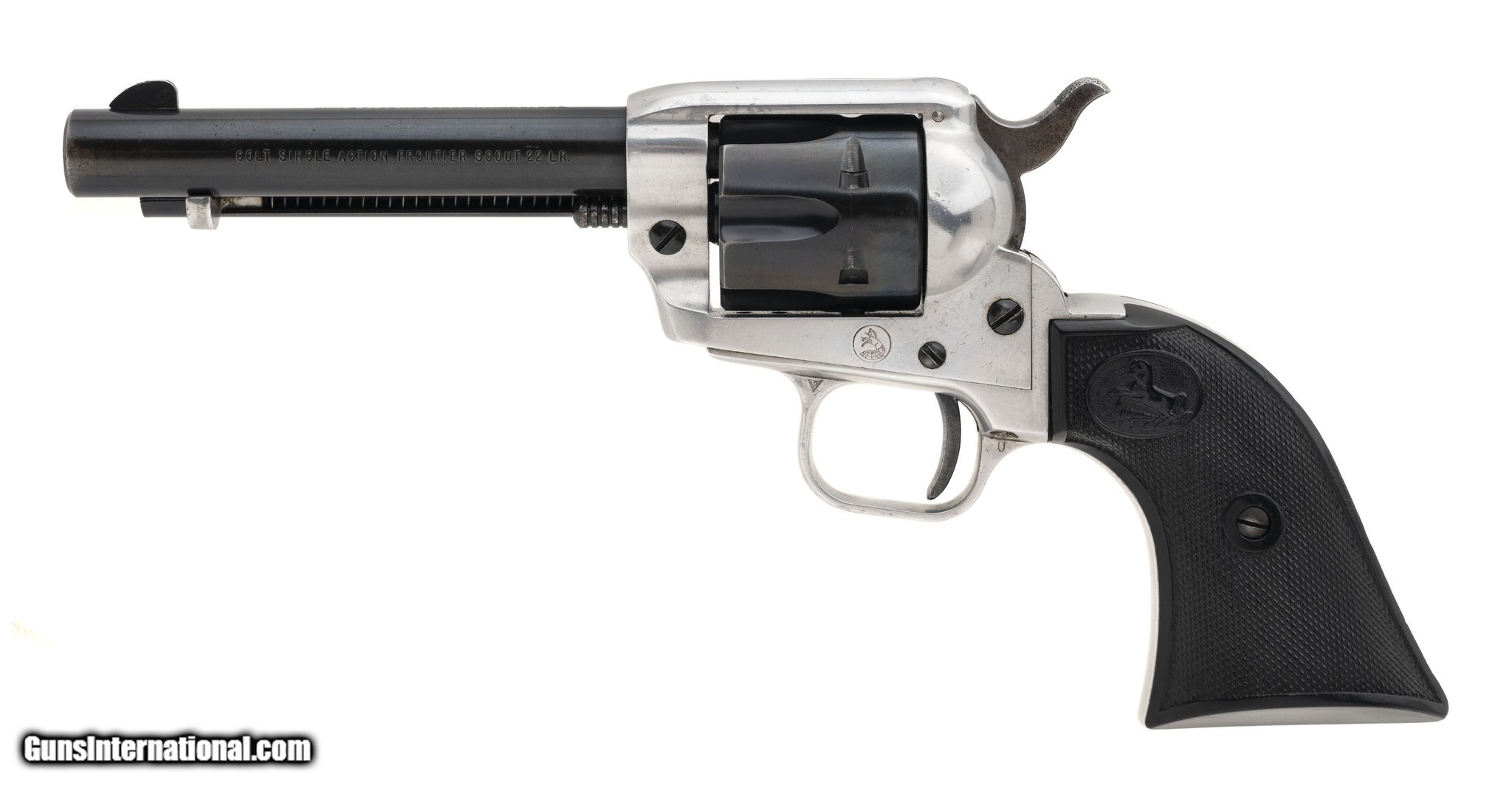 Description: Guns Listing ID: 510066 SN: 21425F. Made between 1958, .22 Long Rifle, 4.75\" barrel. Early aluminum frame two-tone rimfire revolver with 6rd cylinder. Barrel has 90% of its blue. Overall very good condition. (C18488) SOLD Manufacturer: COLT Model: SINGLE ACTION FRONTIER SCOUT Caliber Info: .22 LR Condition: Used - Non-Certified Barrels: 4.75 Action: REVOLVER Finish: two tone. black/silv |