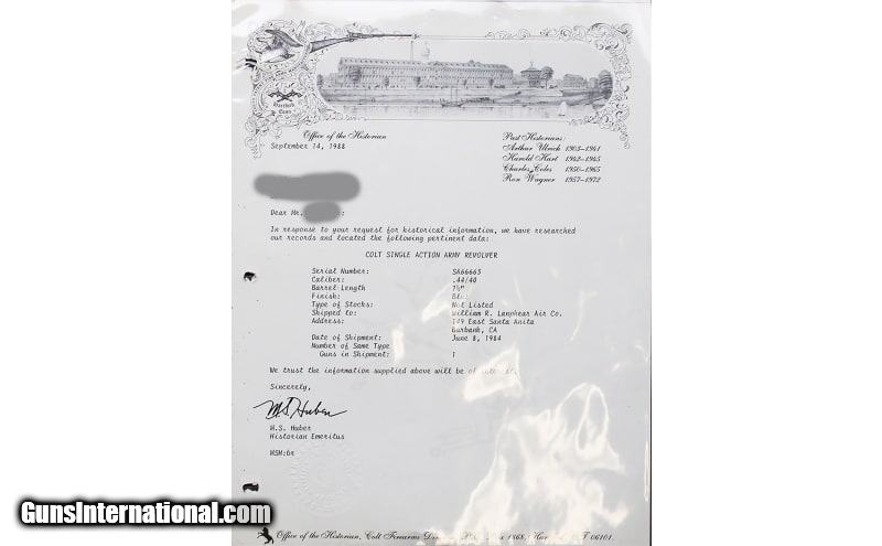 Description: Colt Black Powder Frame Third Generation Frontier Six Shooter Single Action Army revolver chambered in .44-40 Winchester. Comes with a factory letter confirming configuration and shipment to William R. Lanphear Air Company in Burbank, California on 8 June 1984. .44-40 Winchester SOLD Metal Condition: Very Good with Minor Handling Marks Wood Condition: Very Good with Minor Handling Marks Bore Condition: Bright And Clear with No Pitting Barrels: 7.5 inch Item Location: Fort Worth, TX |