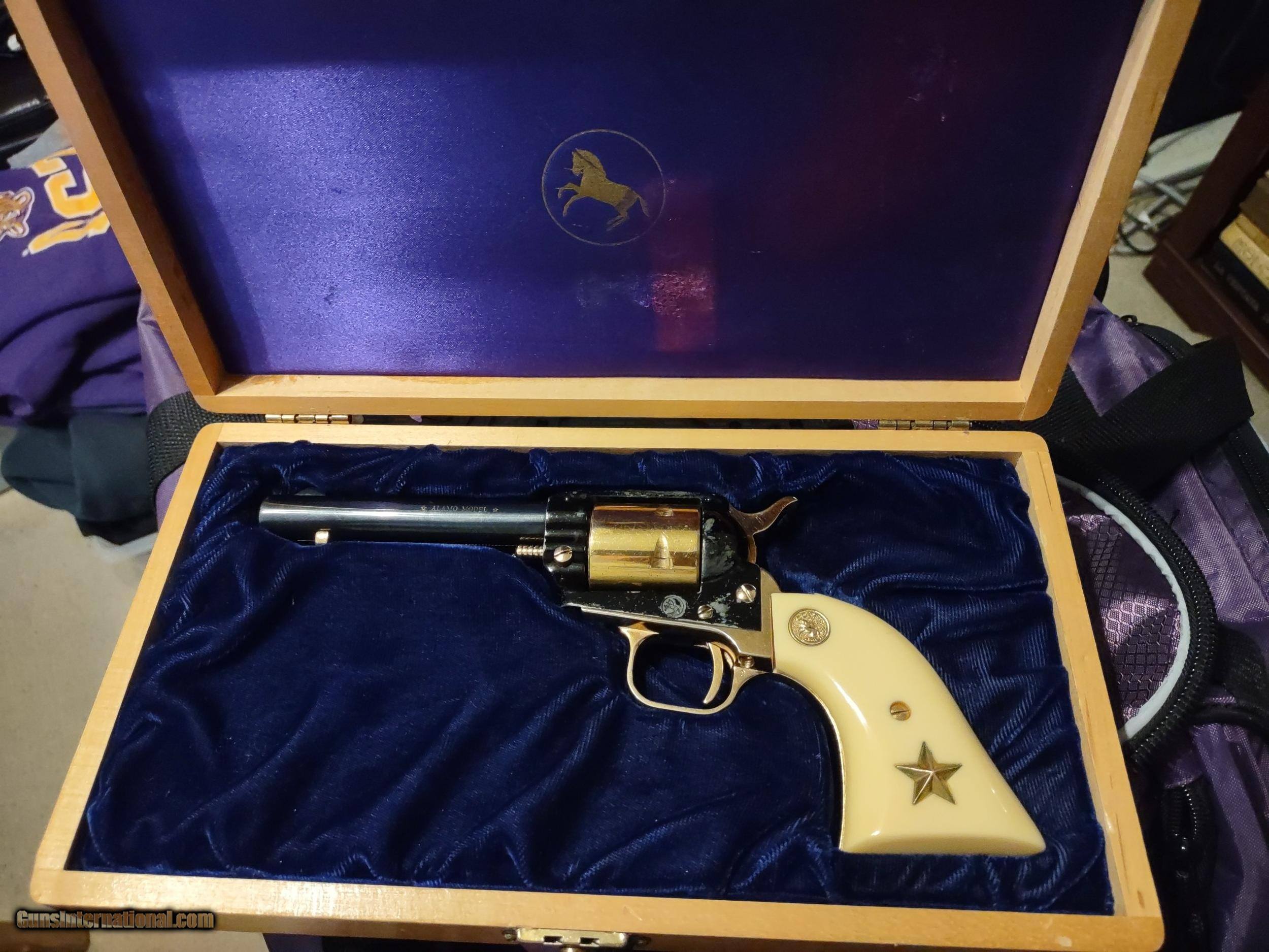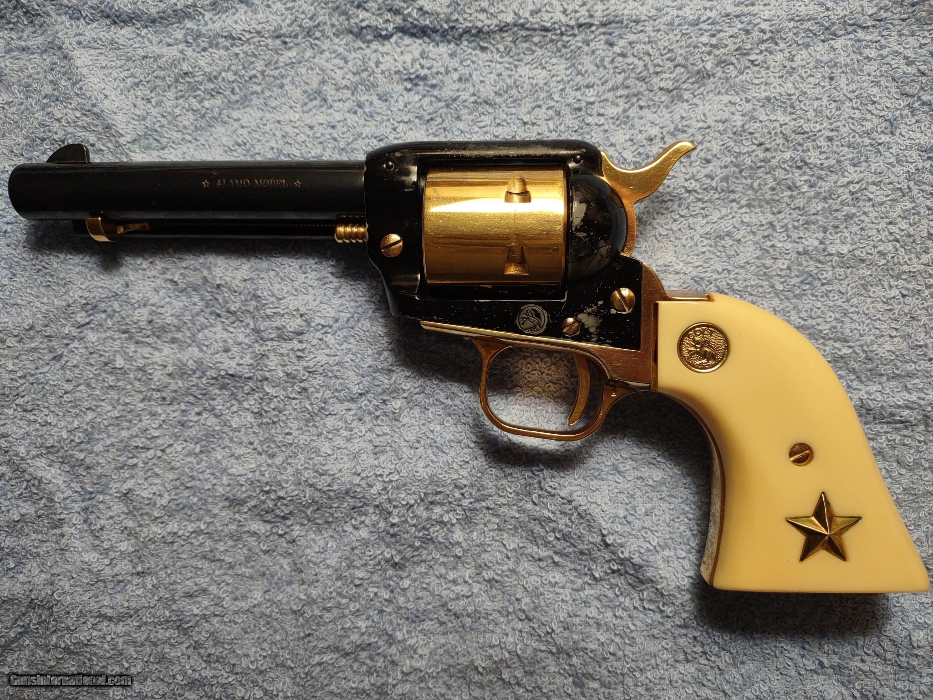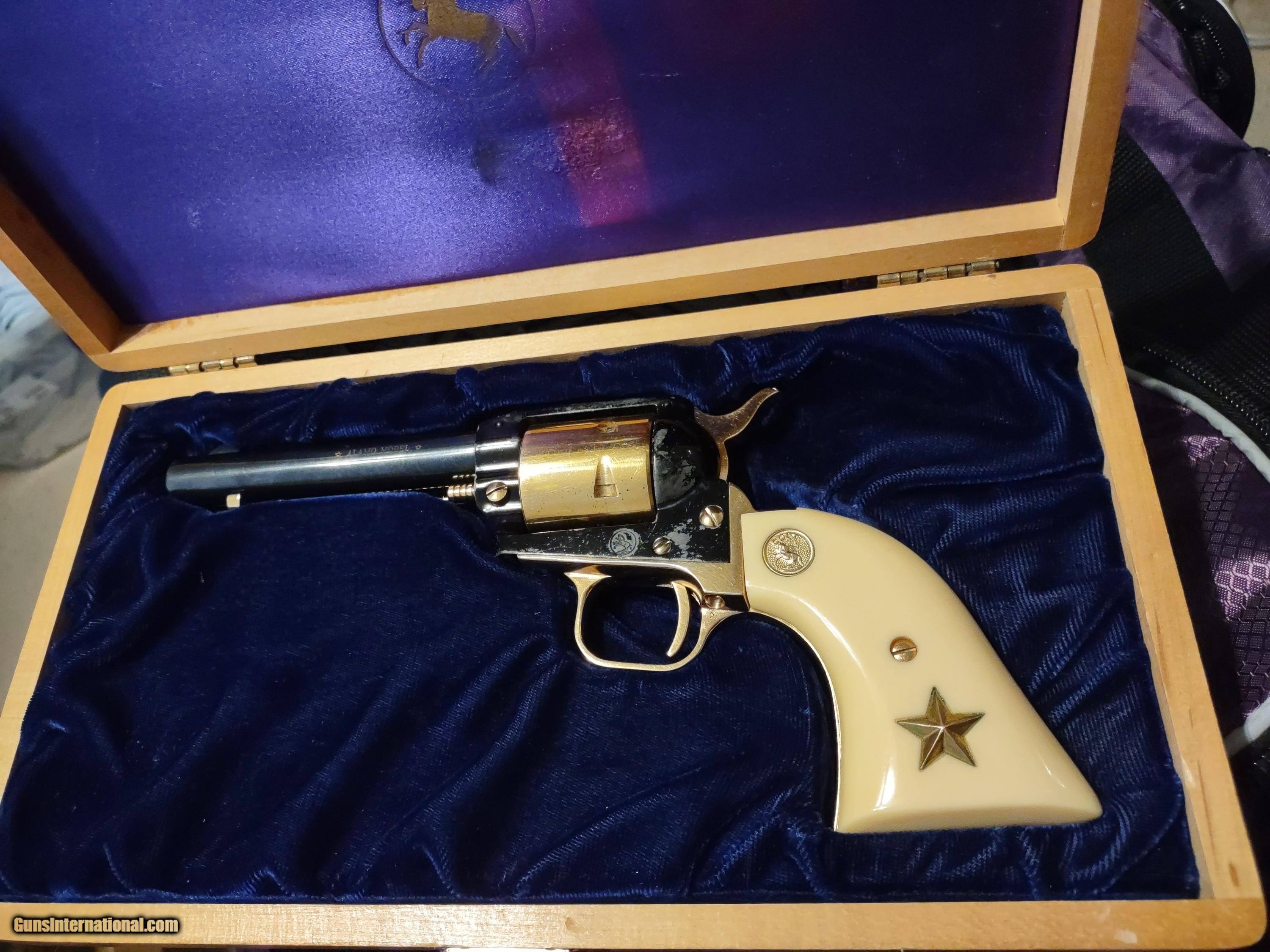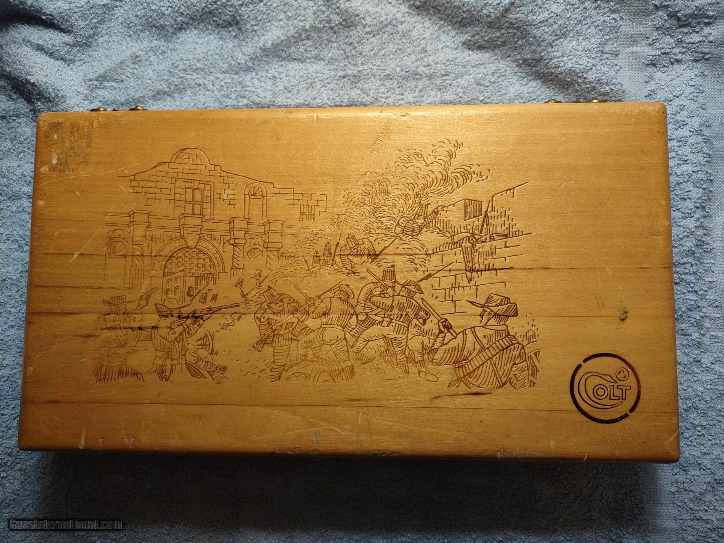 Description: COLT FRONTIER SCOUT ALAMO MODEL single action army in .22LR caliber, 6-shot revolver with gold plated parts, wooden display case with velvet lining and etchings depicting the fateful 13-day battle at the Alamo in San Antonio, Texas, March, 1836. This revolver commemorates that historic battle and pays tribute to the 200 men who perished including James Bowie, William B. Travis and Tennessee Congressman, David Crockett. The gun's function is perfect and the bore is bright and glossy, the barrel is 4 3/4", the cylinder has no cylinder line and the ivory-like grips are beautiful with Lone Star and Colt medallion. The bluing on the frame could be better but can easily be touched-up. (please see pictures for details). The serial number is 1279A22 and believed to have been made in 1966. The price is $800 including UPS shipping to the FFL dealer near you. Call or text me at 318-780-4242 if you are interested. SOLD Manufacturer: Colt Model: Frontier Scout Alamo Model Serial Number: 1279A22 Barrel Length: 4 3/4 Ejectors: Manual Condition: very good to excellent Metal Condition: very good to excellent Wood Condition: No wood Bore Condition: Perfect, glossy Barrel Type: Revolver Action: Single Triggers: single, gold Finish: Blu & gold plate Sights: Fixed, open Manufacture Date: 1966 Engraving: Bottom of butt Case: Wooden display case, Colt Item Location: Shreveport, Louisiana |