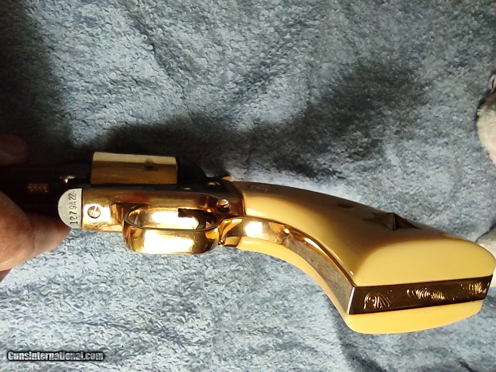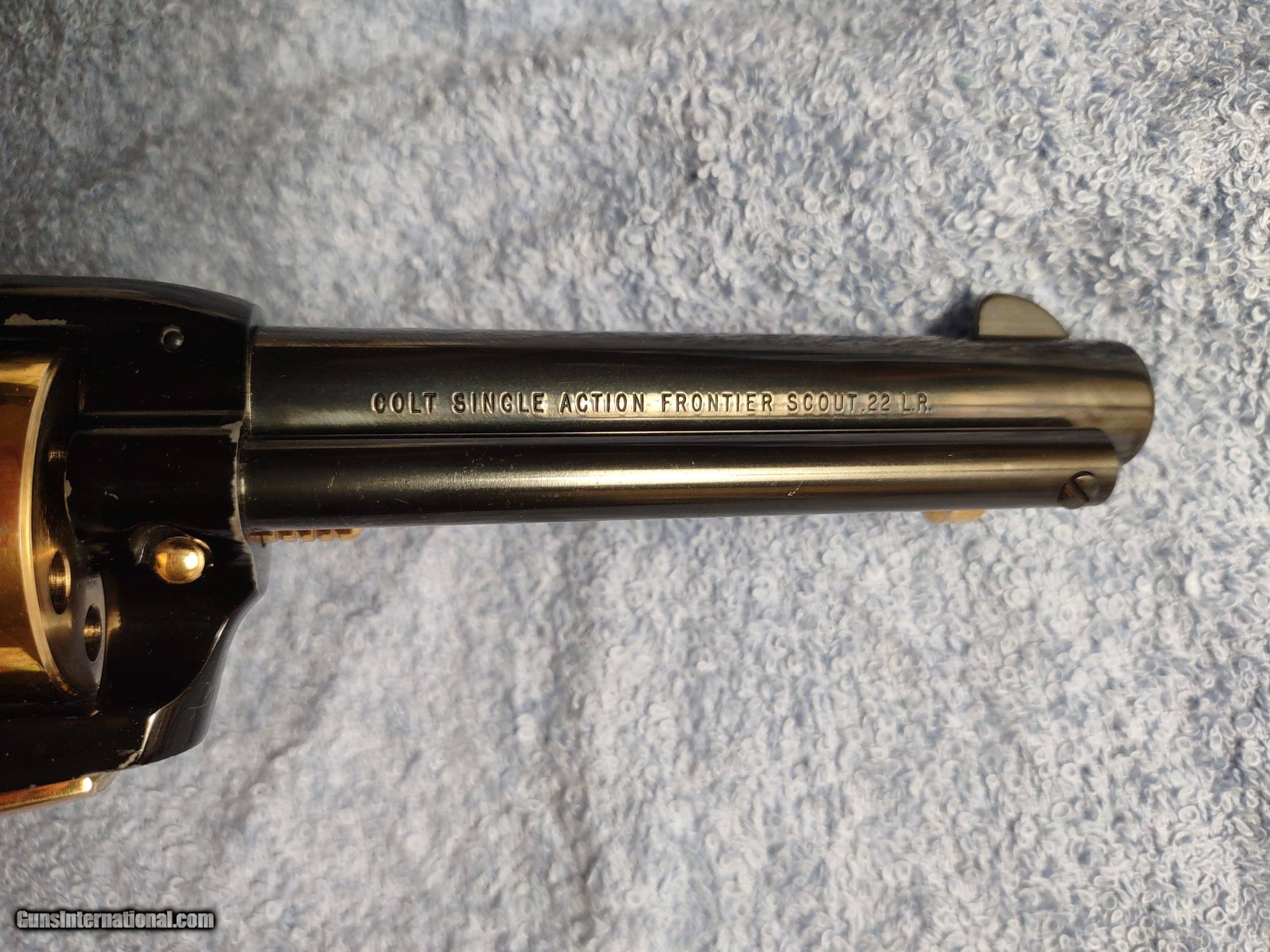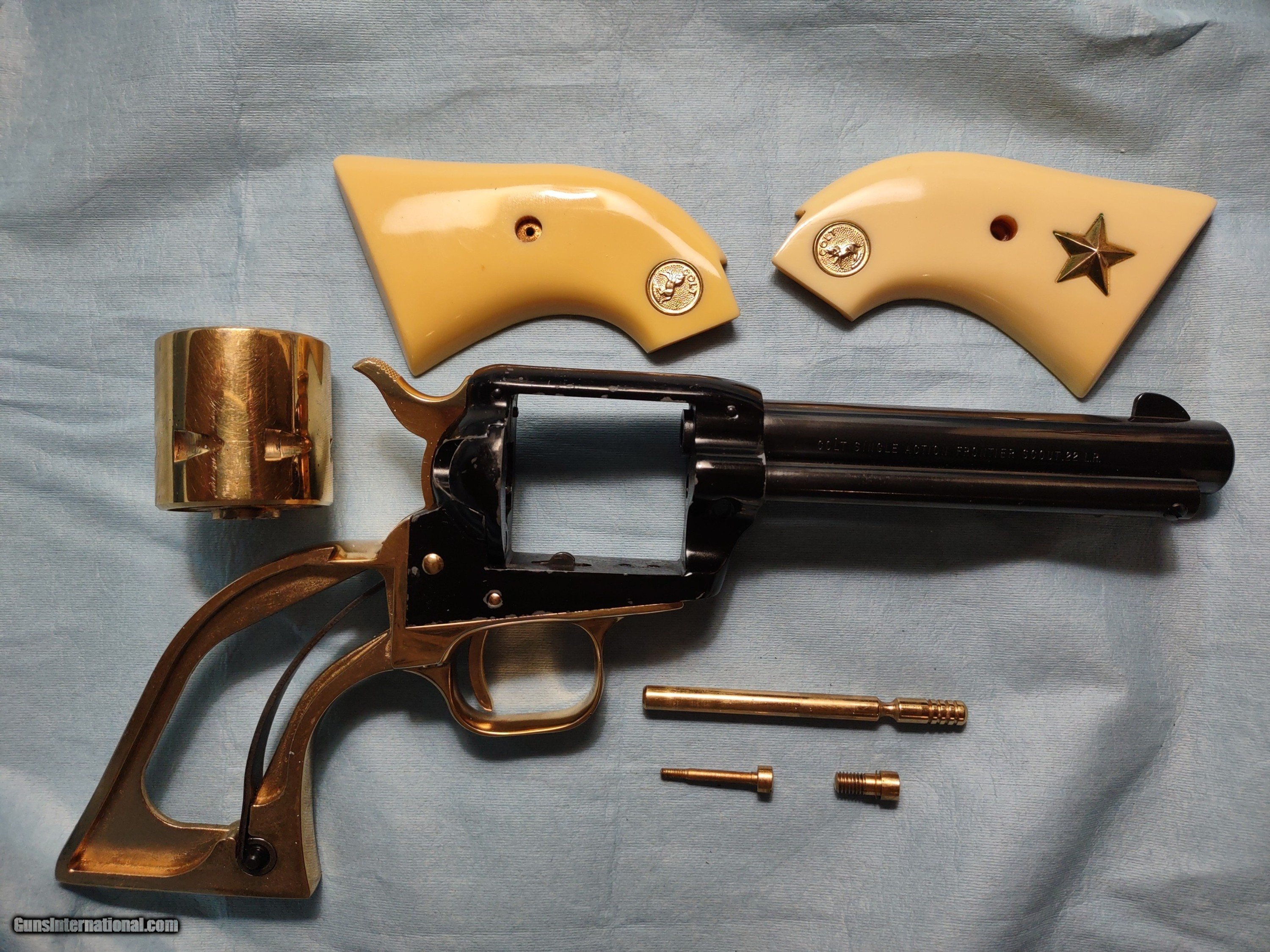 Description: COLT FRONTIER SCOUT ALAMO MODEL single action army in .22LR caliber, 6-shot revolver with gold plated parts, wooden display case with velvet lining and etchings depicting the fateful 13-day battle at the Alamo in San Antonio, Texas, March, 1836. This revolver commemorates that historic battle and pays tribute to the 200 men who perished including James Bowie, William B. Travis and Tennessee Congressman, David Crockett. The gun's function is perfect and the bore is bright and glossy, the barrel is 4 3/4", the cylinder has no cylinder line and the ivory-like grips are beautiful with Lone Star and Colt medallion. The bluing on the frame could be better but can easily be touched-up. (please see pictures for details). The serial number is 1279A22 and believed to have been made in 1966. The price is $800 including UPS shipping to the FFL dealer near you. Call or text me at 318-780-4242 if you are interested. SOLD Manufacturer: Colt Model: Frontier Scout Alamo Model Serial Number: 1279A22 Barrel Length: 4 3/4 Ejectors: Manual Condition: very good to excellent Metal Condition: very good to excellent Wood Condition: No wood Bore Condition: Perfect, glossy Barrel Type: Revolver Action: Single Triggers: single, gold Finish: Blu & gold plate Sights: Fixed, open Manufacture Date: 1966 Engraving: Bottom of butt Case: Wooden display case, Colt Item Location: Shreveport, Louisiana |