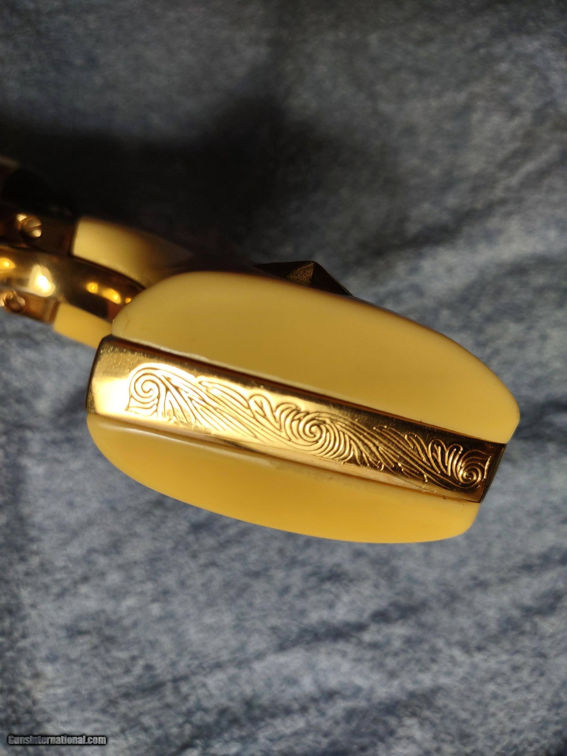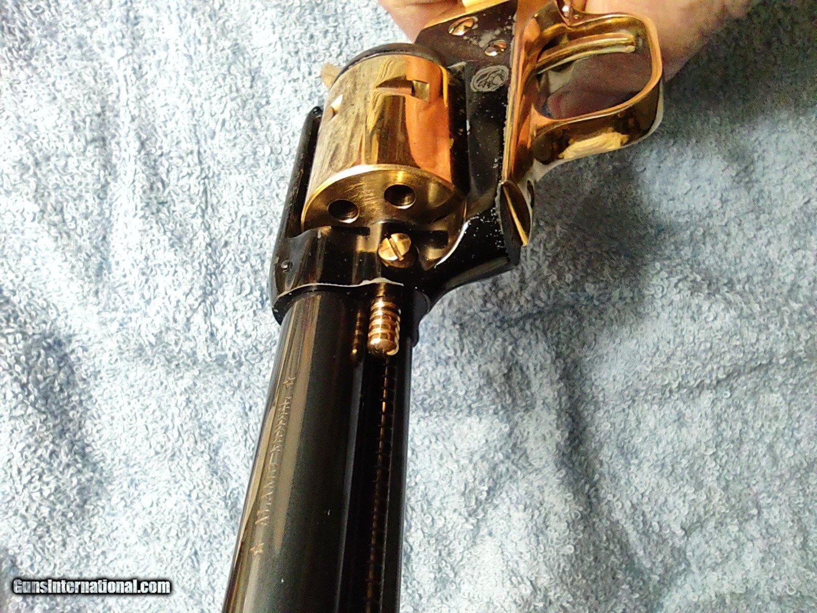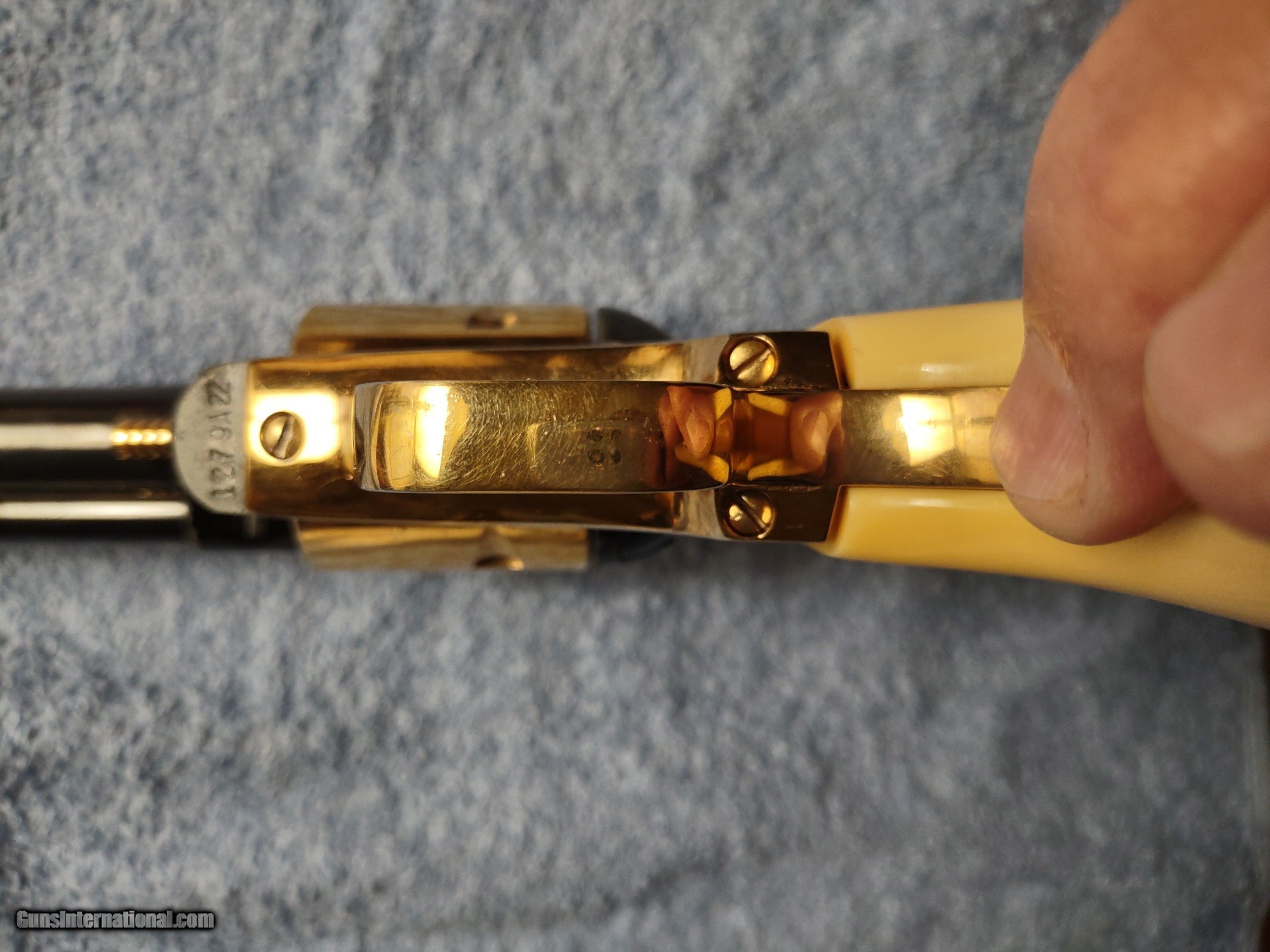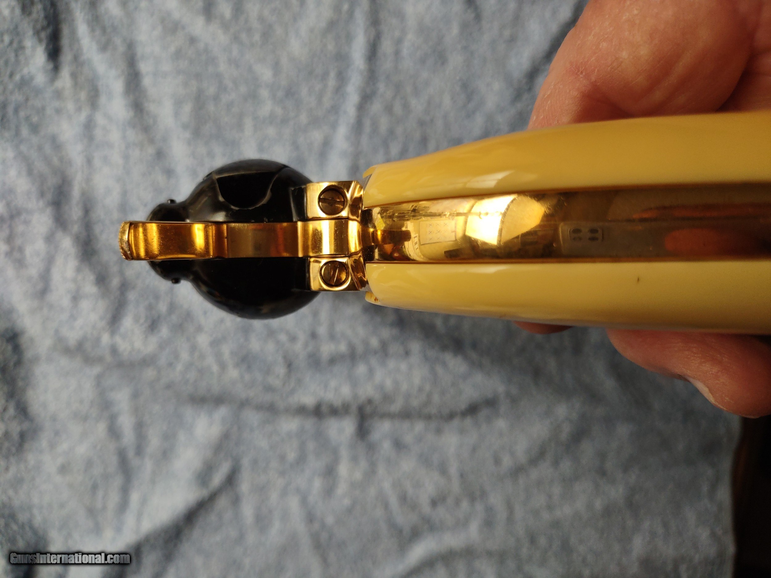 Description: COLT FRONTIER SCOUT ALAMO MODEL single action army in .22LR caliber, 6-shot revolver with gold plated parts, wooden display case with velvet lining and etchings depicting the fateful 13-day battle at the Alamo in San Antonio, Texas, March, 1836. This revolver commemorates that historic battle and pays tribute to the 200 men who perished including James Bowie, William B. Travis and Tennessee Congressman, David Crockett. The gun's function is perfect and the bore is bright and glossy, the barrel is 4 3/4", the cylinder has no cylinder line and the ivory-like grips are beautiful with Lone Star and Colt medallion. The bluing on the frame could be better but can easily be touched-up. (please see pictures for details). The serial number is 1279A22 and believed to have been made in 1966. The price is $800 including UPS shipping to the FFL dealer near you. Call or text me at 318-780-4242 if you are interested. SOLD Manufacturer: Colt Model: Frontier Scout Alamo Model Serial Number: 1279A22 Barrel Length: 4 3/4 Ejectors: Manual Condition: very good to excellent Metal Condition: very good to excellent Wood Condition: No wood Bore Condition: Perfect, glossy Barrel Type: Revolver Action: Single Triggers: single, gold Finish: Blu & gold plate Sights: Fixed, open Manufacture Date: 1966 Engraving: Bottom of butt Case: Wooden display case, Colt Item Location: Shreveport, Louisiana |