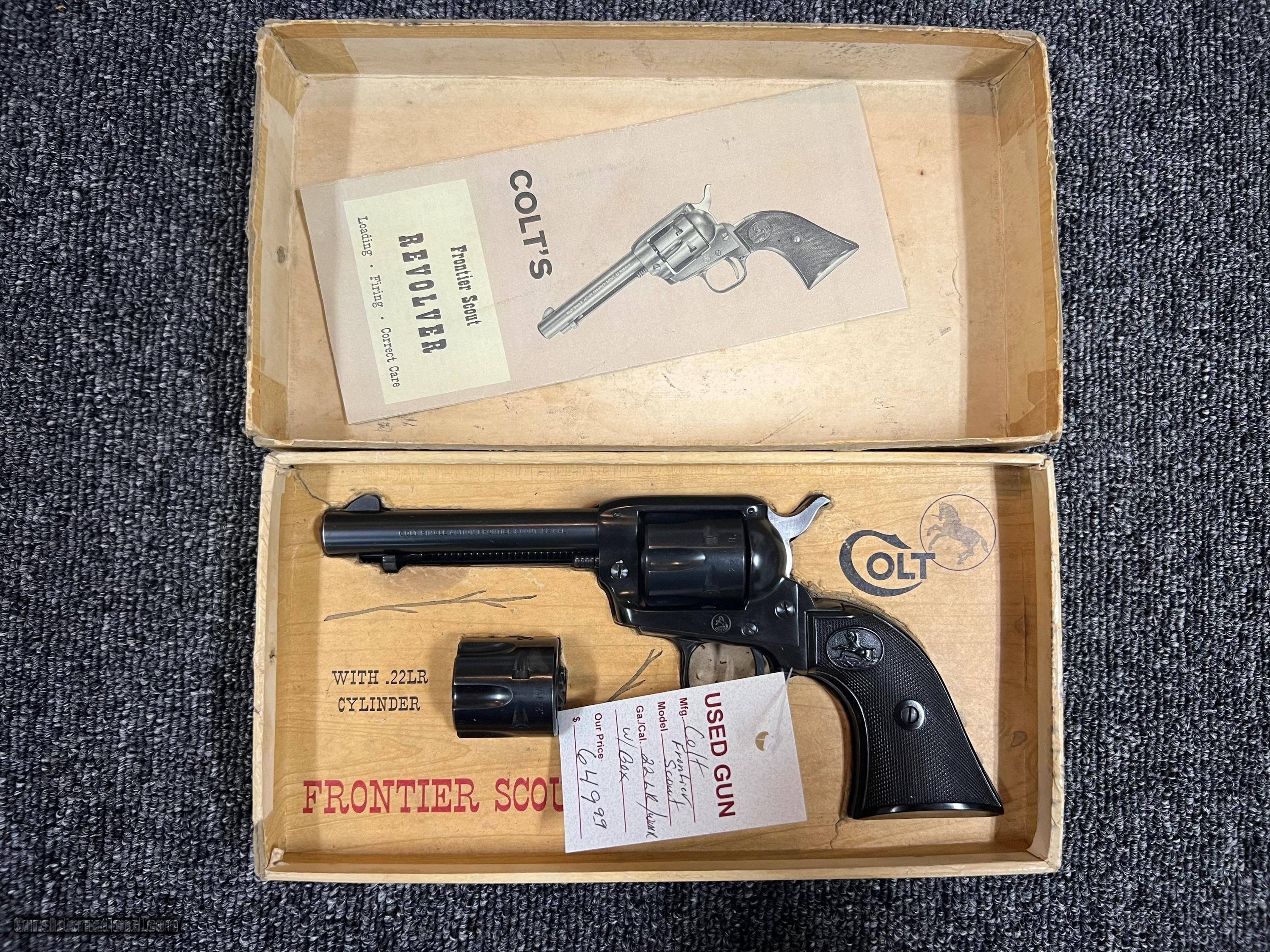Description: Colt frontier scout with both .22lr and .22wmr cylinders. This comes with original factory box. Gun in like new condition. 4.75" barrel. SOLD Handgun Caliber: .22 Long Rifle, .22 WMR (.22 Magnum) Manufacturer: Colt Model: Frontier scout |