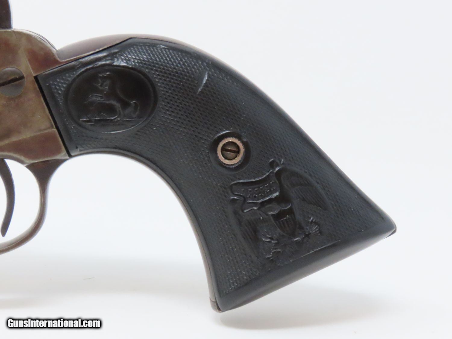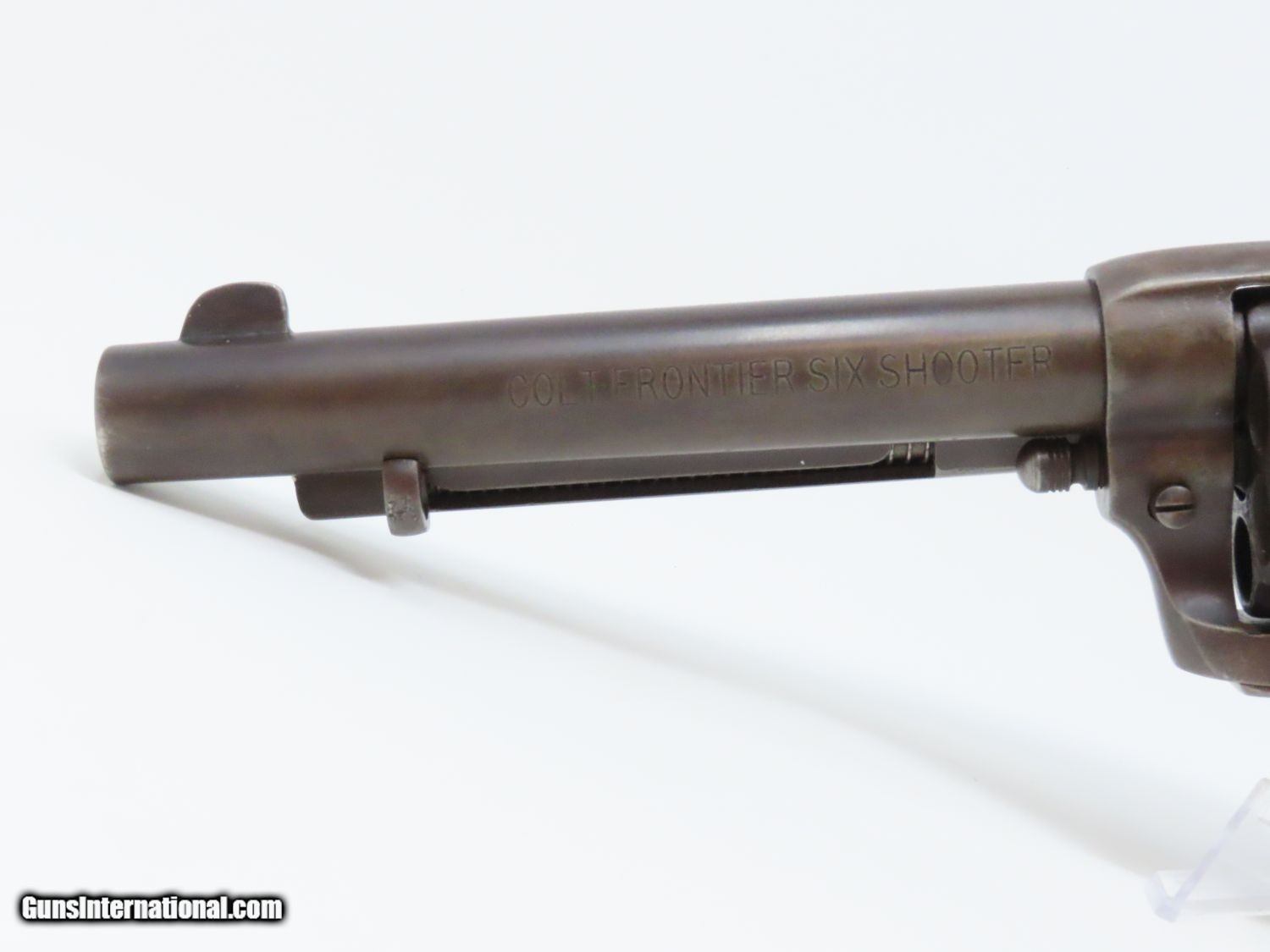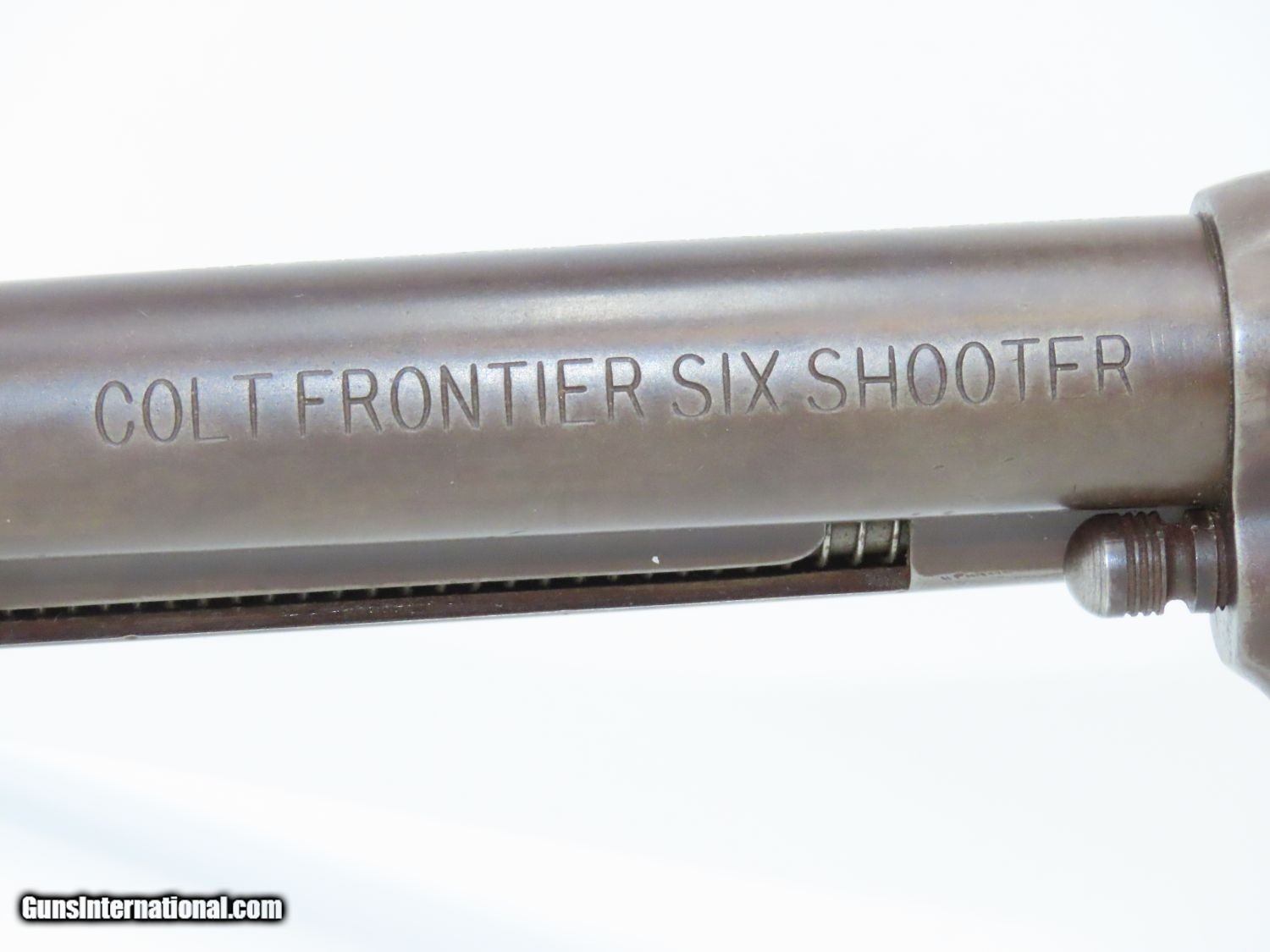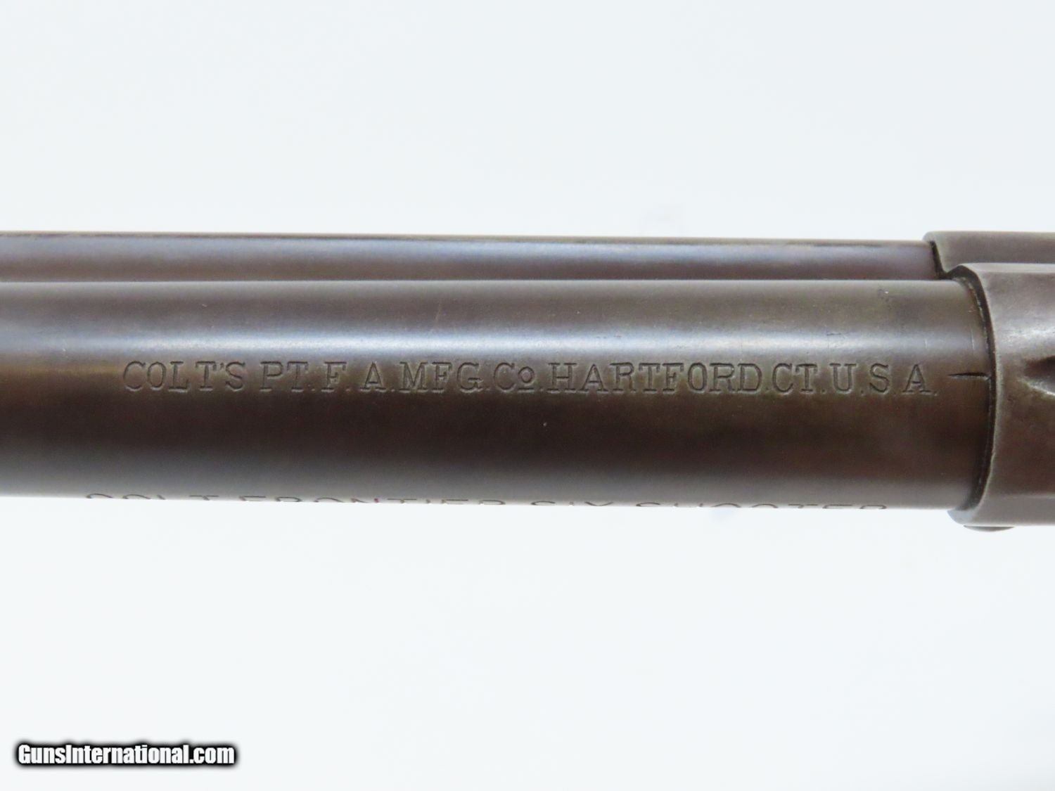 Description: SAN FRANCISCO Lettered Antique COLT FRONTIER SIX-SHOOTER 44-40 WCF Revolver Western Shipped 1898 Colt FRONTIER .44-40 Here we present an antique Colt Frontier Six-Shooter Model 1873 Revolver in .44-40 Winchester Center Fire, manufactured in 1898 in Hartford, Connecticut. The included factory letter confirms the current configuration as well as shipment to Colt's Patent Fire Arms Co. in San Francisco on January 10, 1898. The Colt Frontier or Frontier Six-Shooter was Colt's Model 1873 revolver manufactured in .44-40 Winchester caliber instead of .45 so that it was compatible with Winchester’s Model 1873 ammunition. Production began in 1877. “Colt Frontier Six-Shooter” was the actual name of the Colt pistol model, and this was acid-etched on the left side of the barrel. After 1889, the legend was roll-stamped until 1919, when the caliber designation ".44-40" was added. Though Colt enjoyed the largest contracts of any handgun maker during the American Civil War, it had to rely on its array of percussion fired revolvers, namely the 1860 Army until the Smith & Wesson owned Rollin White Patent expired in 1869. This enabled them to begin making revolvers with completely bored through cylinder chambers in order to utilize modern metallic cartridge ammunition in the most effective manner. In 1869, Colt began development of a suitable cartridge revolver in earnest, first coming out with a number of conversions for their percussion lines, until 1872 when they debuted what was to become the Colt Model 1873 Single Action Army in the 1872 U.S. Trials. Needless to say, it won, and became the Army’s revolver of choice. It also became the sidearm of choice for many others like cowboys, guards, lawmen, crooks, shopkeepers and all manner of civilians. The overall condition is very good. The action is strong and crisp. The bore is in good shape with strong rifling. The finish has matured to smooth dark brown patina. Both sides of the grips feature a federal eagle. Here is a hard to come by factory lettered first generation Colt Frontier! Own the original! This is a legitimate antique and not a reproduction. Barrel is 5-1/2 inches. Caliber: .44-40 WCF Overall condition as seen in photos. Very Fast. Very Safe. FREE SHIPPING WORLDWIDE. Delivered directly to your door by express mail! Guaranteed AUTHENTIC & Includes CERTIFICATE OF AUTHENTICITY. ancestryguns $5595 #20610 SOLD Antique: Yes |