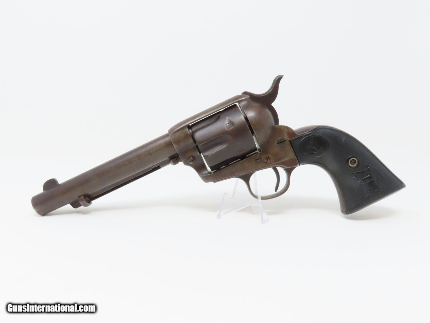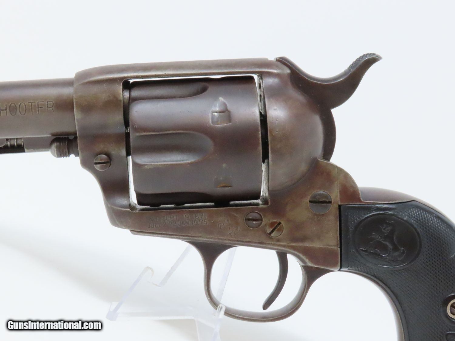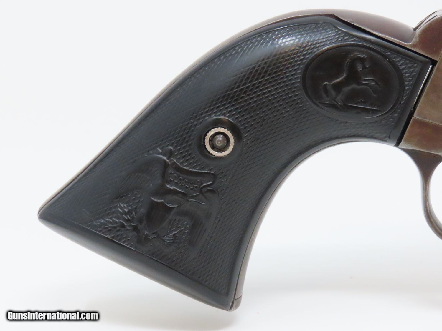 Description: SAN FRANCISCO Lettered Antique COLT FRONTIER SIX-SHOOTER 44-40 WCF Revolver Western Shipped 1898 Colt FRONTIER .44-40 Here we present an antique Colt Frontier Six-Shooter Model 1873 Revolver in .44-40 Winchester Center Fire, manufactured in 1898 in Hartford, Connecticut. The included factory letter confirms the current configuration as well as shipment to Colt's Patent Fire Arms Co. in San Francisco on January 10, 1898. The Colt Frontier or Frontier Six-Shooter was Colt's Model 1873 revolver manufactured in .44-40 Winchester caliber instead of .45 so that it was compatible with Winchester’s Model 1873 ammunition. Production began in 1877. “Colt Frontier Six-Shooter” was the actual name of the Colt pistol model, and this was acid-etched on the left side of the barrel. After 1889, the legend was roll-stamped until 1919, when the caliber designation ".44-40" was added. Though Colt enjoyed the largest contracts of any handgun maker during the American Civil War, it had to rely on its array of percussion fired revolvers, namely the 1860 Army until the Smith & Wesson owned Rollin White Patent expired in 1869. This enabled them to begin making revolvers with completely bored through cylinder chambers in order to utilize modern metallic cartridge ammunition in the most effective manner. In 1869, Colt began development of a suitable cartridge revolver in earnest, first coming out with a number of conversions for their percussion lines, until 1872 when they debuted what was to become the Colt Model 1873 Single Action Army in the 1872 U.S. Trials. Needless to say, it won, and became the Army’s revolver of choice. It also became the sidearm of choice for many others like cowboys, guards, lawmen, crooks, shopkeepers and all manner of civilians. The overall condition is very good. The action is strong and crisp. The bore is in good shape with strong rifling. The finish has matured to smooth dark brown patina. Both sides of the grips feature a federal eagle. Here is a hard to come by factory lettered first generation Colt Frontier! Own the original! This is a legitimate antique and not a reproduction. Barrel is 5-1/2 inches. Caliber: .44-40 WCF Overall condition as seen in photos. Very Fast. Very Safe. FREE SHIPPING WORLDWIDE. Delivered directly to your door by express mail! Guaranteed AUTHENTIC & Includes CERTIFICATE OF AUTHENTICITY. ancestryguns $5595 #20610 SOLD Antique: Yes |