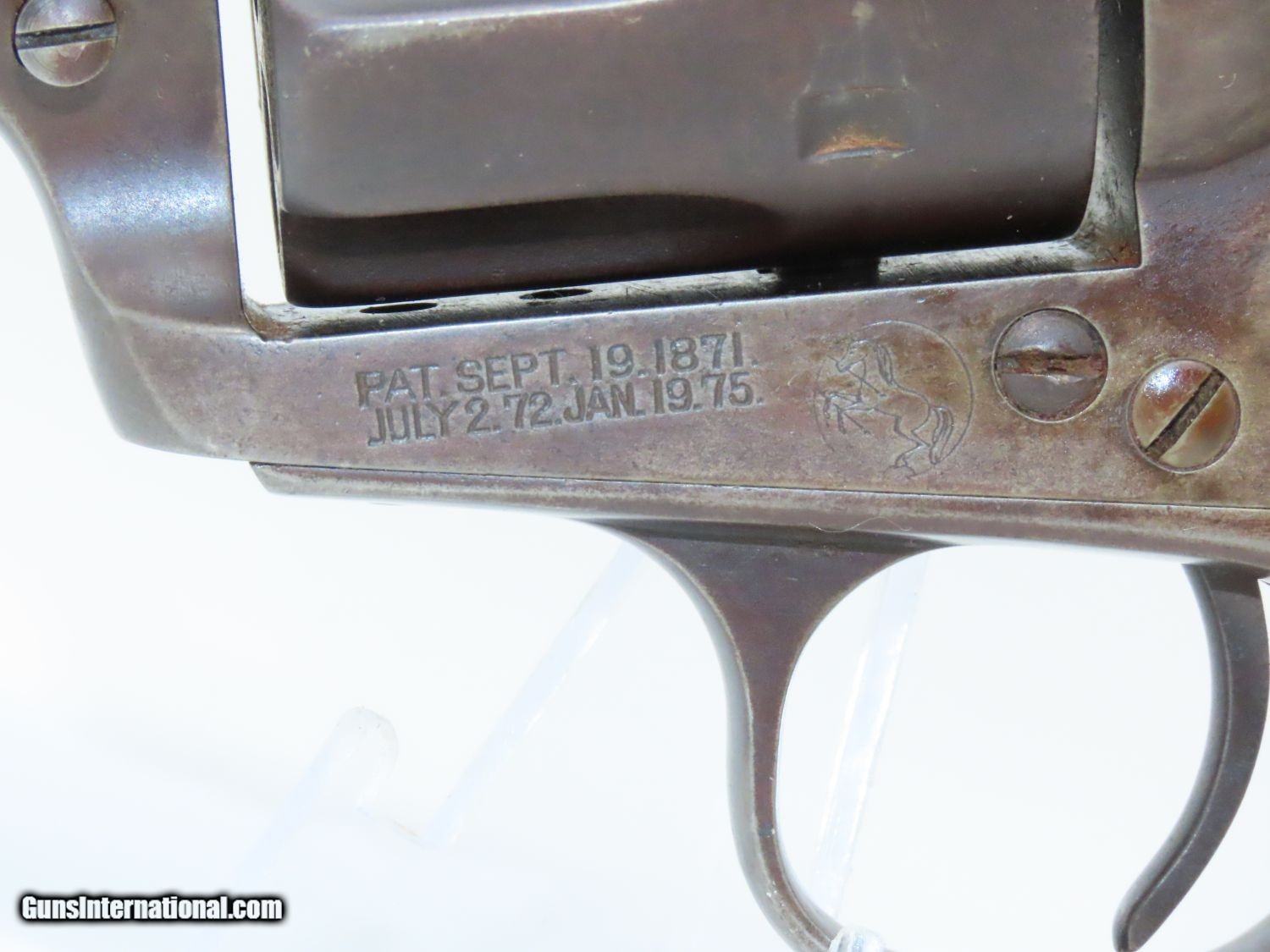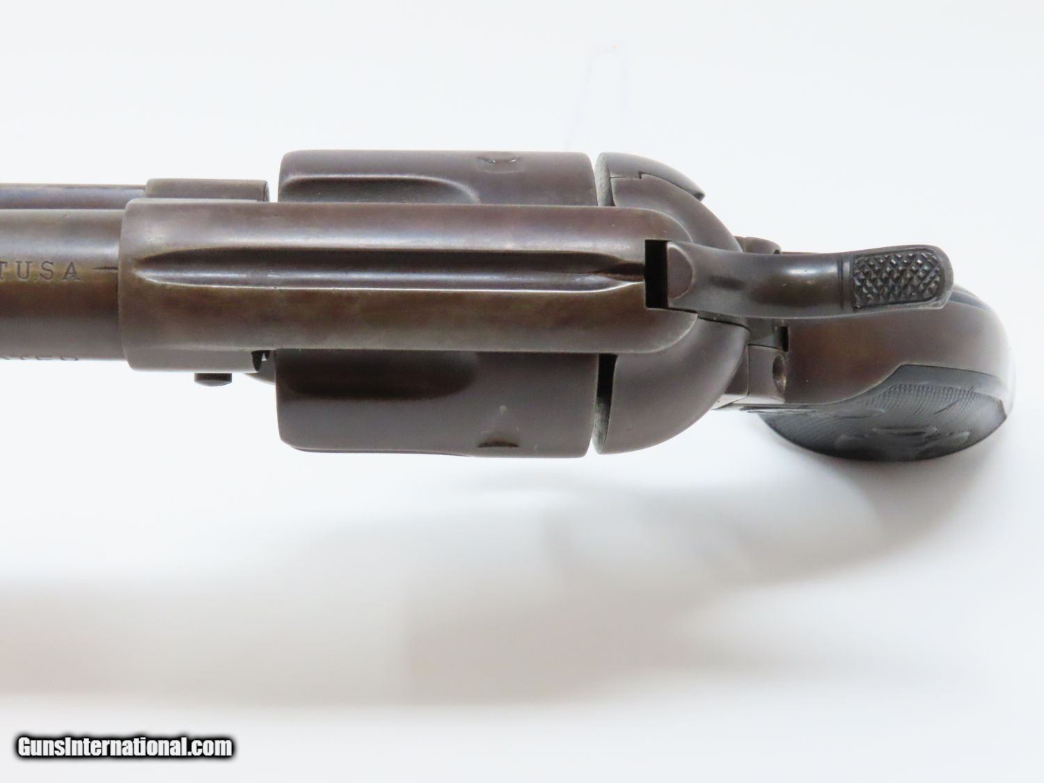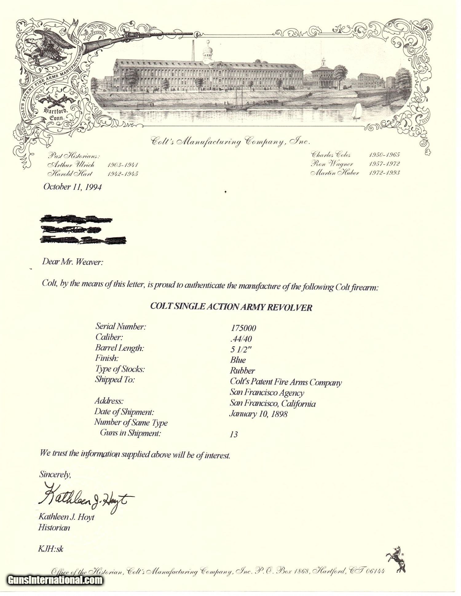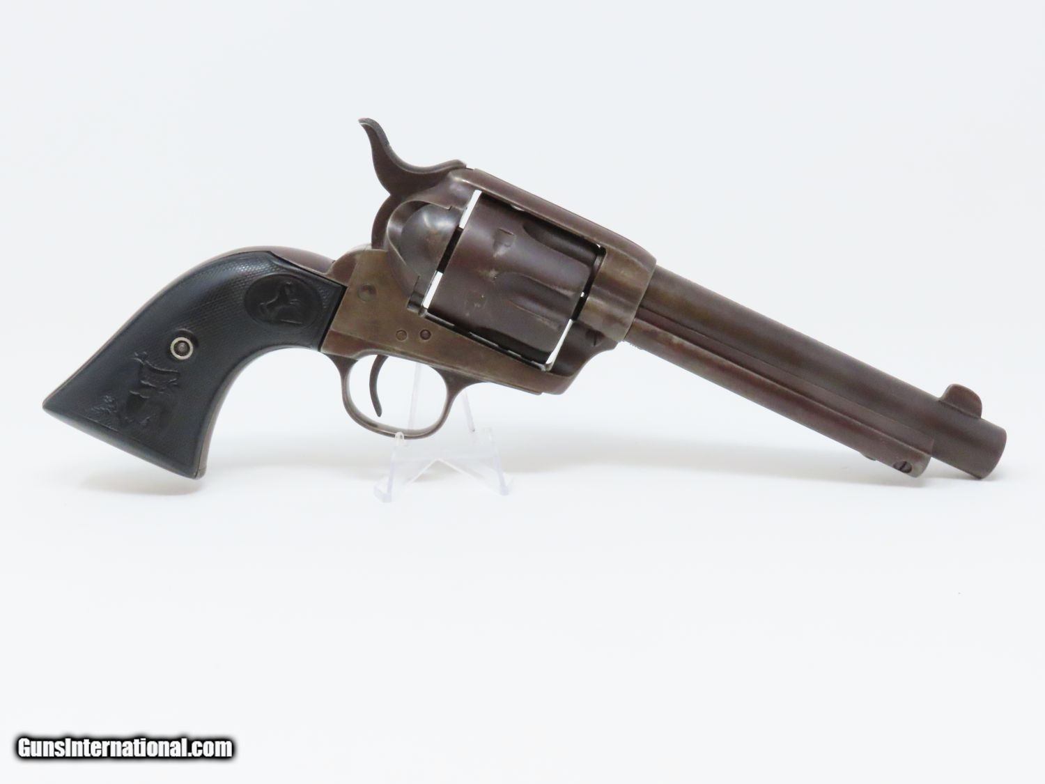 Description: SAN FRANCISCO Lettered Antique COLT FRONTIER SIX-SHOOTER 44-40 WCF Revolver Western Shipped 1898 Colt FRONTIER .44-40 Here we present an antique Colt Frontier Six-Shooter Model 1873 Revolver in .44-40 Winchester Center Fire, manufactured in 1898 in Hartford, Connecticut. The included factory letter confirms the current configuration as well as shipment to Colt's Patent Fire Arms Co. in San Francisco on January 10, 1898. The Colt Frontier or Frontier Six-Shooter was Colt's Model 1873 revolver manufactured in .44-40 Winchester caliber instead of .45 so that it was compatible with Winchester’s Model 1873 ammunition. Production began in 1877. “Colt Frontier Six-Shooter” was the actual name of the Colt pistol model, and this was acid-etched on the left side of the barrel. After 1889, the legend was roll-stamped until 1919, when the caliber designation ".44-40" was added. Though Colt enjoyed the largest contracts of any handgun maker during the American Civil War, it had to rely on its array of percussion fired revolvers, namely the 1860 Army until the Smith & Wesson owned Rollin White Patent expired in 1869. This enabled them to begin making revolvers with completely bored through cylinder chambers in order to utilize modern metallic cartridge ammunition in the most effective manner. In 1869, Colt began development of a suitable cartridge revolver in earnest, first coming out with a number of conversions for their percussion lines, until 1872 when they debuted what was to become the Colt Model 1873 Single Action Army in the 1872 U.S. Trials. Needless to say, it won, and became the Army’s revolver of choice. It also became the sidearm of choice for many others like cowboys, guards, lawmen, crooks, shopkeepers and all manner of civilians. The overall condition is very good. The action is strong and crisp. The bore is in good shape with strong rifling. The finish has matured to smooth dark brown patina. Both sides of the grips feature a federal eagle. Here is a hard to come by factory lettered first generation Colt Frontier! Own the original! This is a legitimate antique and not a reproduction. Barrel is 5-1/2 inches. Caliber: .44-40 WCF Overall condition as seen in photos. Very Fast. Very Safe. FREE SHIPPING WORLDWIDE. Delivered directly to your door by express mail! Guaranteed AUTHENTIC & Includes CERTIFICATE OF AUTHENTICITY. ancestryguns $5595 #20610 SOLD Antique: Yes |