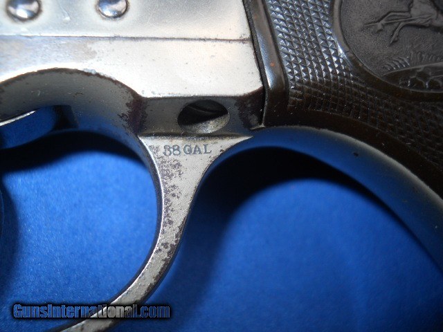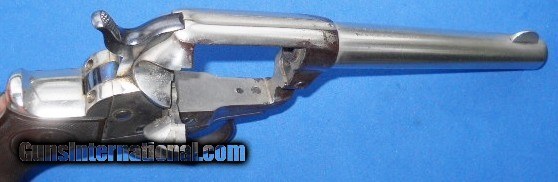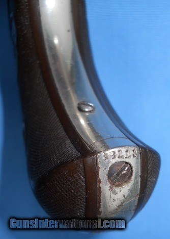 Description: ALL ORIGINAL COLT MODEL 1877 "LIGHTNING" CORRECT MATCHING NUMBERS, MFG. 1882. 4 1/2" BARREL WITH DISTINCT ETCHED PANEL RETAINING OVER 90% ORIGINAL NICKLE FINISH. STRONG BRIGHT BORE WITH MINIMAL LIGHT PITTING. BALANCE OF NICKLE SURFACES HAVE ABOUT 60 % REMAINING FINISH. BRIGHT FIRE BLUE ON HAMMER IS VIVID. ACTION WORKS 100% BOTH SINGLE & DOUBLE ACTION WITH SOLID CYLINDER LOCKUP. COLT FACTORY GRIPS RATE NEAR EXCELENT WITH NO DAMAGE AND ONLY MINOR LIGHT WEAR. OVERALL HONEST EXAMPLE, AS PICTURED. $ 20.00 S&H DIRECT TO BUYER ANYWHERE THAT'S OK. INSURANCE IF WANTED AT POSTAL RATES OF $1.50 PER $100.00 OF VALUE. INTERNATIONAL S&H ADDITIONAL COST DEPENDING ON DESTINATION. SOLD Antique: Yes Handgun Caliber: .38 Long Colt Manufacturer: COLT Model: 1877 Serial Number: 38113 Barrel Length: 4 1/2 Bore: STRONG RIFLING Chambers: CLEAR Condition: VERY GOOD PLUS AS PICTURED Metal Condition: ORIGINAL NICKLE Bore Condition: VERY GOOD PLUS, BRIGHT Barrel Type: ROUND Action: DOUBLE ACTION Finish: ORIGINAL Weight: 1 lb 8 oz Sights: FACTORY ORIGINAL Manufacture Date: 1882 |