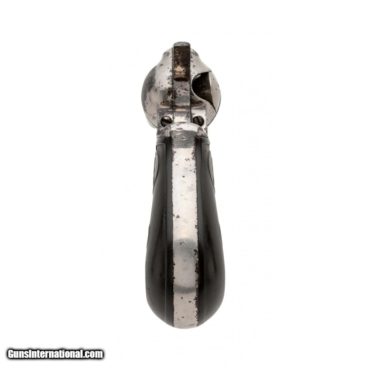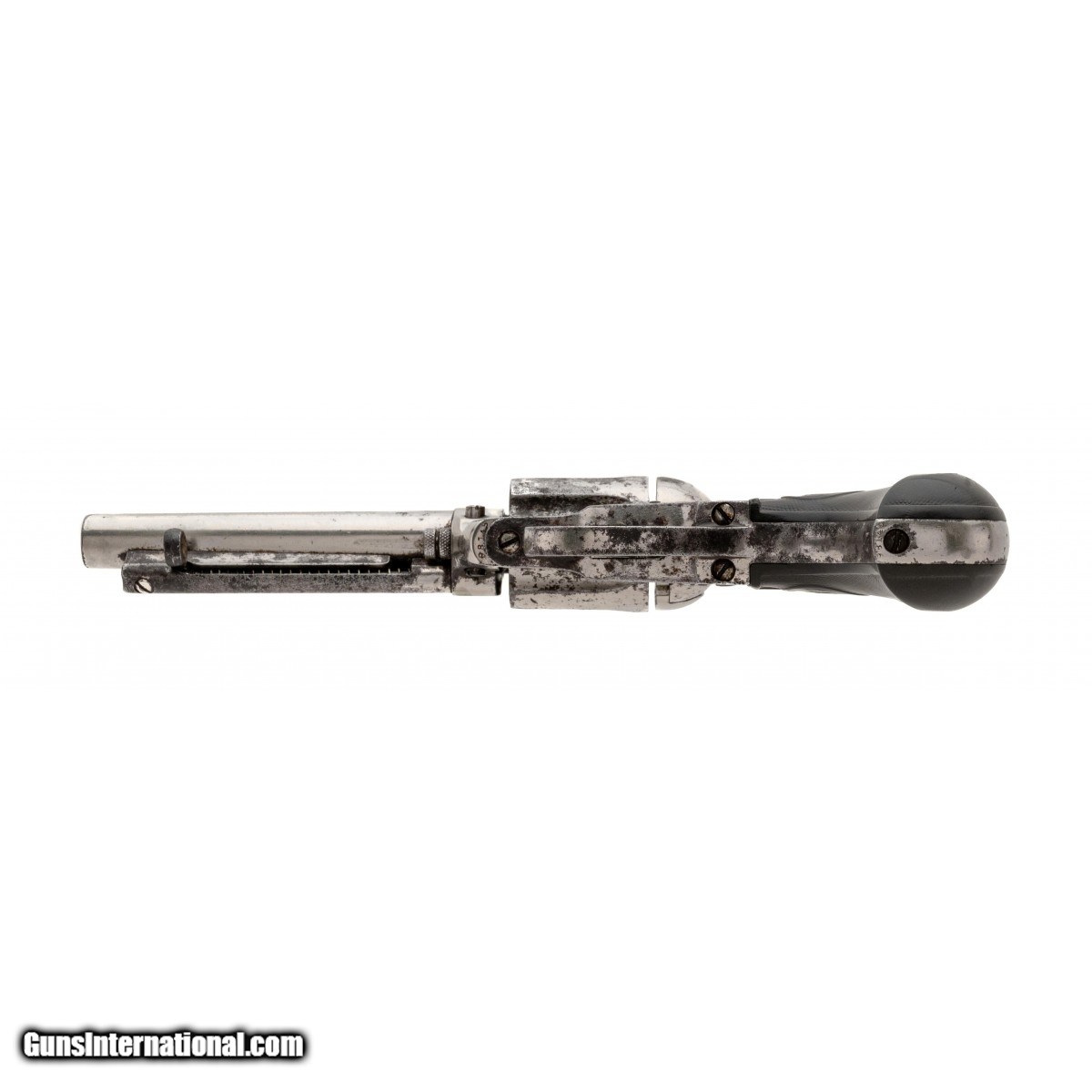 Description: "Serial No. 93145, made in 1893, .38 caliber, 4.5"" round barrel. Nickel finish shows spotted oxidation visible mostly on the cylinder, ejector housing and grip frame. Bore shows areas of oxidation visible in the grooves, rifling remains strong. Grips are good with no cracks noted. Checkering is smooth from handling wear. Action indexes correctly with a tight lock up. Consignment SOLD Antique: Yes |