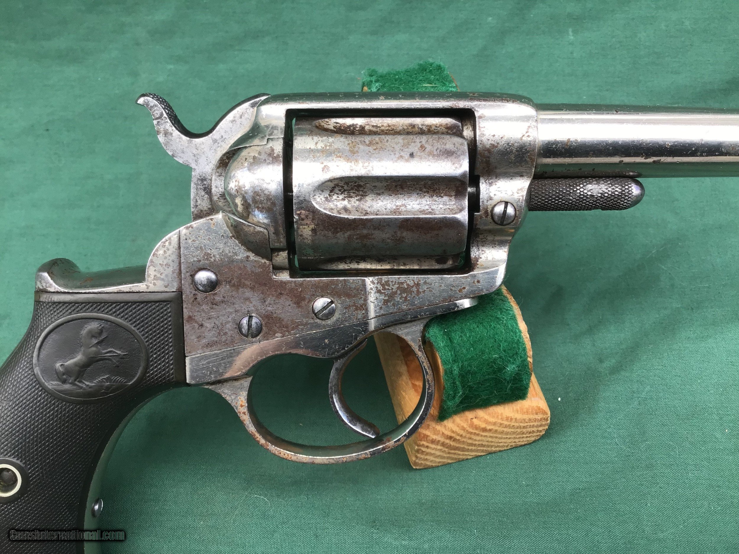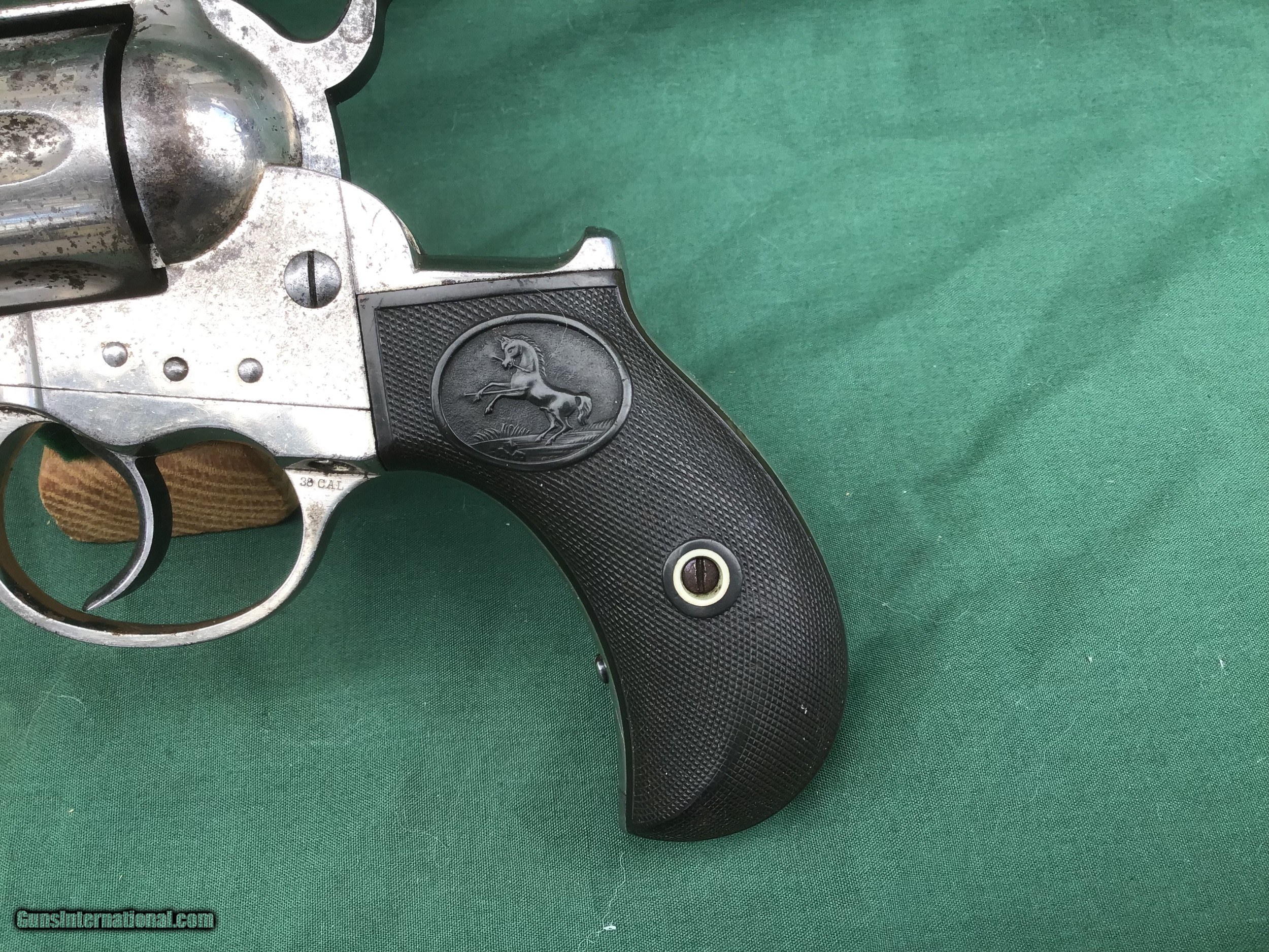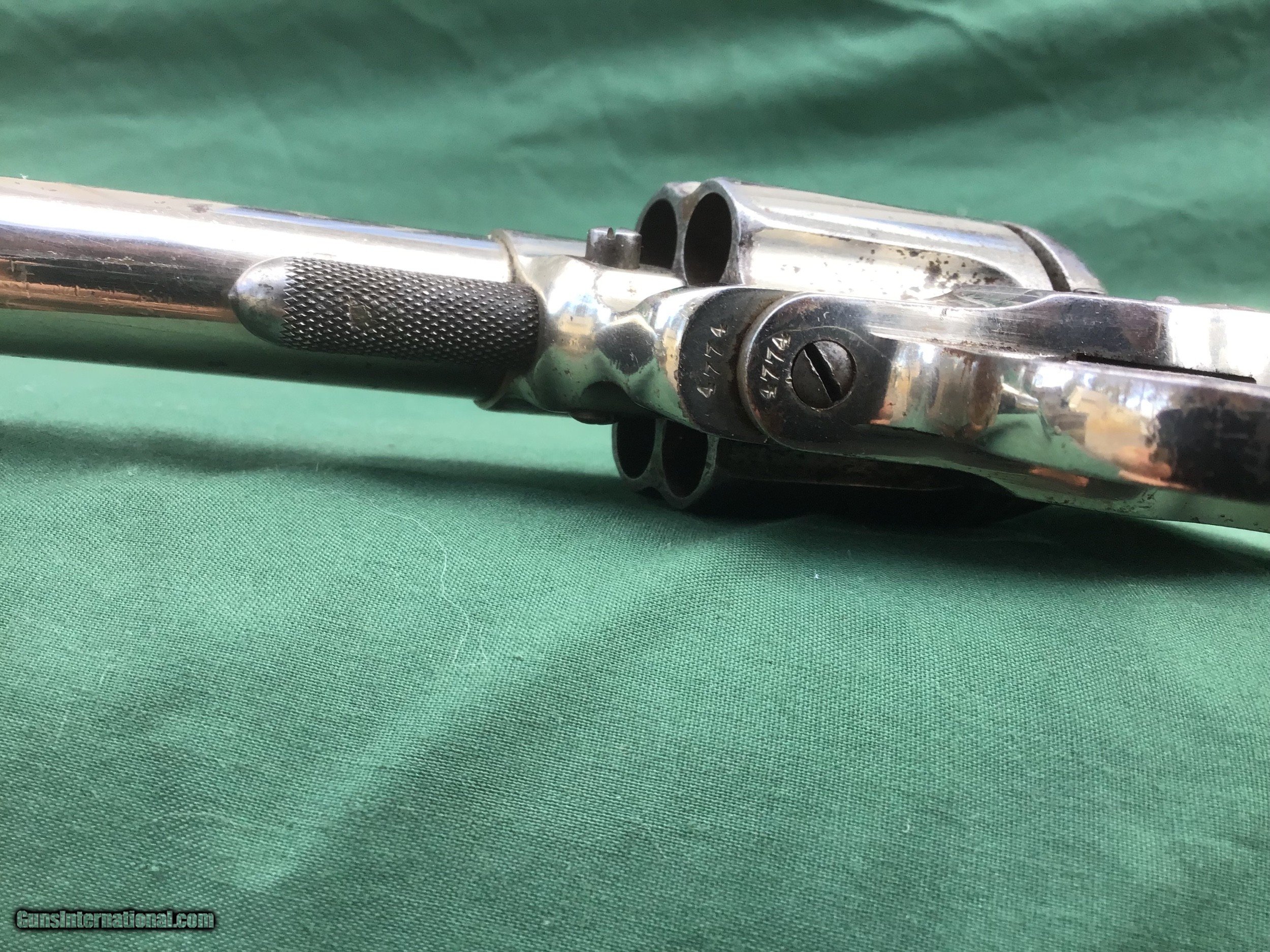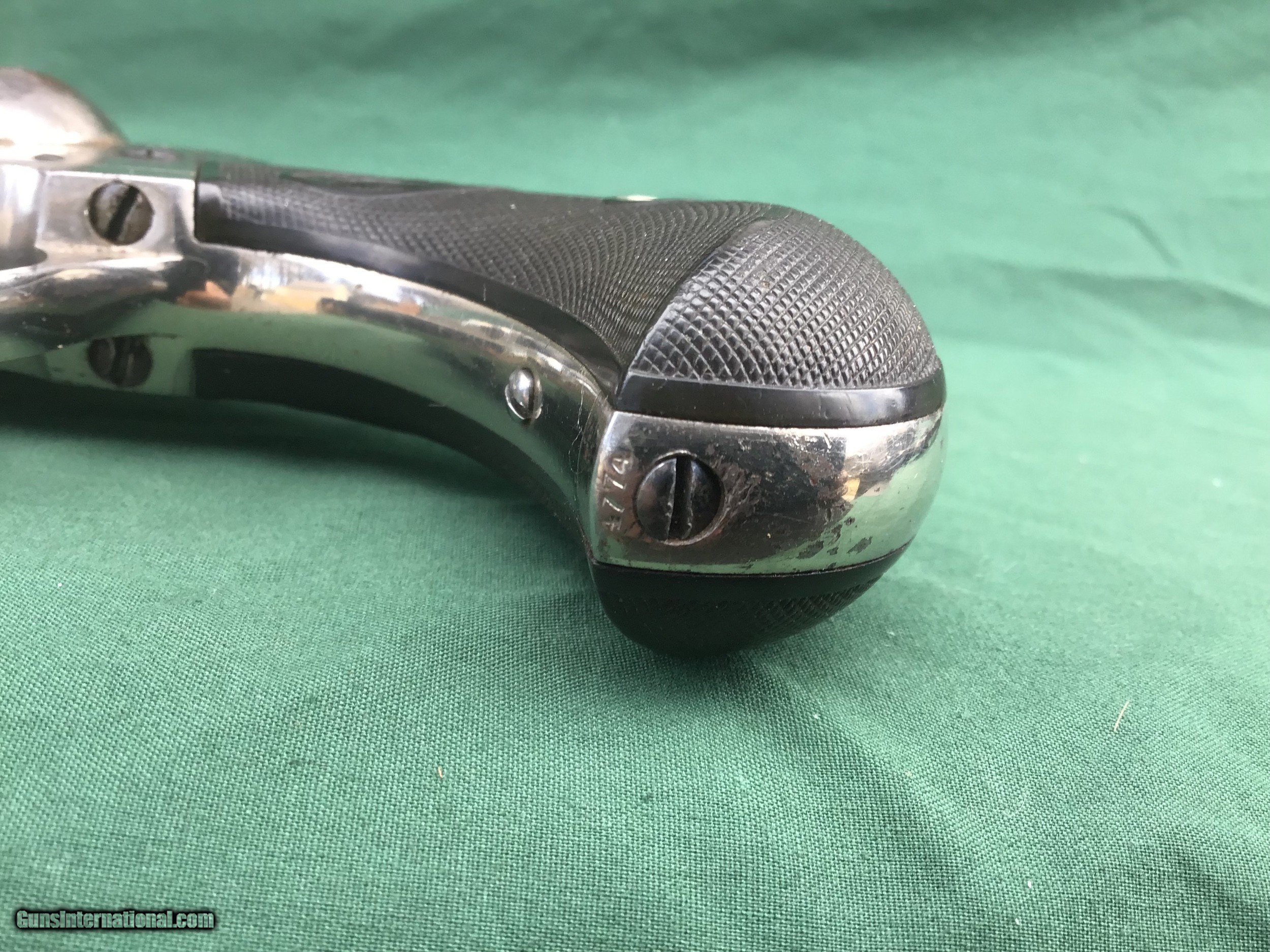 Description: Early 1877 Colt Lightning Etched Panel Double Action Revolver, made in 1878 in Hartford, Connecticut. Serial number 4774 and is matching. 38 caliber with hard rubber grips, matching serial number on the grips as well. 3 1/2" barrel and no ejector rod. Etched Panel is still visible (see pics). Functions in both single and double action. Nice fire blue on back of hammer and trigger (see pics). Barrel retains 80 to 85% of its original finish. Good bore. Frame retains 60 to 65% of their original finish. Cylinder retains 50% original nickel. Just a nice original early etched panel Colt Lightning offered at a reasonable price. Please know your state laws, this is an antique but only in the states that recognize the antique laws. For example NY isn't one of them. Please feel free to ask questions. Sold as a Collectors Item only. SOLD Antique: Yes |