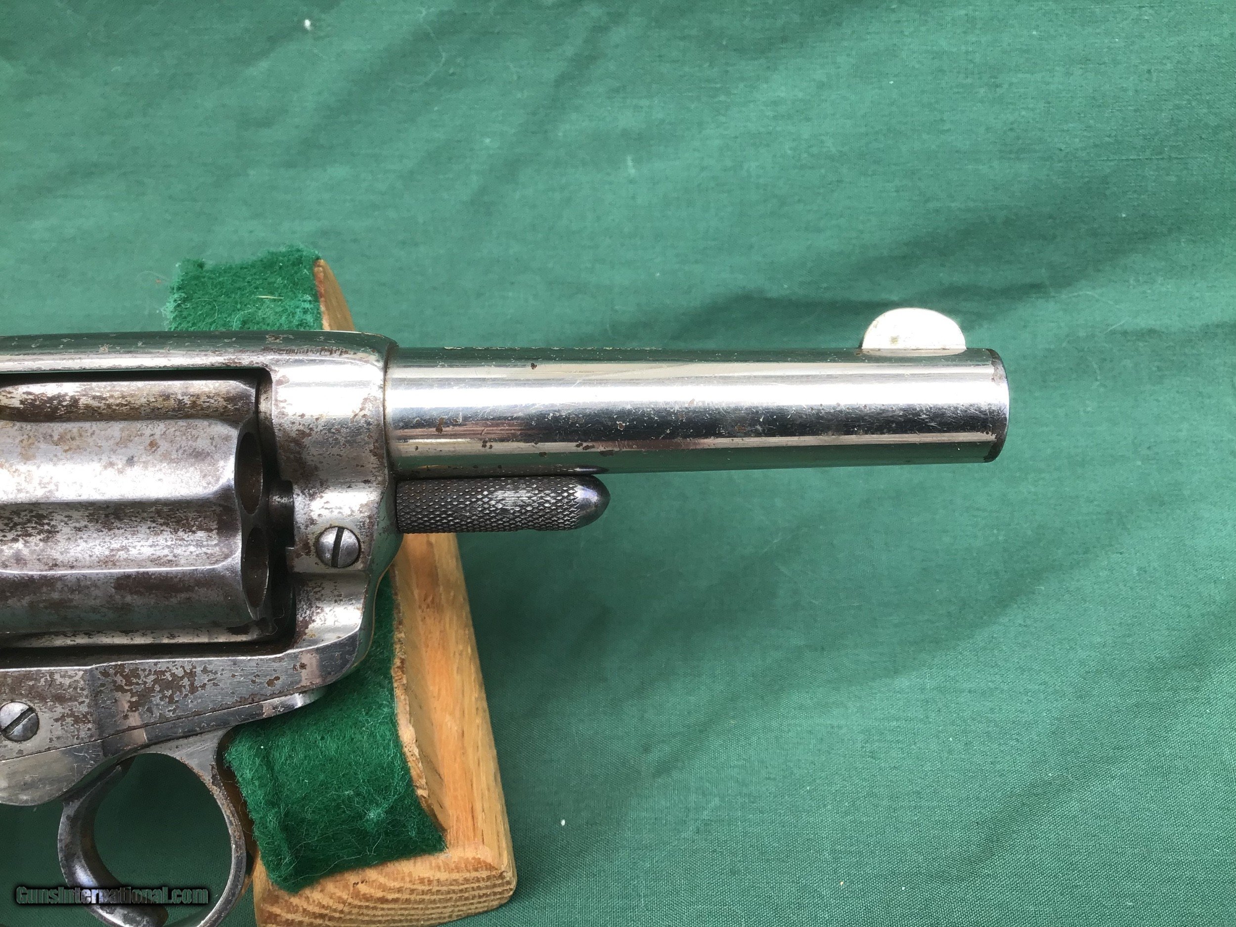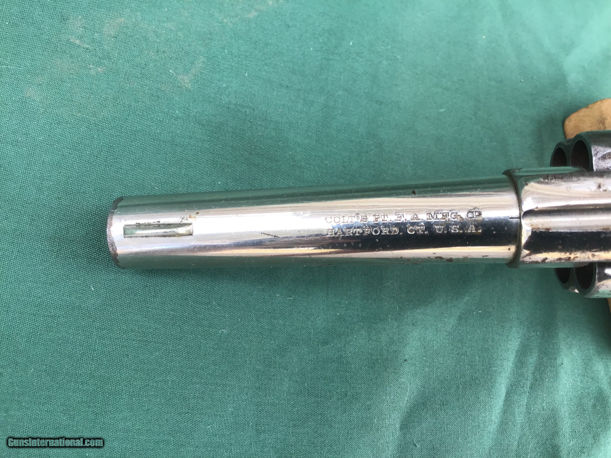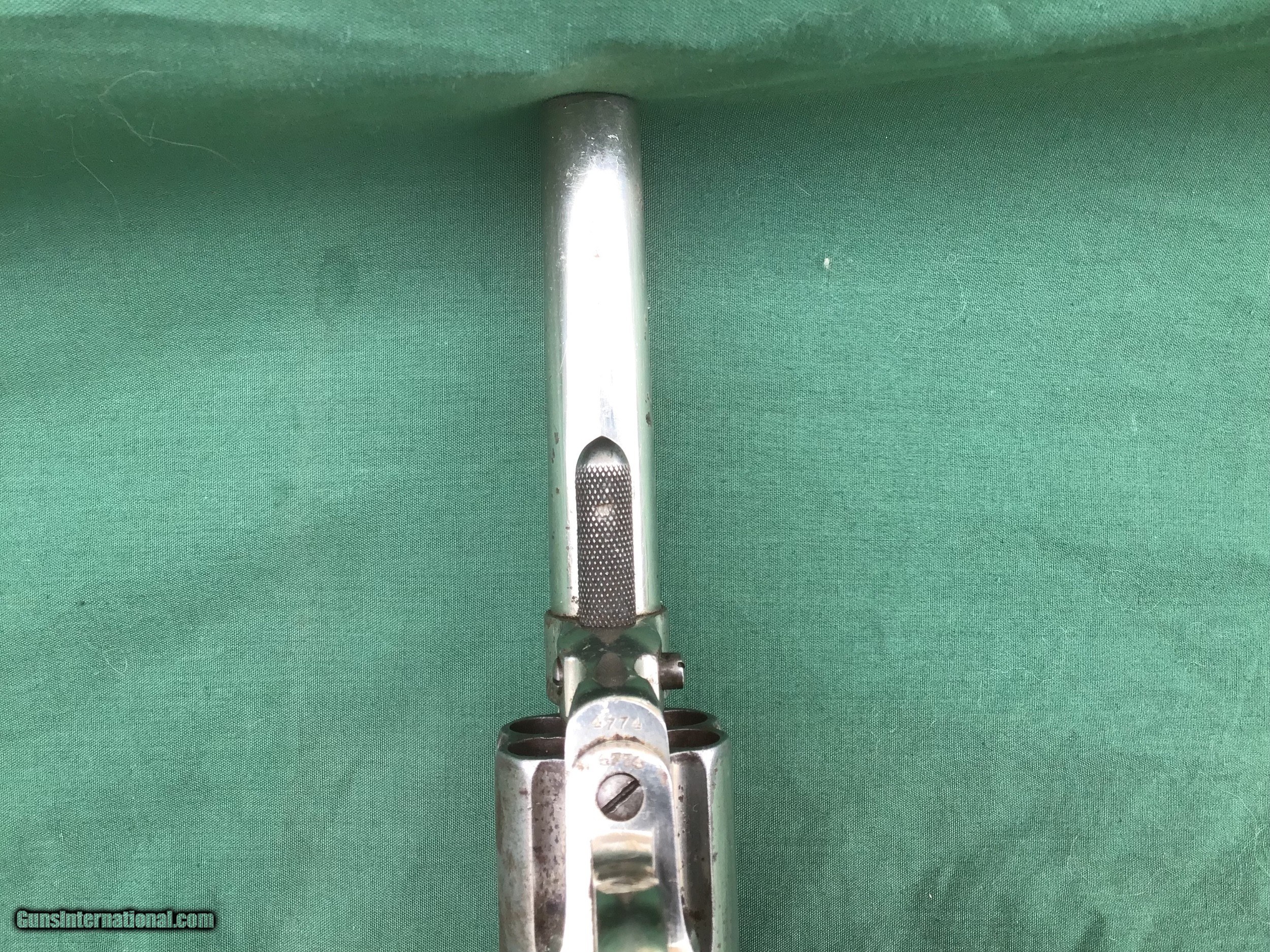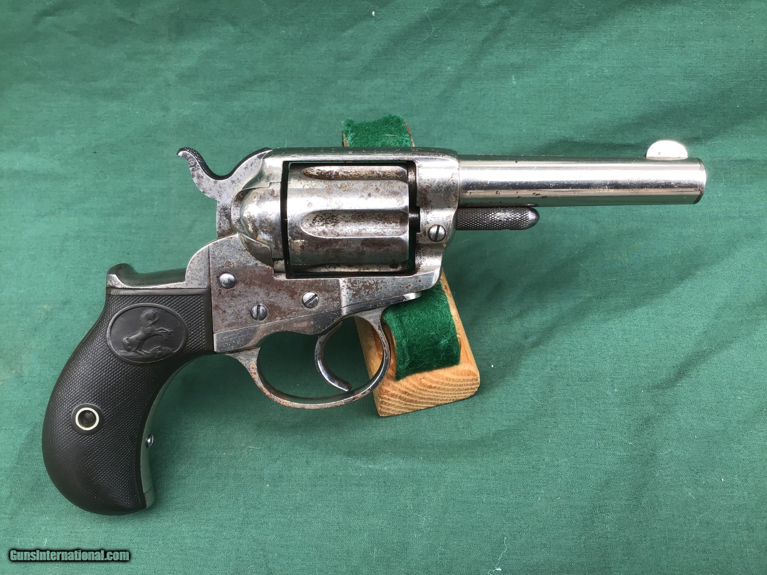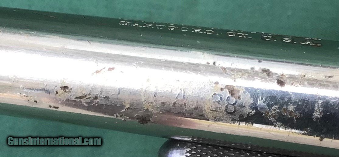 Description: Early 1877 Colt Lightning Etched Panel Double Action Revolver, made in 1878 in Hartford, Connecticut. Serial number 4774 and is matching. 38 caliber with hard rubber grips, matching serial number on the grips as well. 3 1/2" barrel and no ejector rod. Etched Panel is still visible (see pics). Functions in both single and double action. Nice fire blue on back of hammer and trigger (see pics). Barrel retains 80 to 85% of its original finish. Good bore. Frame retains 60 to 65% of their original finish. Cylinder retains 50% original nickel. Just a nice original early etched panel Colt Lightning offered at a reasonable price. Please know your state laws, this is an antique but only in the states that recognize the antique laws. For example NY isn't one of them. Please feel free to ask questions. Sold as a Collectors Item only. SOLD Antique: Yes |