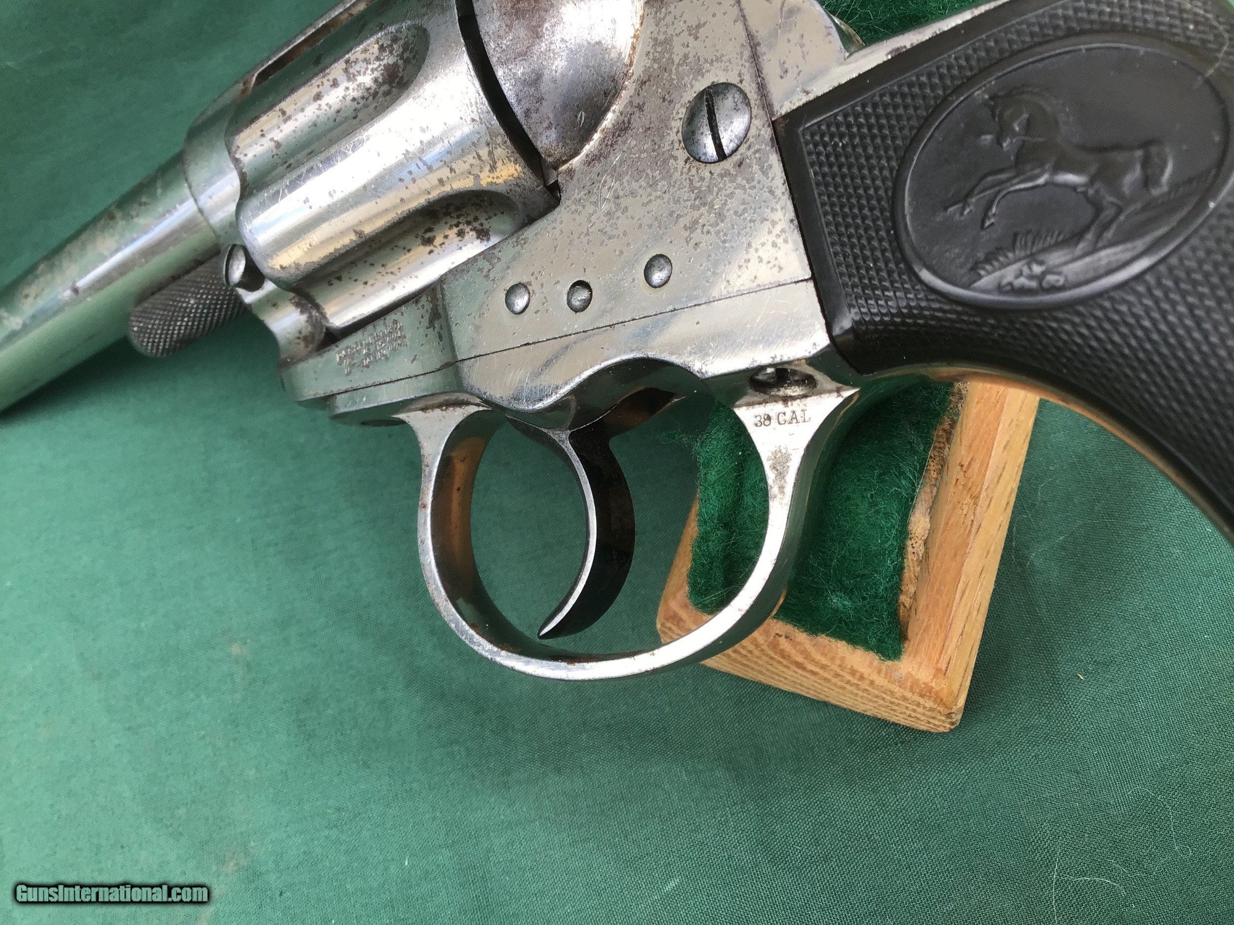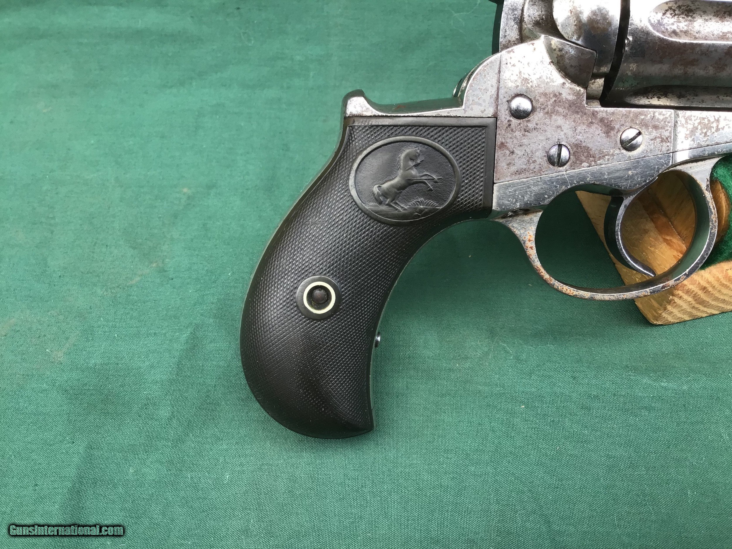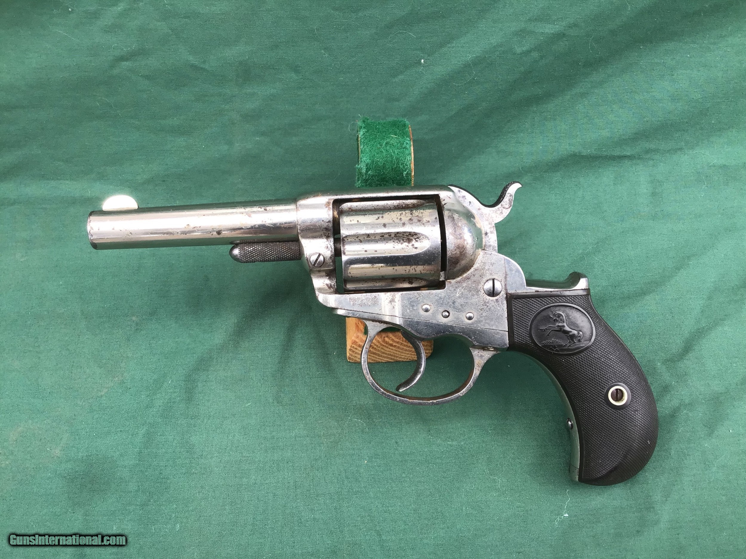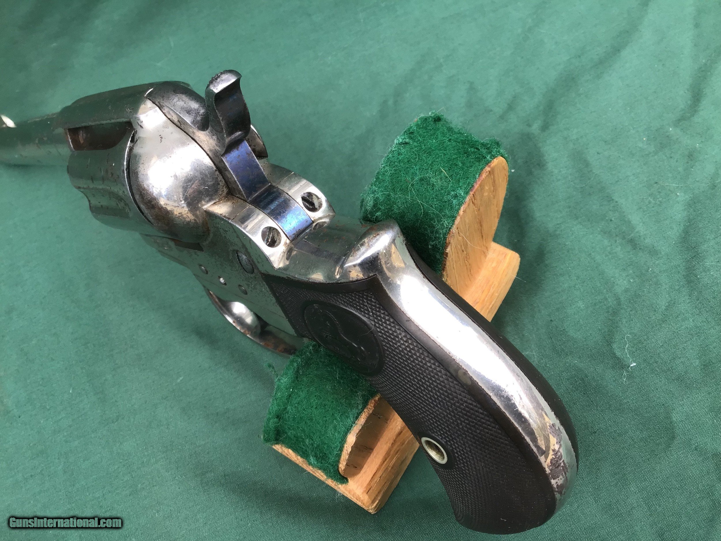 Description: Early 1877 Colt Lightning Etched Panel Double Action Revolver, made in 1878 in Hartford, Connecticut. Serial number 4774 and is matching. 38 caliber with hard rubber grips, matching serial number on the grips as well. 3 1/2" barrel and no ejector rod. Etched Panel is still visible (see pics). Functions in both single and double action. Nice fire blue on back of hammer and trigger (see pics). Barrel retains 80 to 85% of its original finish. Good bore. Frame retains 60 to 65% of their original finish. Cylinder retains 50% original nickel. Just a nice original early etched panel Colt Lightning offered at a reasonable price. Please know your state laws, this is an antique but only in the states that recognize the antique laws. For example NY isn't one of them. Please feel free to ask questions. Sold as a Collectors Item only. SOLD Antique: Yes |