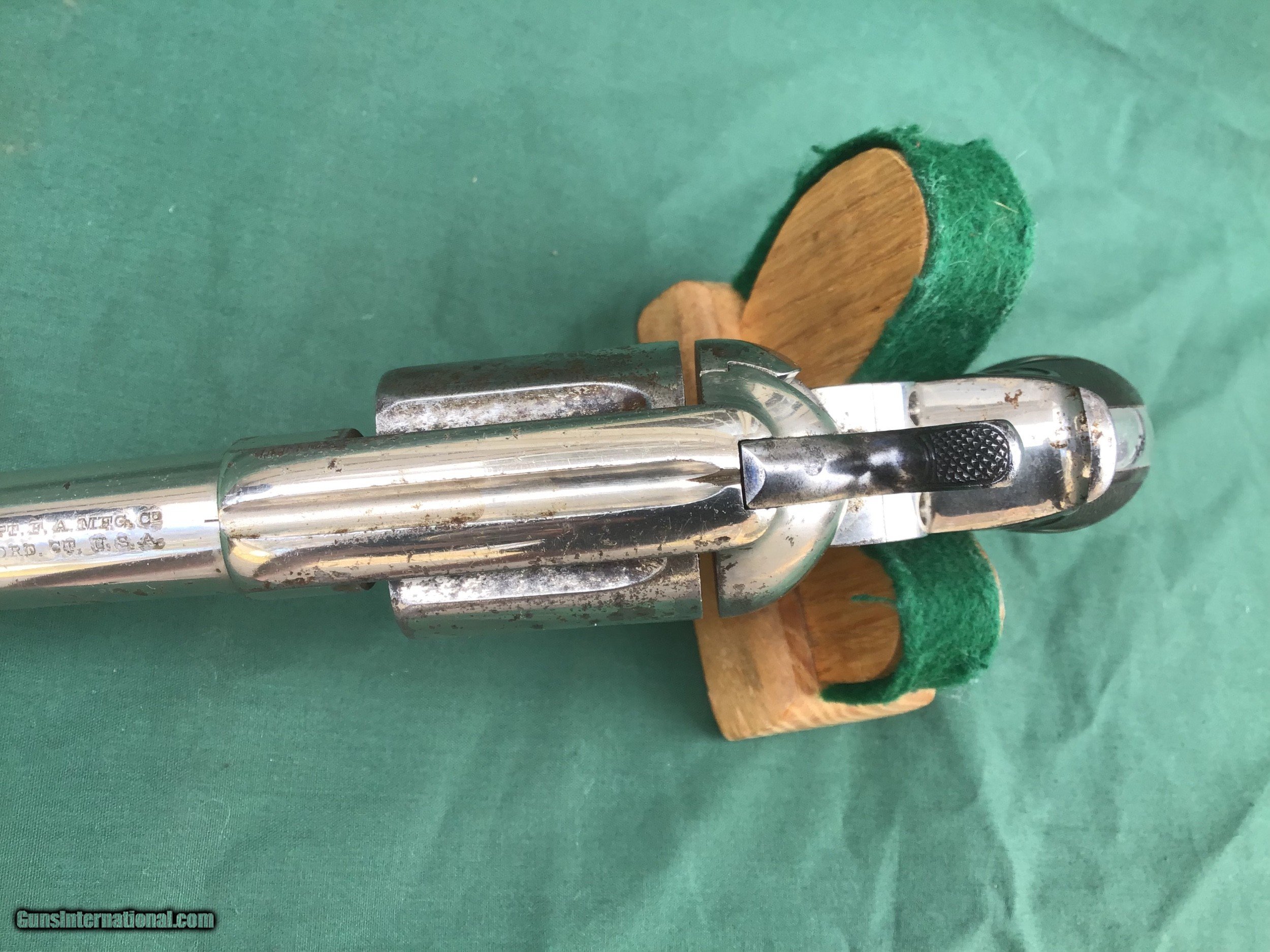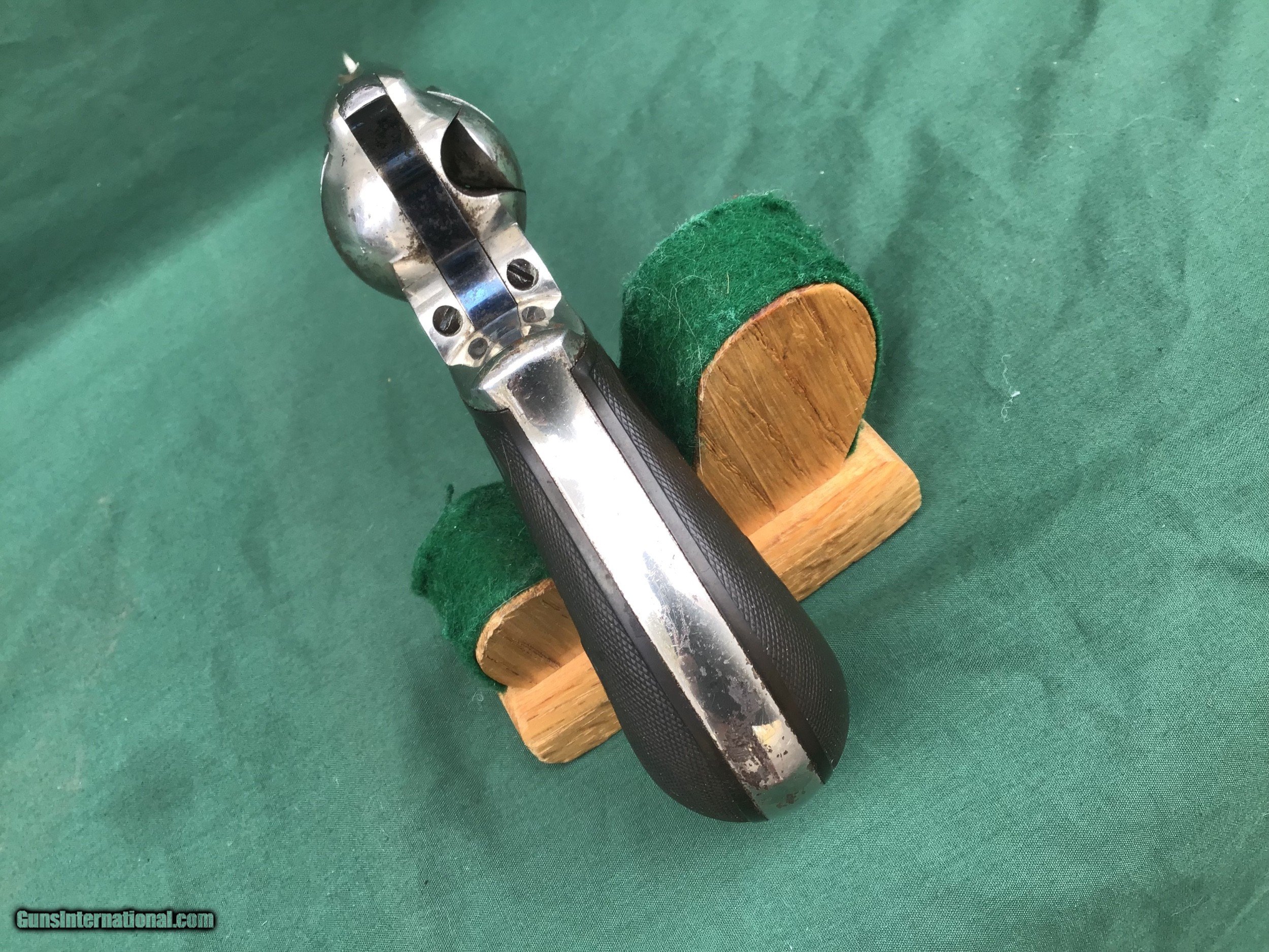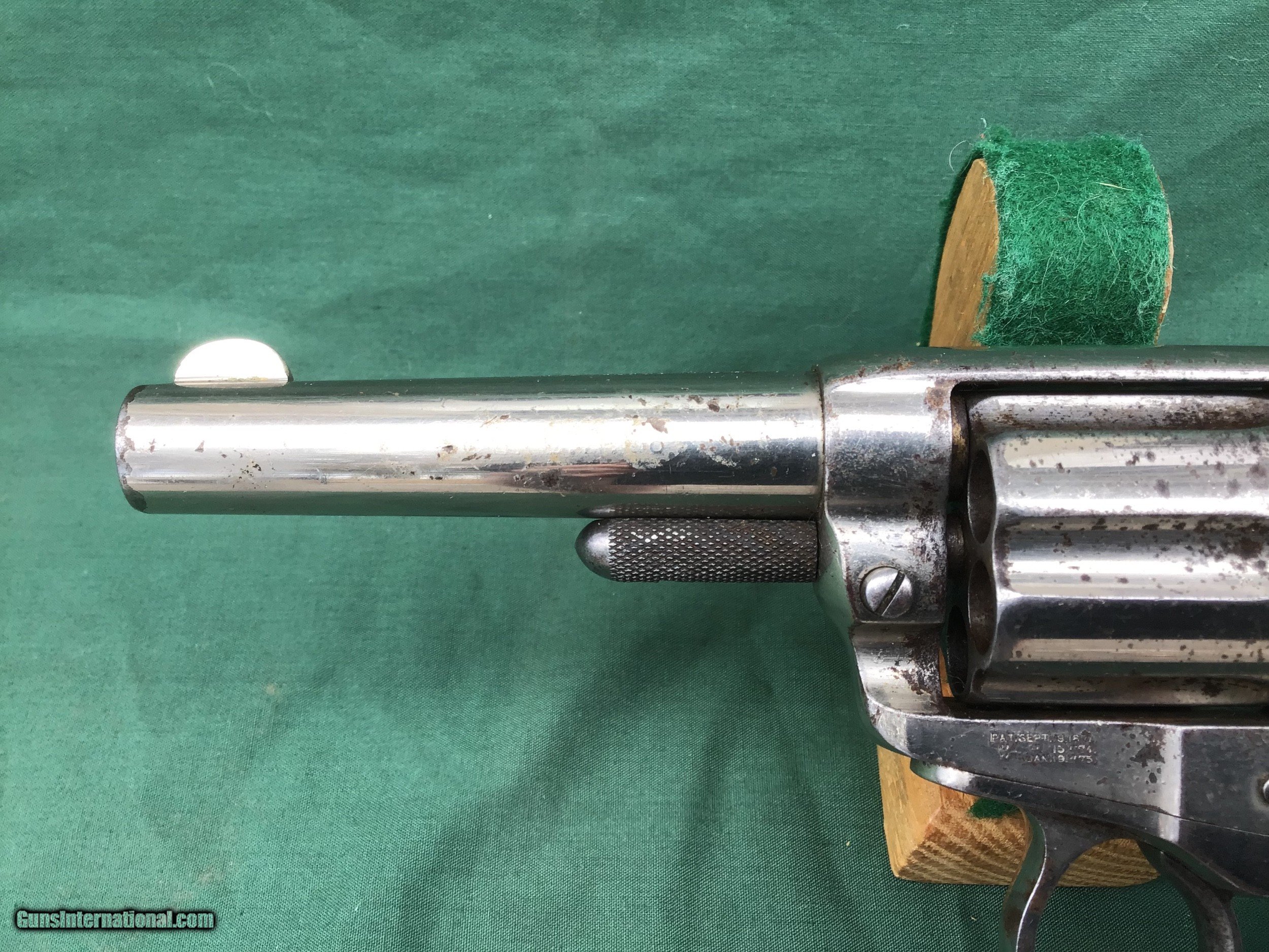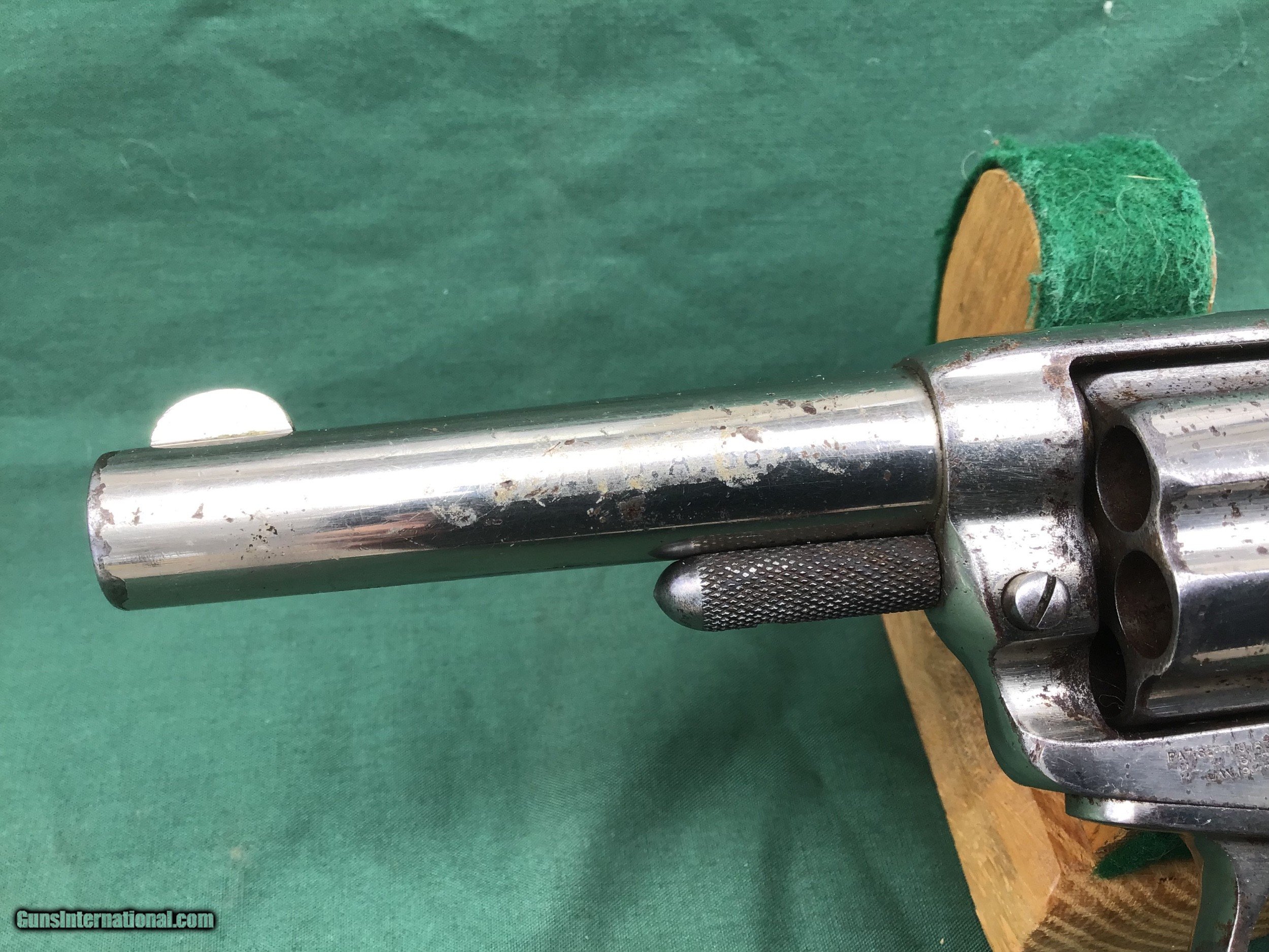 Description: Early 1877 Colt Lightning Etched Panel Double Action Revolver, made in 1878 in Hartford, Connecticut. Serial number 4774 and is matching. 38 caliber with hard rubber grips, matching serial number on the grips as well. 3 1/2" barrel and no ejector rod. Etched Panel is still visible (see pics). Functions in both single and double action. Nice fire blue on back of hammer and trigger (see pics). Barrel retains 80 to 85% of its original finish. Good bore. Frame retains 60 to 65% of their original finish. Cylinder retains 50% original nickel. Just a nice original early etched panel Colt Lightning offered at a reasonable price. Please know your state laws, this is an antique but only in the states that recognize the antique laws. For example NY isn't one of them. Please feel free to ask questions. Sold as a Collectors Item only. SOLD Antique: Yes |
