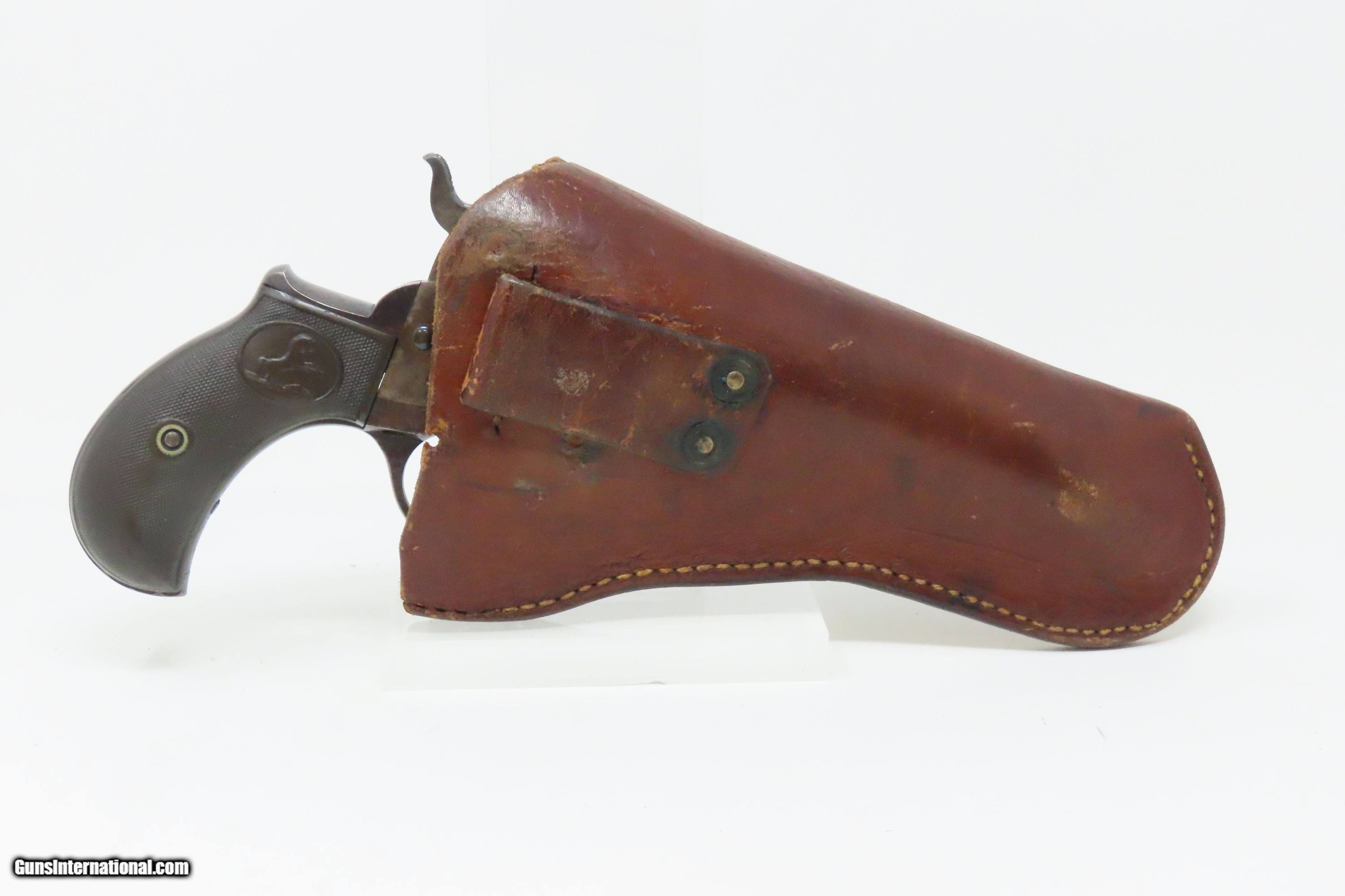 Description: c1898 mfr. Antique COLT M1877 “Lightning” .38 Revolver DOC HOLLIDAY w/ Tooled Leather Holster Here we present an antique Colt Model 1877 Lightning Double Action Revolver, made in 1898 in Hartford, Connecticut. The Model 1877 was Colt’s first venture into double action revolvers. It was quite successful, selling 166,849 from 1877 through 1909. Nonetheless, there was some hesitation to move away from the single action mechanism, which had so proven itself. Famous adopters of the Lightning were William “Billy the Kid” Bonney and John Wesley Hardin, along with “Doc” Holliday. Doc’s weapon of choice early in his western career was an 1851 Colt Navy revolver. Later, Doc carried a nickel-plated .41 caliber Colt Thunderer or the .38 caliber Colt Lightning. The Model 1877 was designed in 1876 by William Mason and was offered in three different calibers with production beginning in January 1877, which led to the three unofficial names. The first production model was the “Lightning”, in .38 Long Colt caliber. Later that year, Colt came out with the .41 Long Colt caliber called the “Thunderer”. The .32 Long Colt caliber, called the “Rainmaker”, didn’t go into production until sometime in 1887. Benjamin Kittredge, the largest Colt Distributor in Cincinnati, Ohio, coined the nicknames for these guns as a marketing tool. He was also responsible for calling the Model 1873 Single Action Army the “Peacemaker”. None of the nicknames were ever used by the factory in any reference materials. The 1877 "Thunderer” in .41 caliber was the preferred weapon of Billy the Kid and was his weapon of choice when he was killed by Pat Garret in 1881. The overall condition is fine. Original blue finish and case colors. The action is excellent. The bore is shiny bright with sharp rifling. The Colt trademark grips are solid and show some use. Numbers match. The holster is in good condition for its age. Own the original! This is a legitimate antique and not a reproduction. Barrel is 4-1/2 inches. Caliber: .38 Long Colt Overall condition as seen in photos. Very Fast. Very Safe. FREE SHIPPING WORLDWIDE. Delivered directly to your door by express mail! Guaranteed AUTHENTIC & Includes CERTIFICATE OF AUTHENTICITY. ancestryguns $2400 #244278 SOLD Antique: Yes |