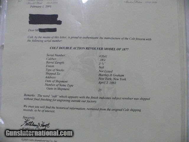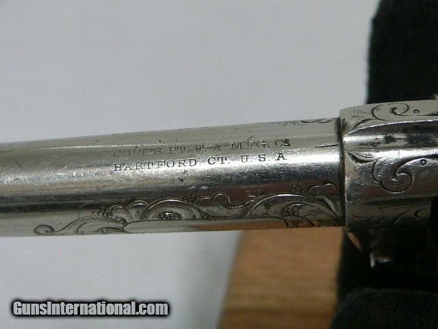 Description: LOWERED PRICE C183 Colt 1877 Engraved it left Colt in the Soft 38 Colt 1883 Lighting model 1877 DA, Cal. 38 colt, 50% nickel, a good bore, 3 ½” barrel, Manufactured in Hartford Connecticut in 1883 on top of the barrel is a two line Colt address on the left side of the barrel is a decent etched Colt DA 38 on the left side of the frame is three line patent, on the rare trigger guard is 38 Cal. In excellent working condition in single action or double-action, comes with two piece pearl grips in very good condition still has fire blue on the back of the hammer and trigger. This comes with a factory letter it was shipped to Hartley & Graham New York in April 1883. Serial Number 426XX This Gun is “ANTIQUE” Ship right to your Door” PLEASE SEE PHOTOS FOR CONDITION come with Factory Letter If you Phone then call from 7:00 AM and 6:00 PM Central time. + Shipping is $50.00 SOLD Antique: Yes Handgun Caliber: .38 Long Colt Manufacturer: colt Model: Lighting Barrel Length: 3 1/2 |