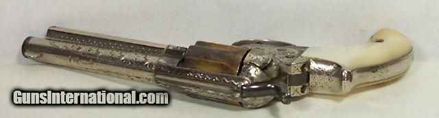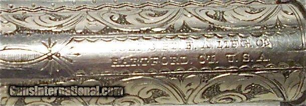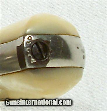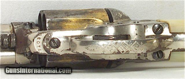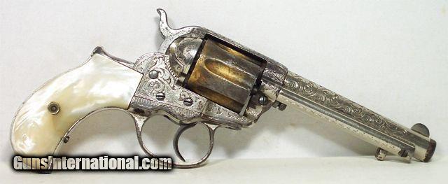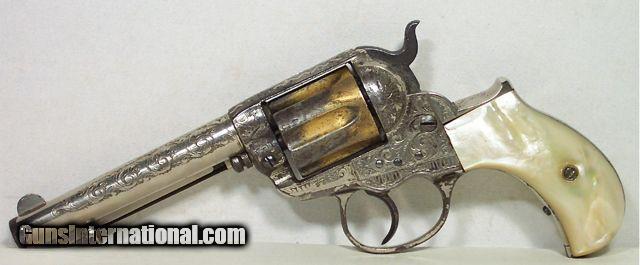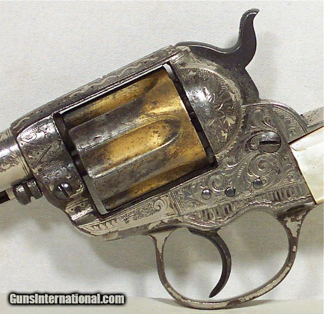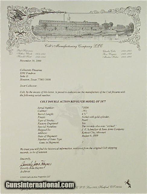 Description: Colt Model 1877 38 cal. “Lightning”; SN 71036; RARE Factory Engraved, Nickel with Gold Cylinder & Pearl Grips; ALL in Factory Letter showing an August 6, 1889 shipping date to J.F. Schmelzer & Sons, Kansas City, Missouri; MOST of ORIGINAL NICKEL finish remains; LOTS of ORIGINAL GOLD remains on cylinder; EXCELLENT Pearl Grips; 100% CORRECT & MATCHING; GREAT ACTION; EXCELLENT BORE WITH ONLY MINOR FROSTING; BEAUTIFUL, RARE, 128 YEAR OLD COLT; antique, no FFL/C&R required for shipping; All items shipped fully insured Priority Mail- -Hand guns $30 --Long guns $45-- Spurs $30-- Knives, Swords & Sabers $30 (Texas residents please add 6.75% sales tax); return policy: three days inspection from the date the item is received; full refund of shipping both ways ONLY IF THE ITEM IS MISREPRESENTED. Note: International sales only as laws permit. Will ship C&R eligible items to C&R license. Antiques shipped without license to anyone EXCEPT New Jersey and City of New York where a FFL is required. SOLD Antique: Yes Manufacturer: Colt Model: 1877 38cal. Lightning Serial Number: 71036 |