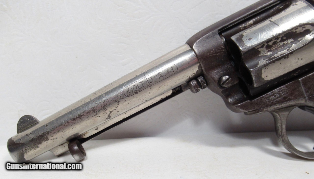 Description: SALE PENDING--Colt Model 1877; Serial No. 41870; Made 1883; .41 Caliber with 4 ½” Barrel; Etch Panel “Colt D.A. 41”; The Backstrap is No. 13368 (1879); I Have to Believe that this Old Colt Came from the Factory Like This as all Wear Matches; We Call These Texas Dirty Nickel – where Nickel is, it is – Where it Ain’t, it ain’t; Just Uncleaned Dark Brown Patina; Perfect Action (Rare); Strong Bore with light even frosting; Nice Original Colt Grips; 138 Year-Old Texas Dirty Nickel Colt Revolver; See All Photos for Condition; No Texts; Call (254)541-5765 or Email Only; PERSONAL PROPERTY of Harold Wieser; Price: $775 + $45 S&H Via USPS PRIORITY MAIL; Payment Address: Harold Wieser - 1466 U.S. Hwy 77 - Rosebud, TX 76570; SEND PAYMENTS VIA USPS PRIORITY MAIL; SOLD Antique: Yes Manufacturer: Colt Model: 1877 Serial Number: 41870 |