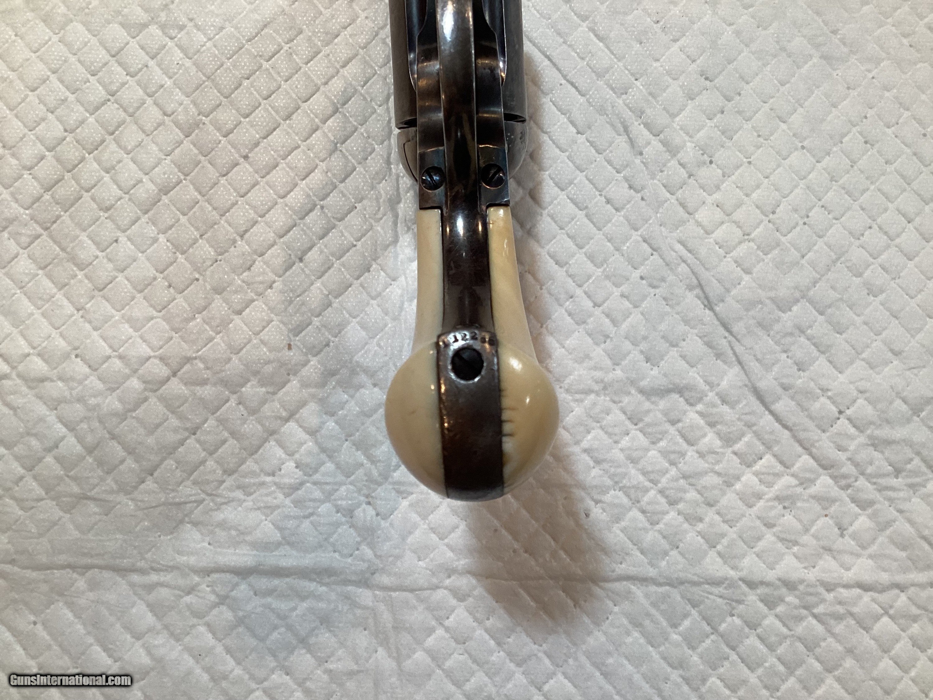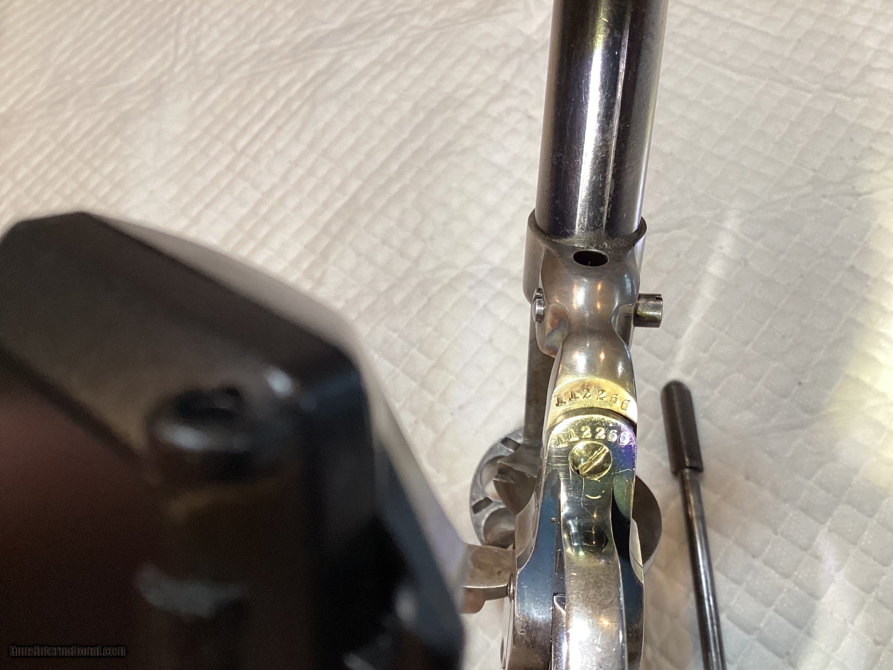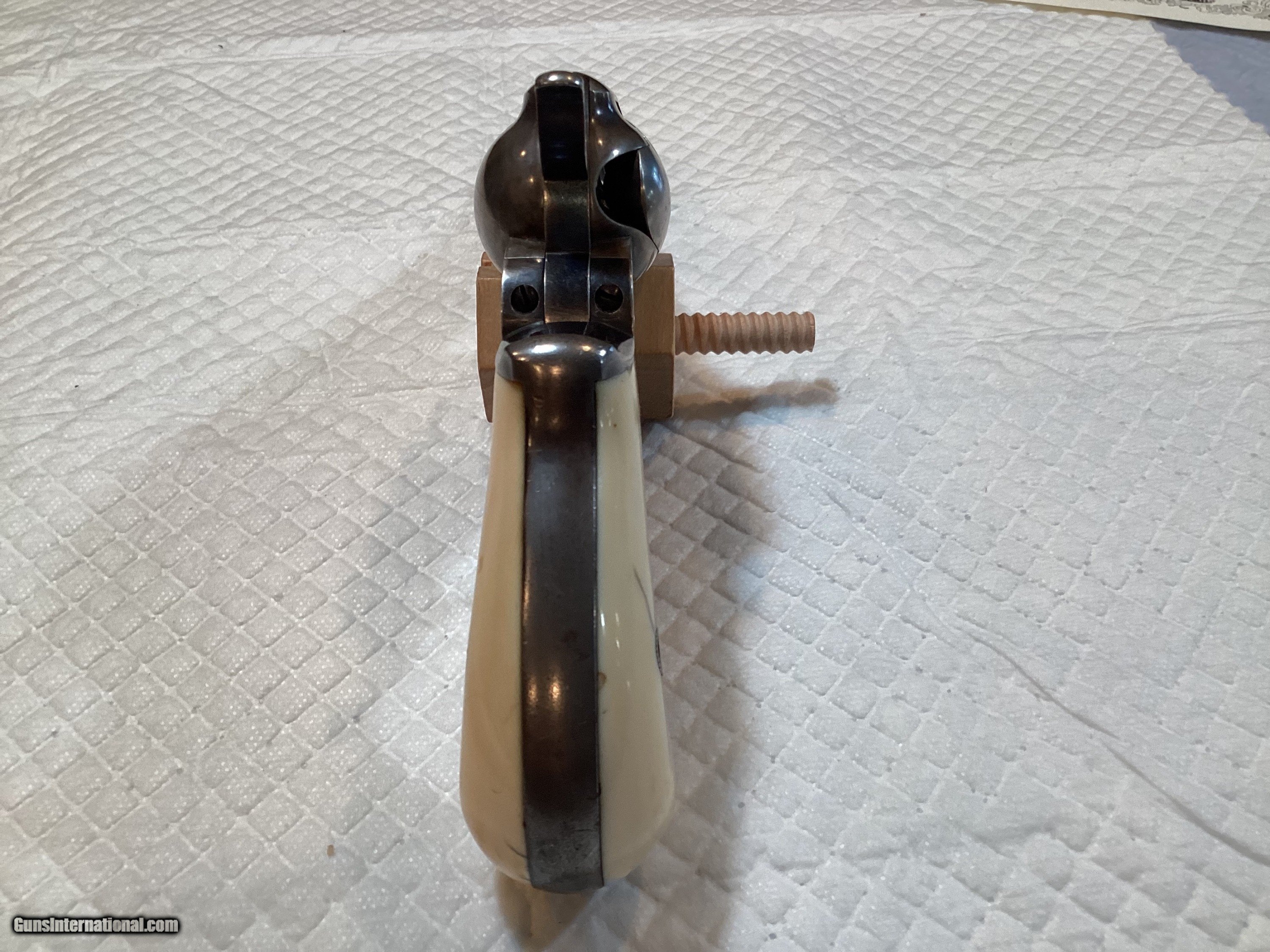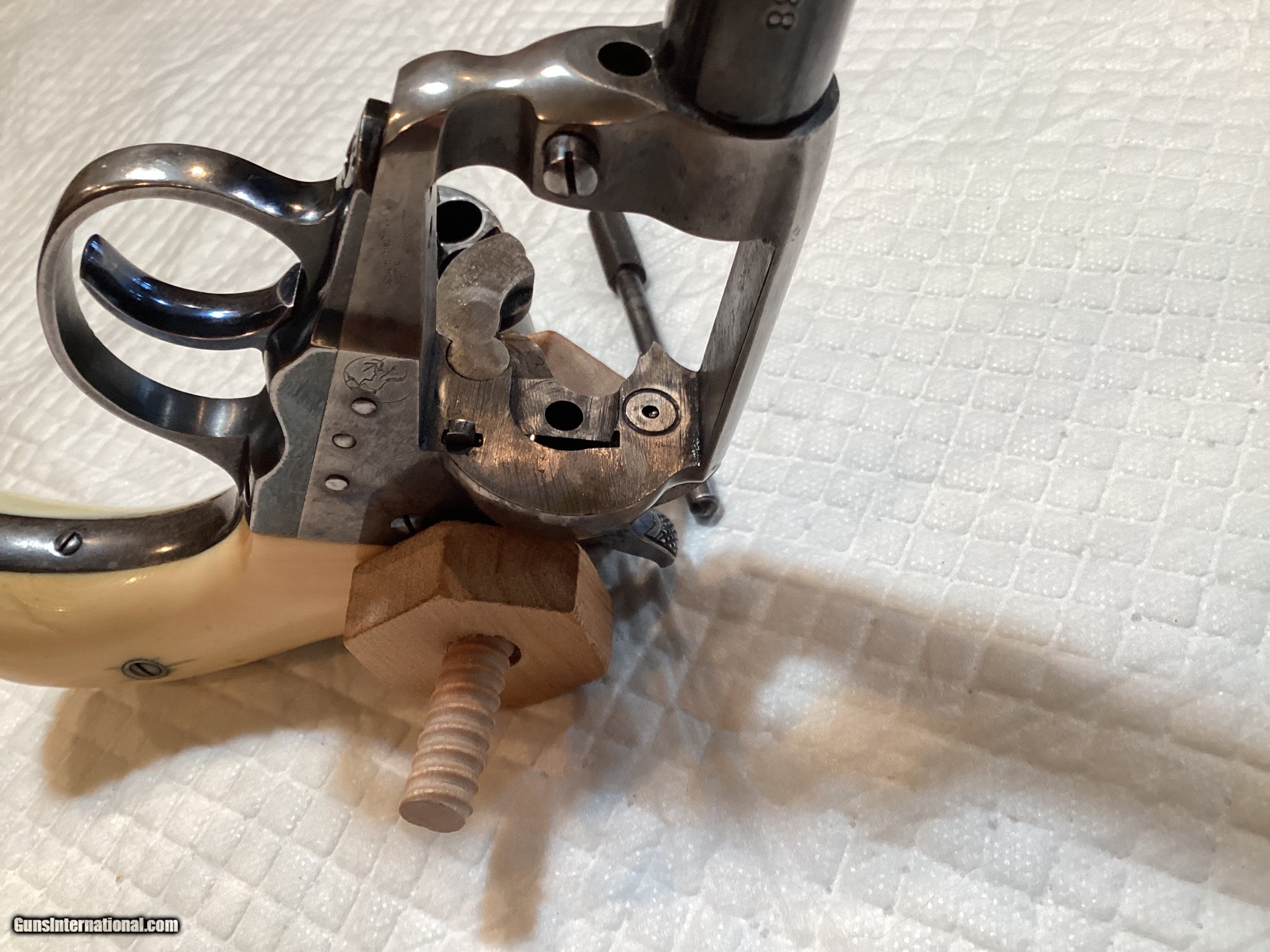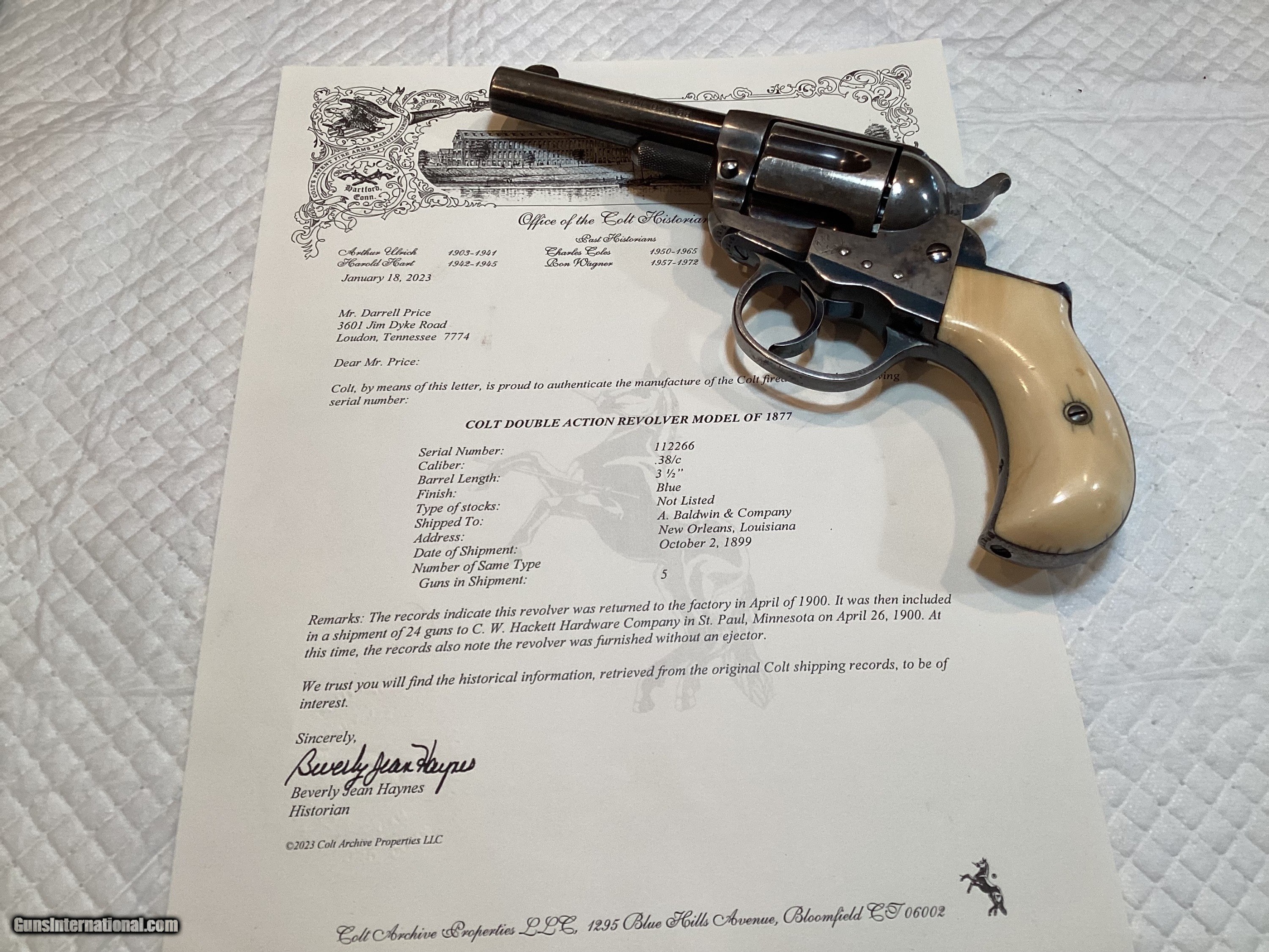 Description: Here is a beautiful Colt Double Action Model of 1877 .38 Lightning, accompanied by a Colt Letter of Authenticity. The story behind this revolver is that it was first sold by Colt to A. Baldwin & Co. in New Orleans, Louisiana on October 2, 1899. A. Baldwin was owner of a hardware store in New Orleans and became the first President of The First National Bank of New Orleans. It apparently was shipped to New Orleans without an ejector! Baldwin sent it back to Colt and Colt then sent it back out with a shipment of 24 guns to the C. W. Hackett Hardware Co. in St. Paul, MN., still without an ejector. The revolver has good looking IVORY GRIPS. If you know anything about ivory, you know it developed the lines you see on the grips as it ages. The grips are tight as they day they were put on originally. Colt comes with what is believed to be the original holster. Diffinately correct period holster if not original. ALL MATCHING SERIAL#s on the buttstrap, triggerguard strap, bottom of frame. The cylinder also shows the same number. The function is tight in both single and double action. Case colored with strong colors. Three line Patent date with strong bluing. All etchings are strong and visible. This revolver is all original and one that a collector of Colt vintage single and double action revolvers will appreciate and collect. While offers will be considered, this revolver is priced right for the Colt collector. Ships to lower 48 for $40. SOLD |