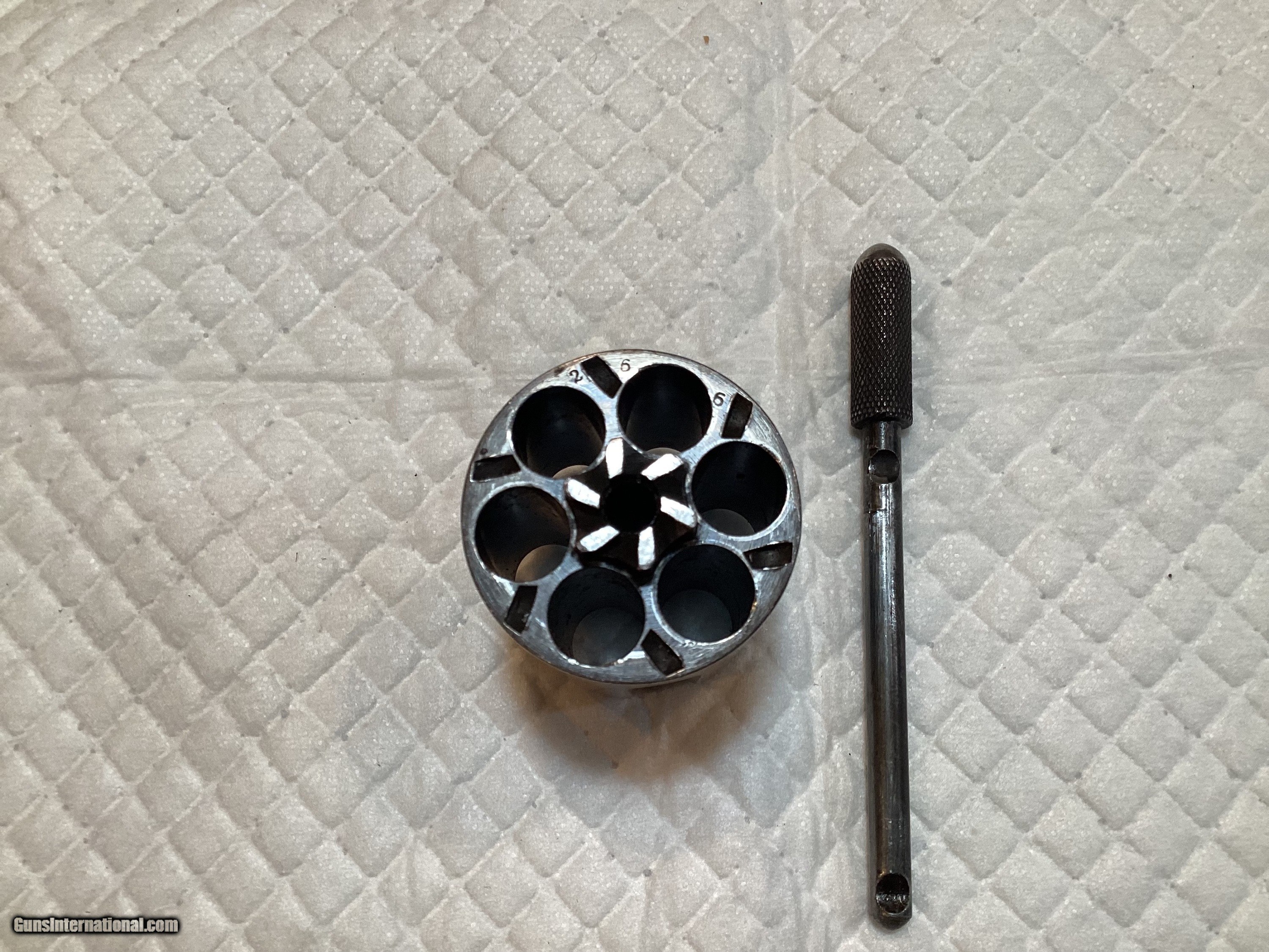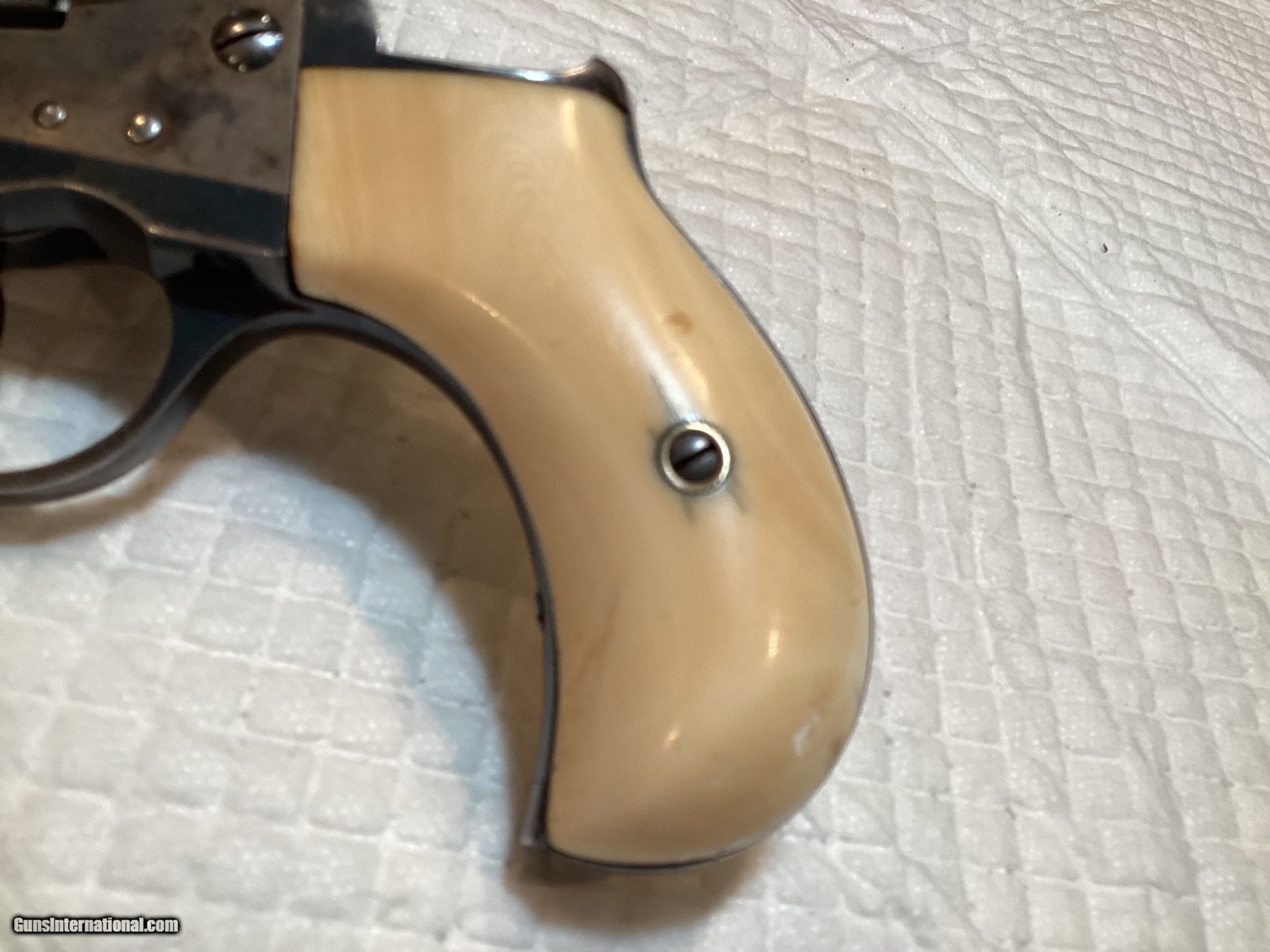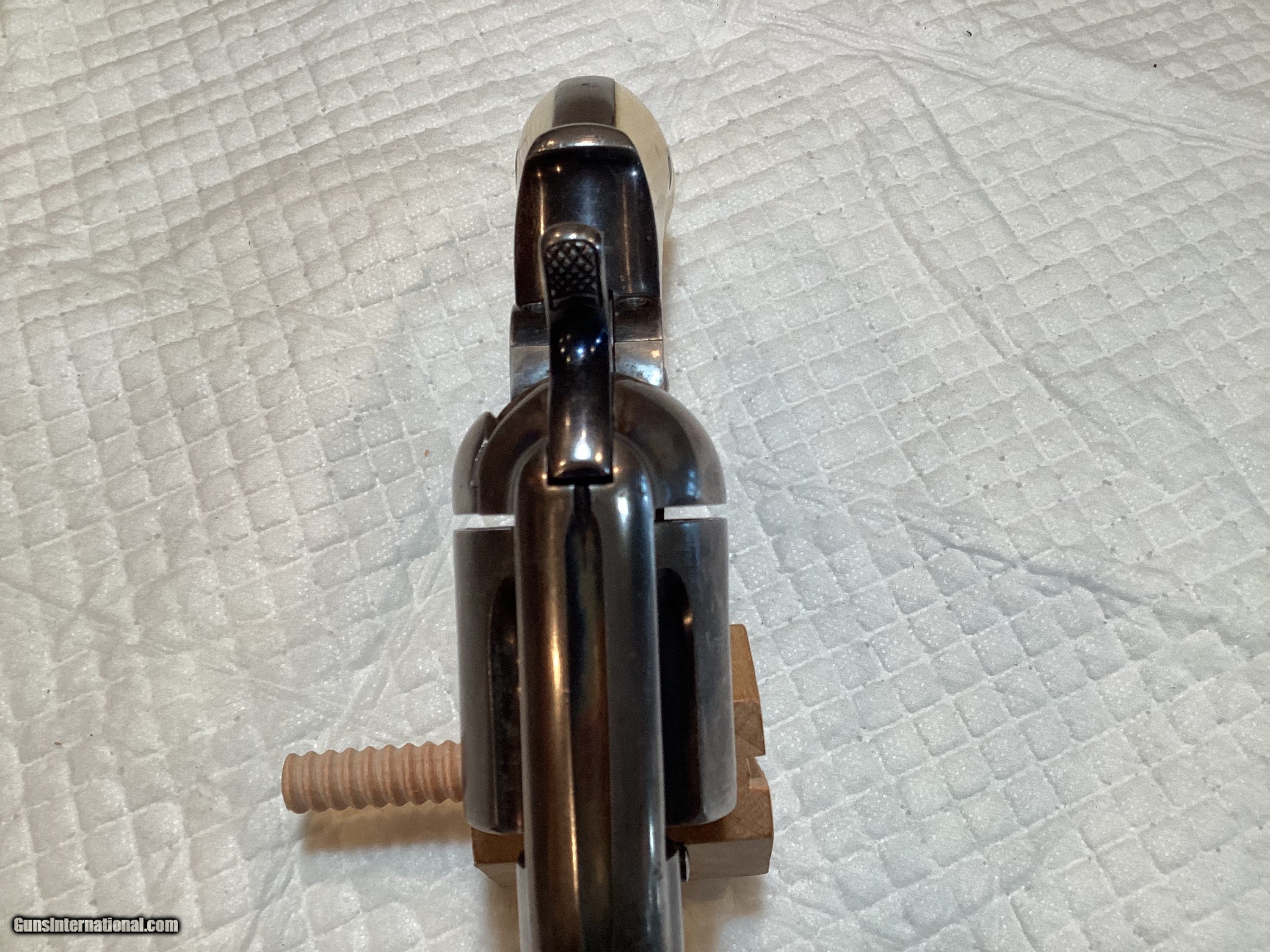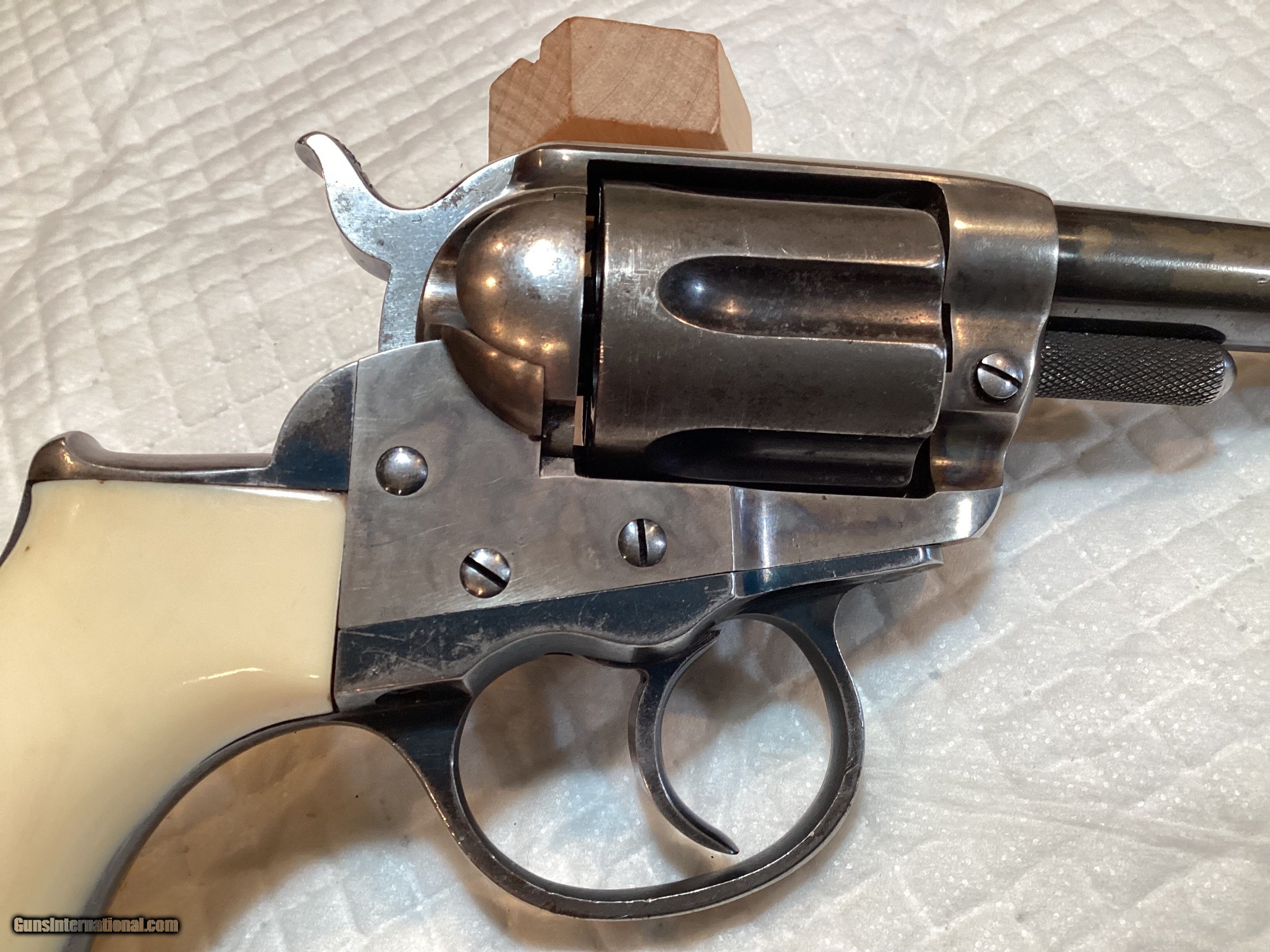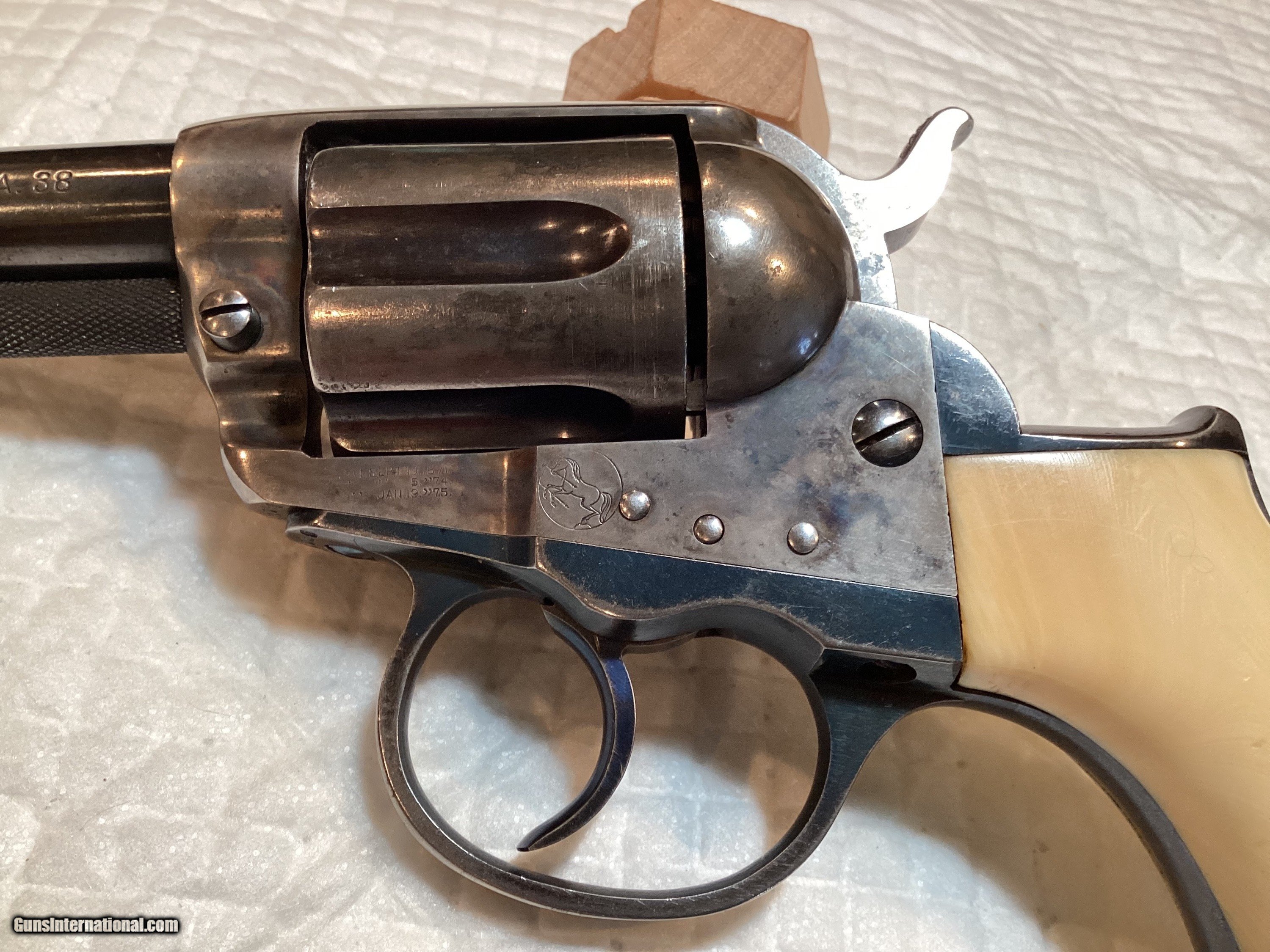 Description: Here is a beautiful Colt Double Action Model of 1877 .38 Lightning, accompanied by a Colt Letter of Authenticity. The story behind this revolver is that it was first sold by Colt to A. Baldwin & Co. in New Orleans, Louisiana on October 2, 1899. A. Baldwin was owner of a hardware store in New Orleans and became the first President of The First National Bank of New Orleans. It apparently was shipped to New Orleans without an ejector! Baldwin sent it back to Colt and Colt then sent it back out with a shipment of 24 guns to the C. W. Hackett Hardware Co. in St. Paul, MN., still without an ejector. The revolver has good looking IVORY GRIPS. If you know anything about ivory, you know it developed the lines you see on the grips as it ages. The grips are tight as they day they were put on originally. Colt comes with what is believed to be the original holster. Diffinately correct period holster if not original. ALL MATCHING SERIAL#s on the buttstrap, triggerguard strap, bottom of frame. The cylinder also shows the same number. The function is tight in both single and double action. Case colored with strong colors. Three line Patent date with strong bluing. All etchings are strong and visible. This revolver is all original and one that a collector of Colt vintage single and double action revolvers will appreciate and collect. While offers will be considered, this revolver is priced right for the Colt collector. Ships to lower 48 for $40. SOLD |