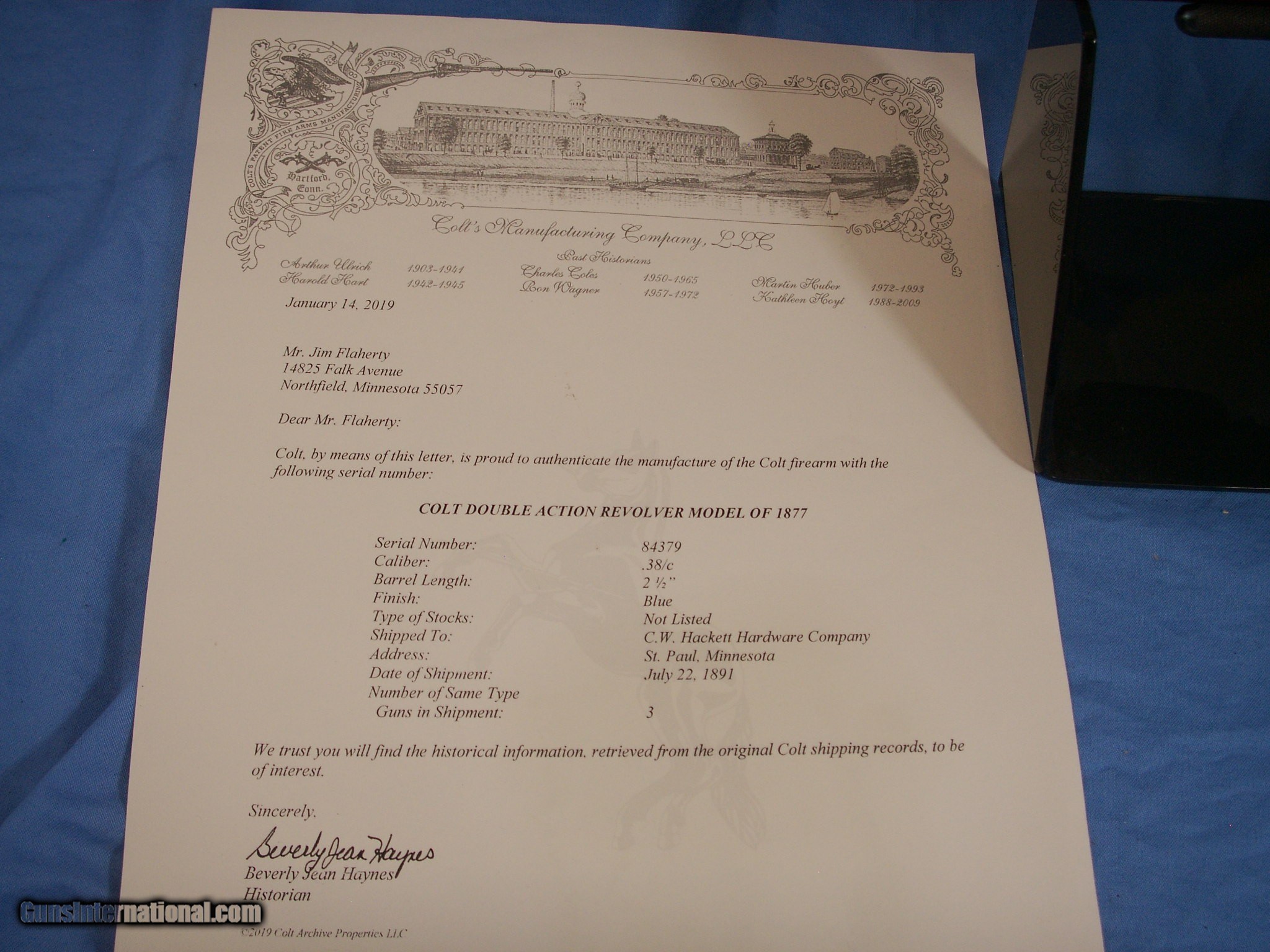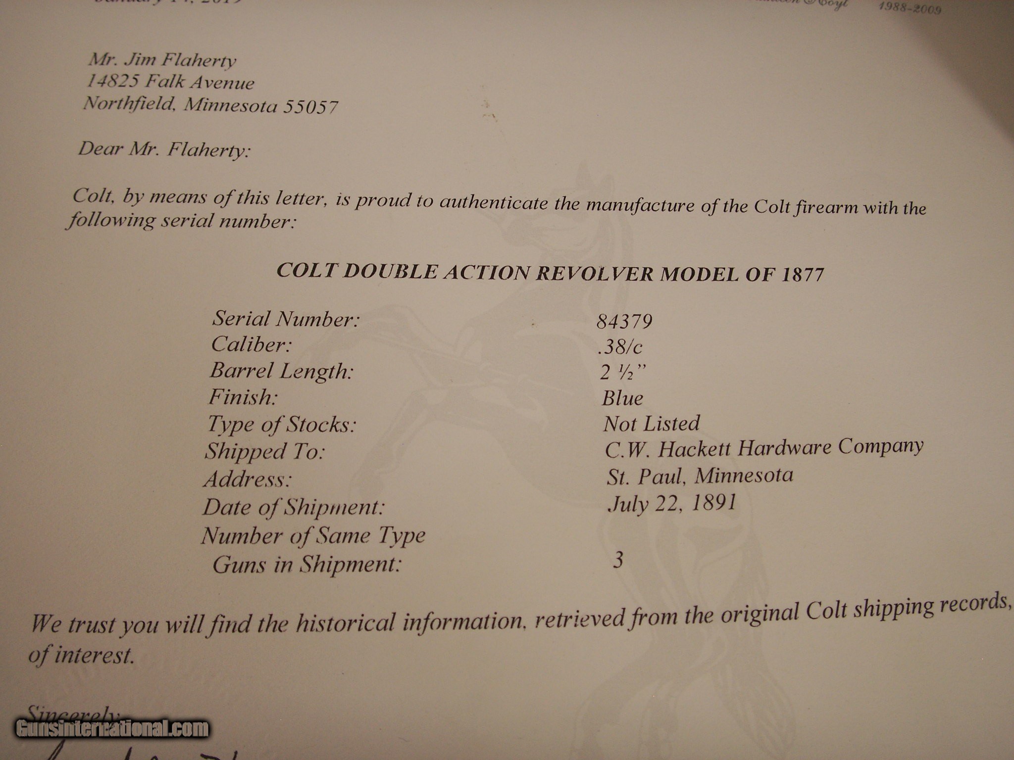Description: For Sale: Colt Model 1877 Lightning Double Action Revolver. This is the Storekeeper model in .38 /C caliber with a 2.5" barrel. It was manufactured in 1891 and therefore is considered an antique and requires no paper work to transfer. The mechanics work fine and the condition is rated about 90% original finish with plenty of case coloring and blue surviving. This has some handling marks, but is in excellent condition compared to the other short barrelled models available. The grips are original and in very good condition. This comes with a Colt letter attesting to going to St. Paul, Minnesota in July of 1891. Very collectable short barrel Store Keewper Model 1877 for your collection. SOLD Antique: Yes |