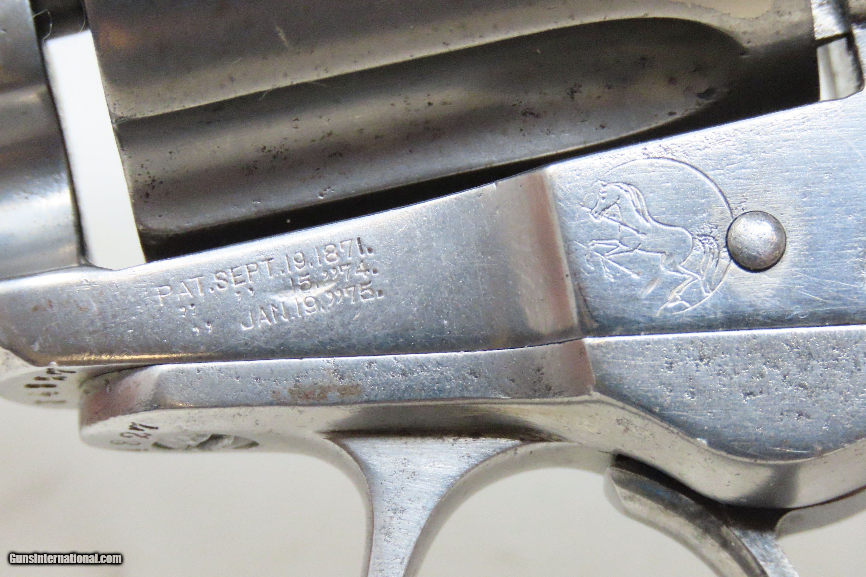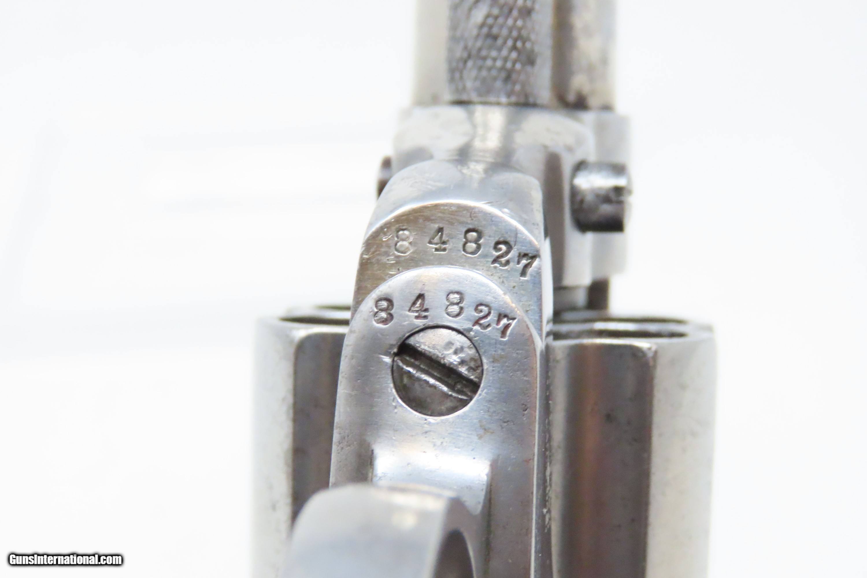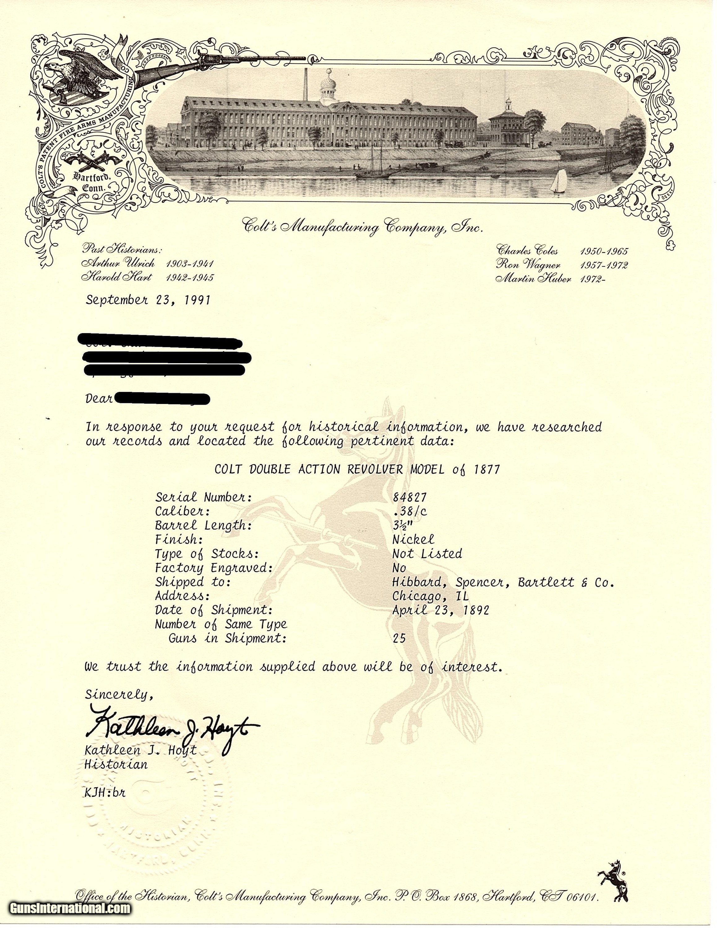 Description: LETTERED Antique COLT Model 1877 Lightning .38 Cal. Double Action Revolver INSCRIBED DA .38 Long Colt with NICKEL FINISH Here we present an antique Colt Model 1877 Lightning Double Action Revolver, made in 1891 in Hartford, Connecticut. This one has the name “J.A. McCAFFERY” on the backstrap and comes with a Colt archive letter that confirms the nickel finish, 3 ½” barrel length, chambering in .38 Colt, and a ship date of 23 April 1892 to Chicago, Illinois sporting goods and hardware store Hibbard, Spencer, Bartlett & Co. Chicago being a major junction on the railroad between the eastern and western US a lot of guns got bought here and taken out West on the frontier. What is interesting is that the letter from 1980 states that Colt could not locate the information that was found for the second letter, dated 1991. We did our best to identify J.A. McCaffery and we did find some candidates, such as in a political interview with a “merchant from Philadelphia” by that name “on the train, crossing the continent” 1 June 1894 in The Dunn County News from Menomonie, Wisconsin, but nothing certain. The Model 1877 was designed in 1876 by William Mason and was offered in three different calibers with production beginning in January 1877, which led to the three unofficial names. The first production model was the “Lightning”, in .38 Long Colt caliber. Later that year, Colt came out with the .41 Long Colt caliber called the “Thunderer”. The .32 Long Colt caliber, called the “Rainmaker”, didn’t go into production until sometime in 1887. Benjamin Kittredge, the largest Colt Distributor in Cincinnati, Ohio, coined the nicknames for these guns as a marketing tool. He was also responsible for calling the Model 1873 Single Action Army the “Peacemaker”. None of the nicknames were ever used by the factory in any reference materials. The 1877 "Thunderer” in .41 caliber was the preferred weapon of Billy the Kid and was his weapon of choice when he was killed by Pat Garret in 1881. The overall condition is good. Original nickel finish. The action (hammer/trigger) are strong in double and single action—the hammer holding all 3 notches, but the timing of the cylinder is off. The bore is clean and in good shape with nice rifling. The rampant Colt grips are in nice shape and solid. Numbers match. Own the original! This is a legitimate antique and not a reproduction. Barrel is 3-1/2 inches. Caliber: .38 Long Colt Overall condition as seen in photos. Very Fast. Very Safe. FREE SHIPPING WORLDWIDE. Delivered directly to your door by express mail! Guaranteed AUTHENTIC & Includes CERTIFICATE OF AUTHENTICITY. ancestryguns $2400 #228602 SOLD Antique: Yes |