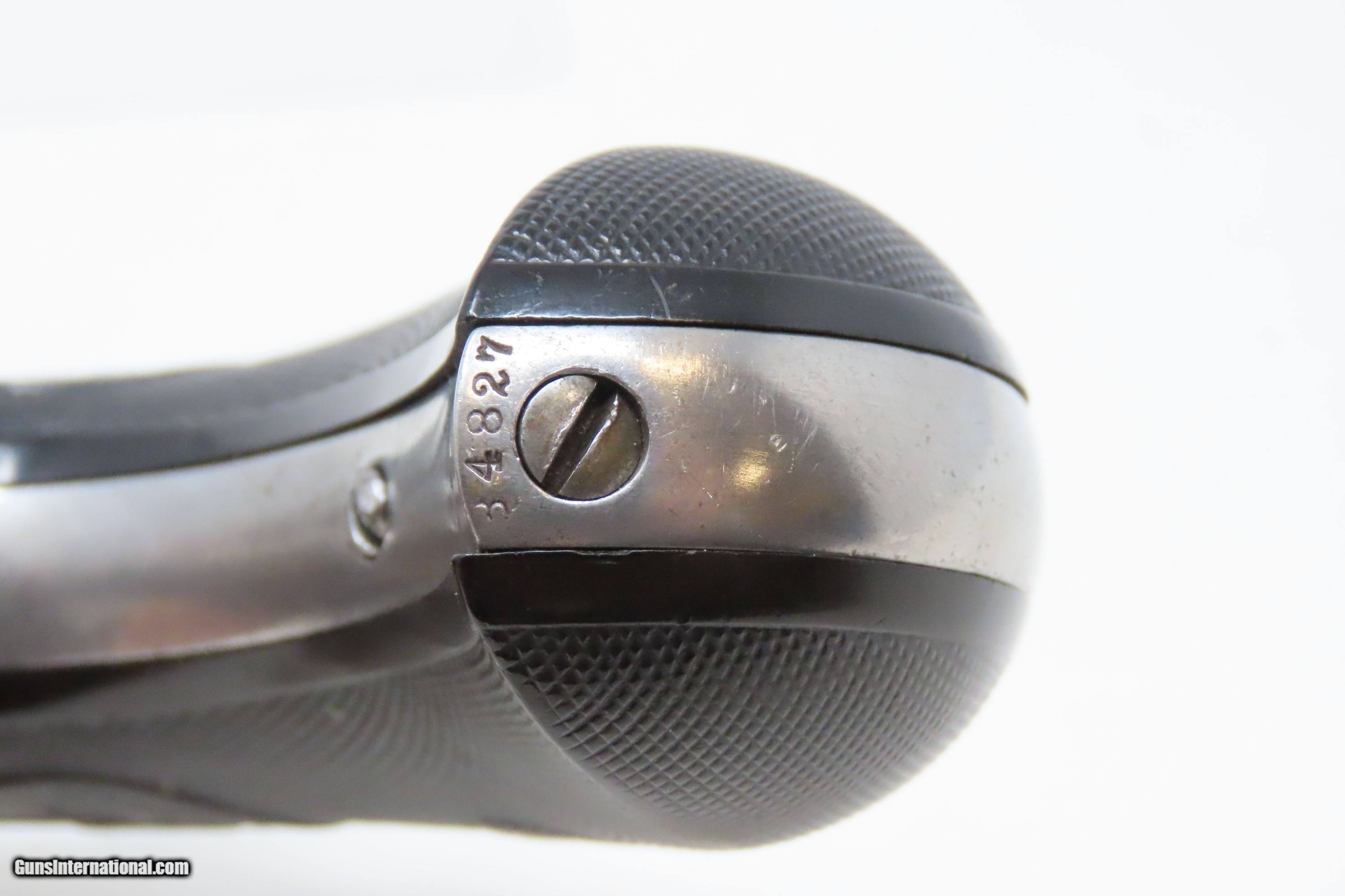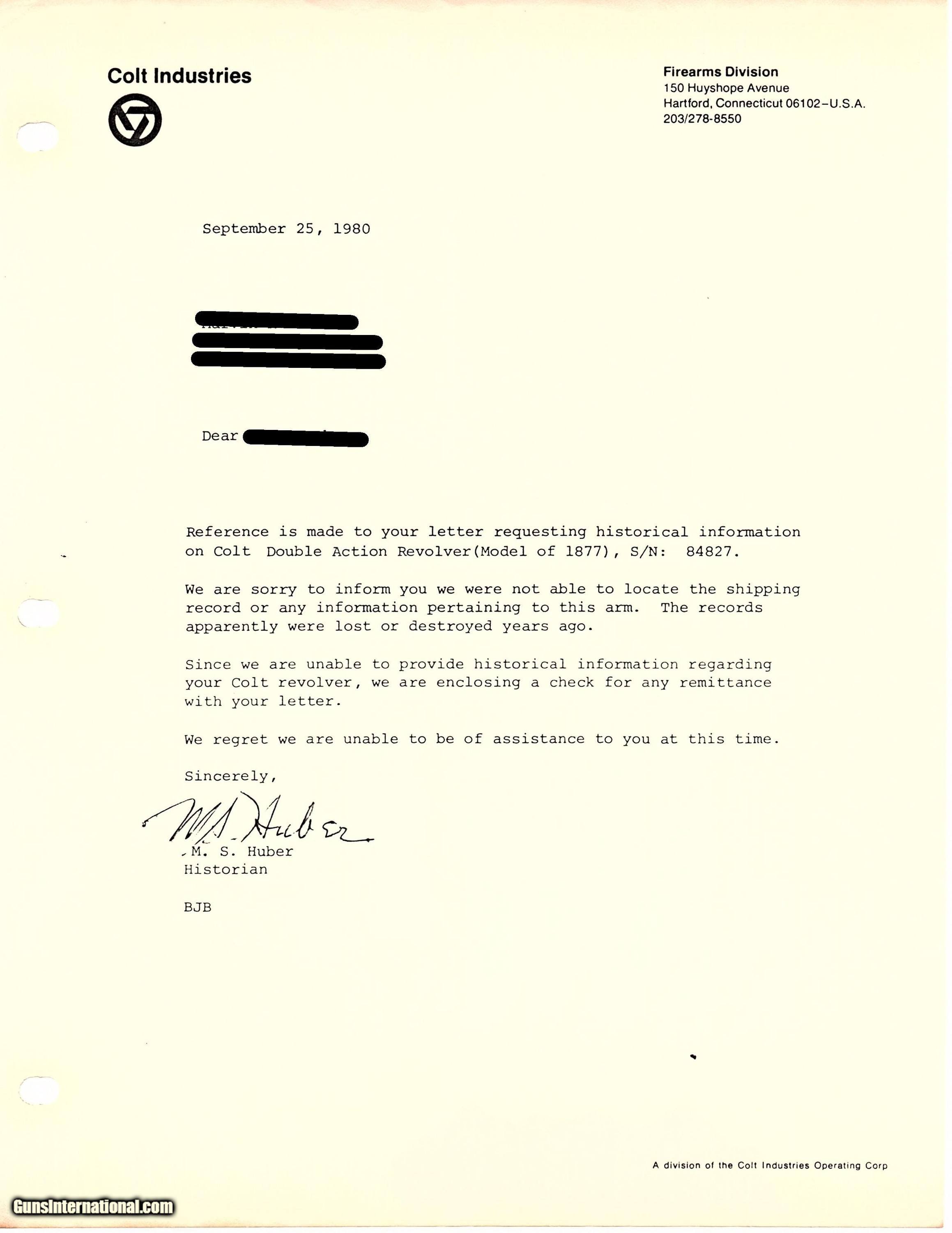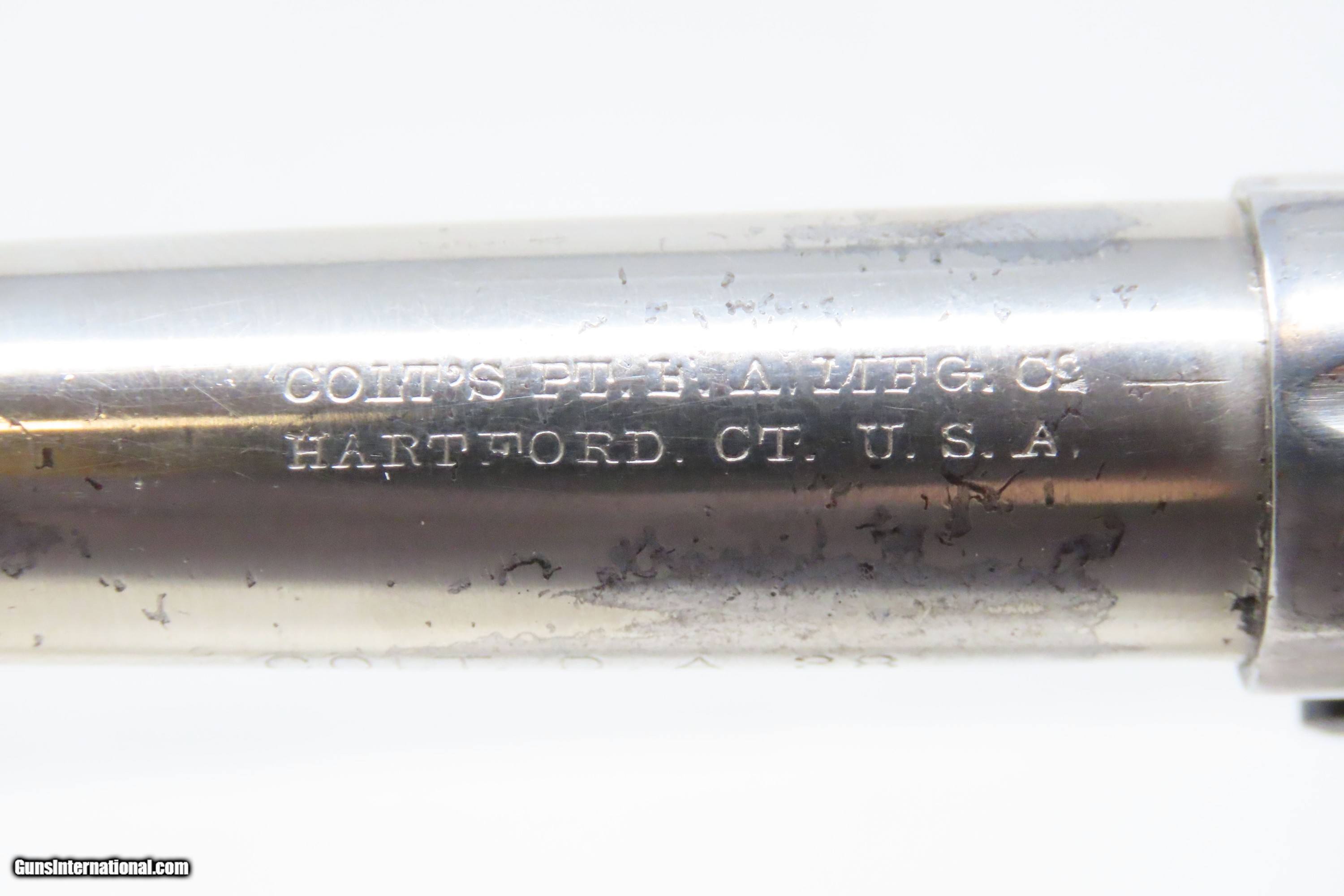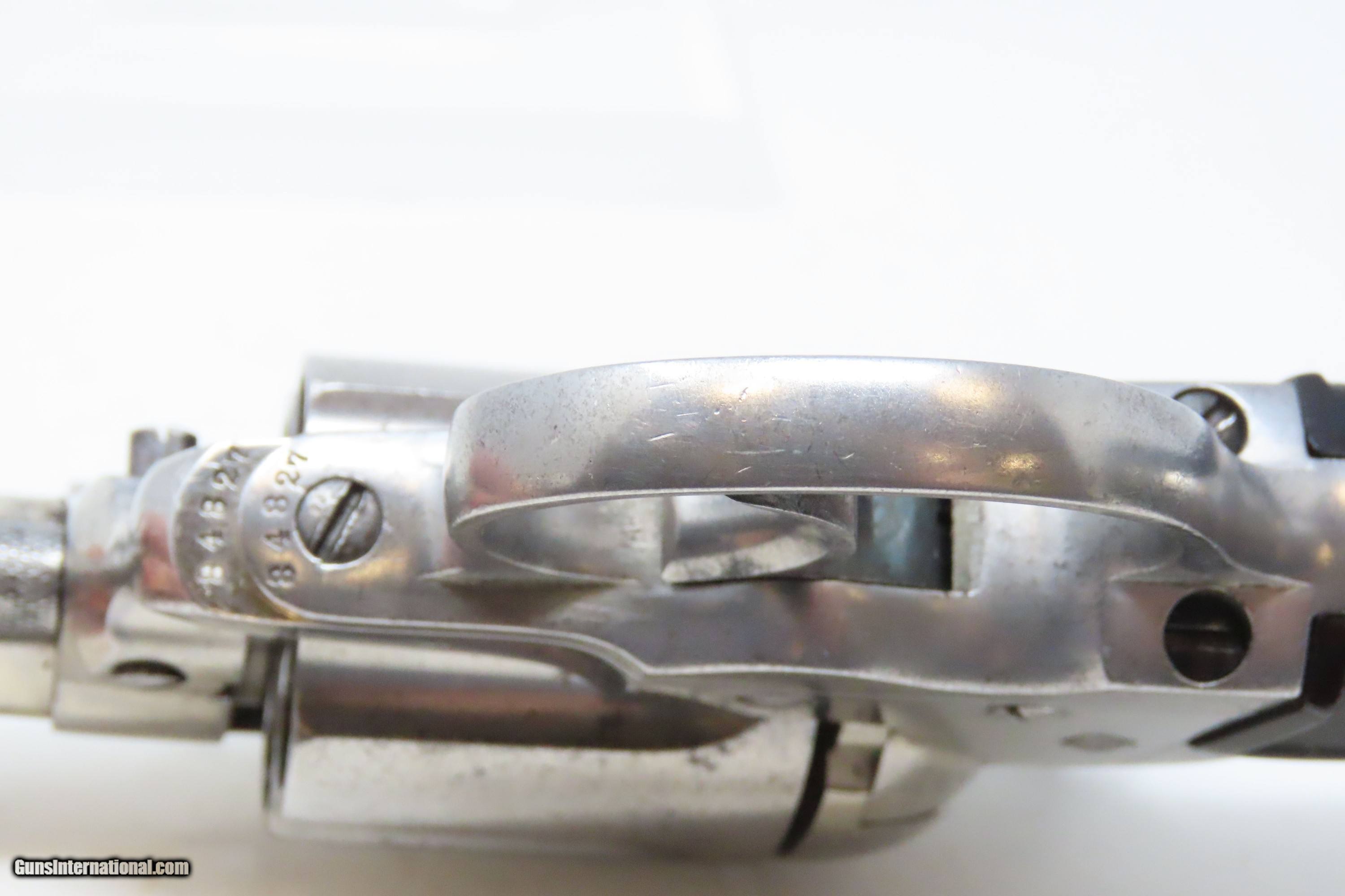 Description: LETTERED Antique COLT Model 1877 Lightning .38 Cal. Double Action Revolver INSCRIBED DA .38 Long Colt with NICKEL FINISH Here we present an antique Colt Model 1877 Lightning Double Action Revolver, made in 1891 in Hartford, Connecticut. This one has the name “J.A. McCAFFERY” on the backstrap and comes with a Colt archive letter that confirms the nickel finish, 3 ½” barrel length, chambering in .38 Colt, and a ship date of 23 April 1892 to Chicago, Illinois sporting goods and hardware store Hibbard, Spencer, Bartlett & Co. Chicago being a major junction on the railroad between the eastern and western US a lot of guns got bought here and taken out West on the frontier. What is interesting is that the letter from 1980 states that Colt could not locate the information that was found for the second letter, dated 1991. We did our best to identify J.A. McCaffery and we did find some candidates, such as in a political interview with a “merchant from Philadelphia” by that name “on the train, crossing the continent” 1 June 1894 in The Dunn County News from Menomonie, Wisconsin, but nothing certain. The Model 1877 was designed in 1876 by William Mason and was offered in three different calibers with production beginning in January 1877, which led to the three unofficial names. The first production model was the “Lightning”, in .38 Long Colt caliber. Later that year, Colt came out with the .41 Long Colt caliber called the “Thunderer”. The .32 Long Colt caliber, called the “Rainmaker”, didn’t go into production until sometime in 1887. Benjamin Kittredge, the largest Colt Distributor in Cincinnati, Ohio, coined the nicknames for these guns as a marketing tool. He was also responsible for calling the Model 1873 Single Action Army the “Peacemaker”. None of the nicknames were ever used by the factory in any reference materials. The 1877 "Thunderer” in .41 caliber was the preferred weapon of Billy the Kid and was his weapon of choice when he was killed by Pat Garret in 1881. The overall condition is good. Original nickel finish. The action (hammer/trigger) are strong in double and single action—the hammer holding all 3 notches, but the timing of the cylinder is off. The bore is clean and in good shape with nice rifling. The rampant Colt grips are in nice shape and solid. Numbers match. Own the original! This is a legitimate antique and not a reproduction. Barrel is 3-1/2 inches. Caliber: .38 Long Colt Overall condition as seen in photos. Very Fast. Very Safe. FREE SHIPPING WORLDWIDE. Delivered directly to your door by express mail! Guaranteed AUTHENTIC & Includes CERTIFICATE OF AUTHENTICITY. ancestryguns $2400 #228602 SOLD Antique: Yes |