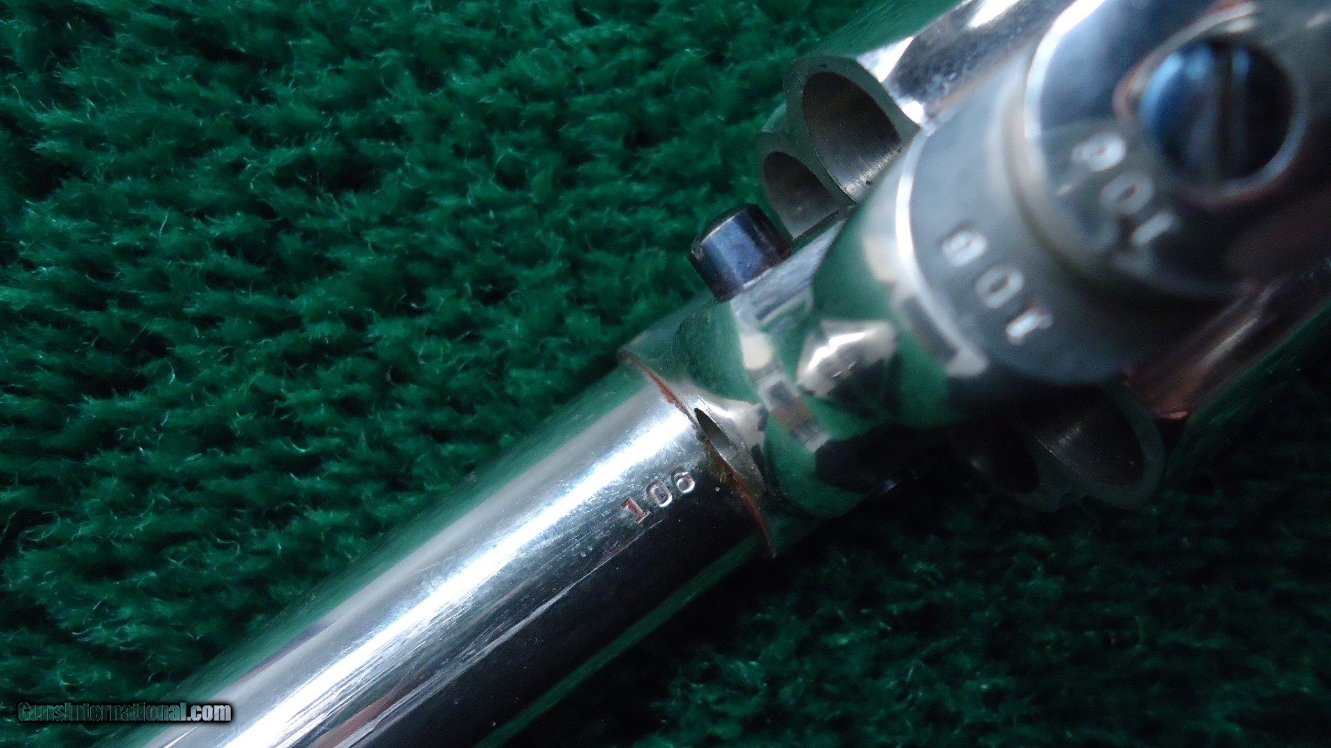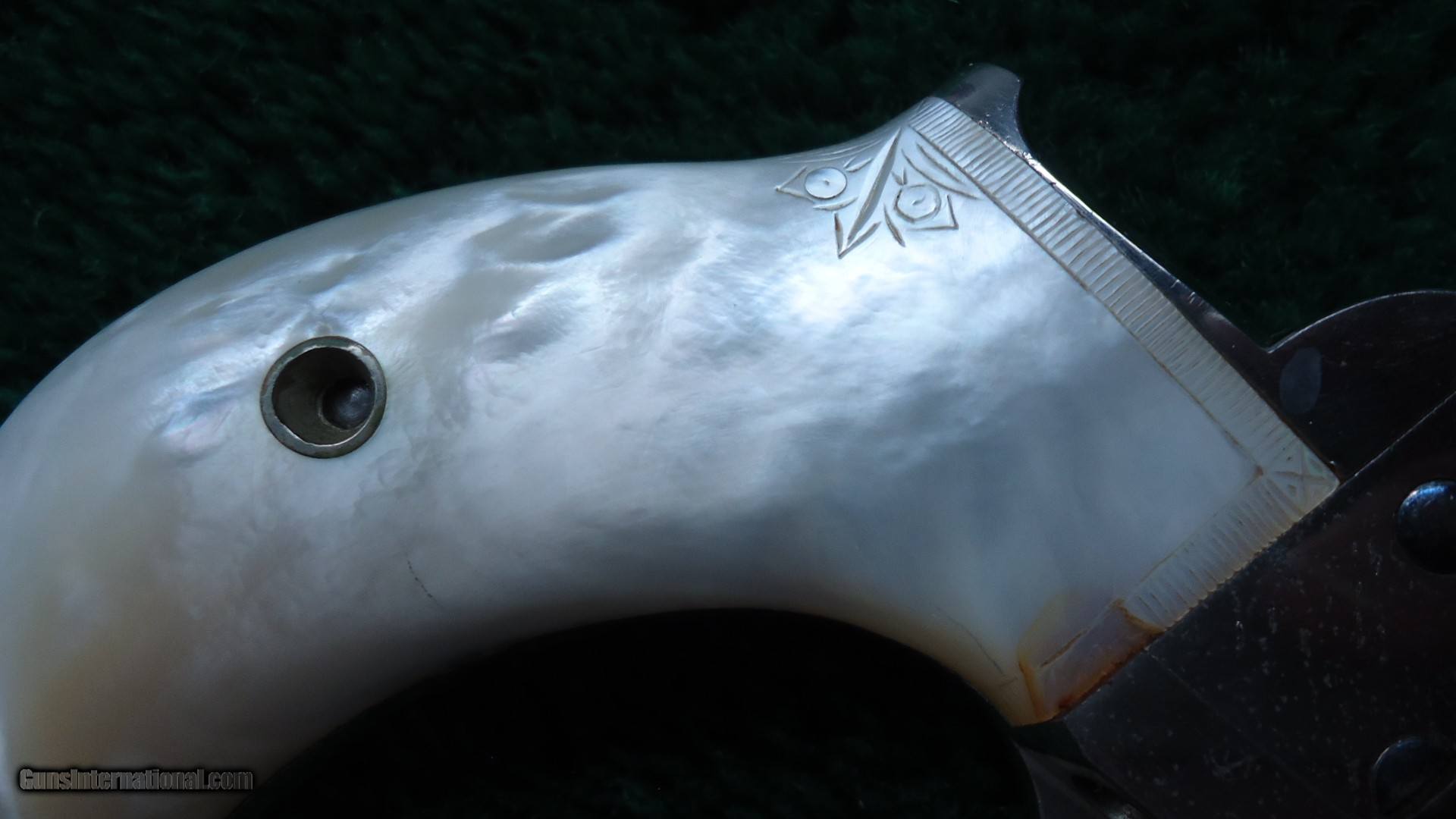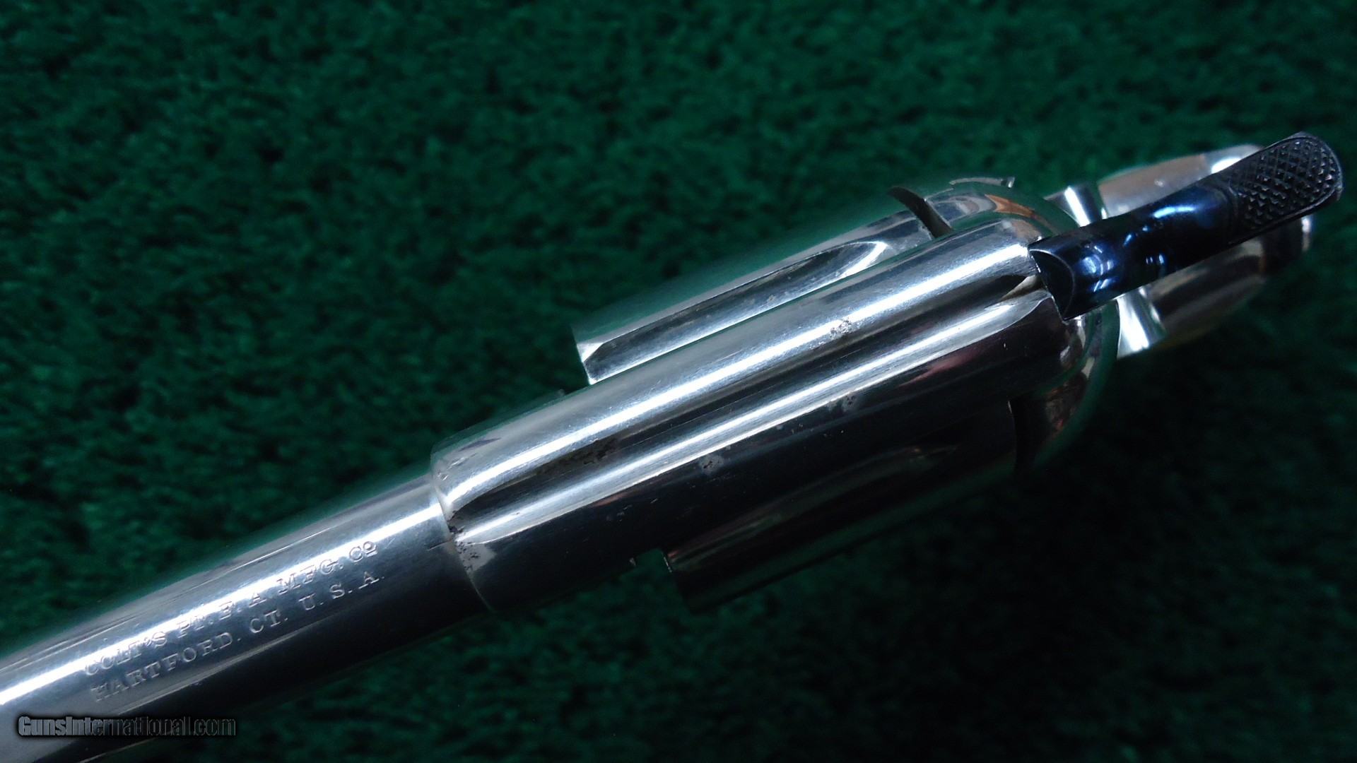 Description: Serial number 106 first year production Model 1877 Colt DA revolver with 3-1/2 inch round barrel chambered in caliber 38 Colt. Features carved Mother of Pearl grips and full nickel plating. Most all the original nickel finish is intact as well as the Colt fire blue on the hammer, trigger and screws. COLT D.A.38 etched panel on the barrel. Fitted in a deluxe compartment-ed case. The corners are brass and there is a name plaque on the top that says " E.W. Freeman Presented by his friends Tuesday Feb. 27,1877". The case is in fine condition. Showing some wear on the inside. The outside is beautiful. This is a nice little 6 shot double action Colt. Comes with a Box of 38 caliber ammo. A real time capsule from 1877! This would be a good one to investigate for some more history on the gun. Leroy Merz Antique Firearms specializes in antique and vintage Winchesters and other fine American firearms. Since 1965 Mr. Merz has taken part in the world of firearms and has been a contributor to many well known reference books. We have hundreds of additional guns in every price range at our home online. Search for Merz Antiques in google. SOLD Antique: Yes Handgun Caliber: .38 Long Colt |