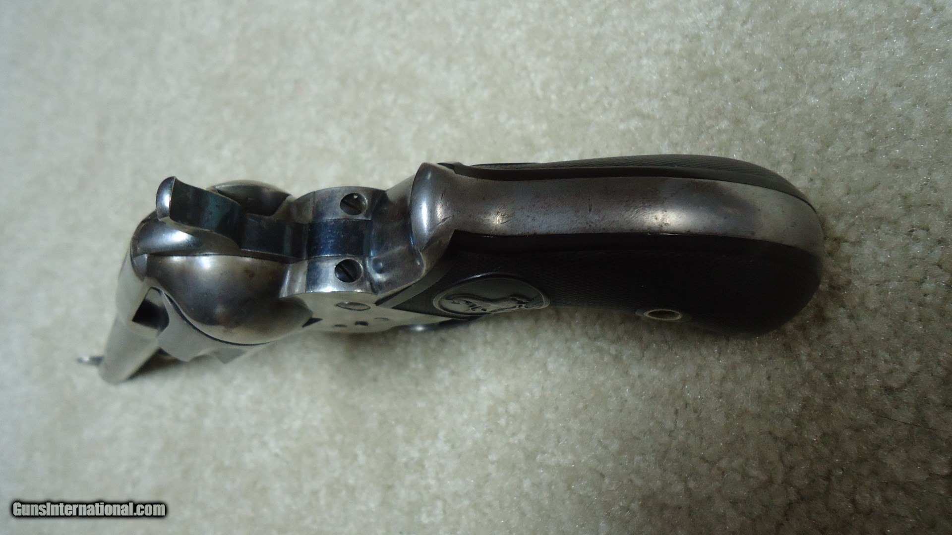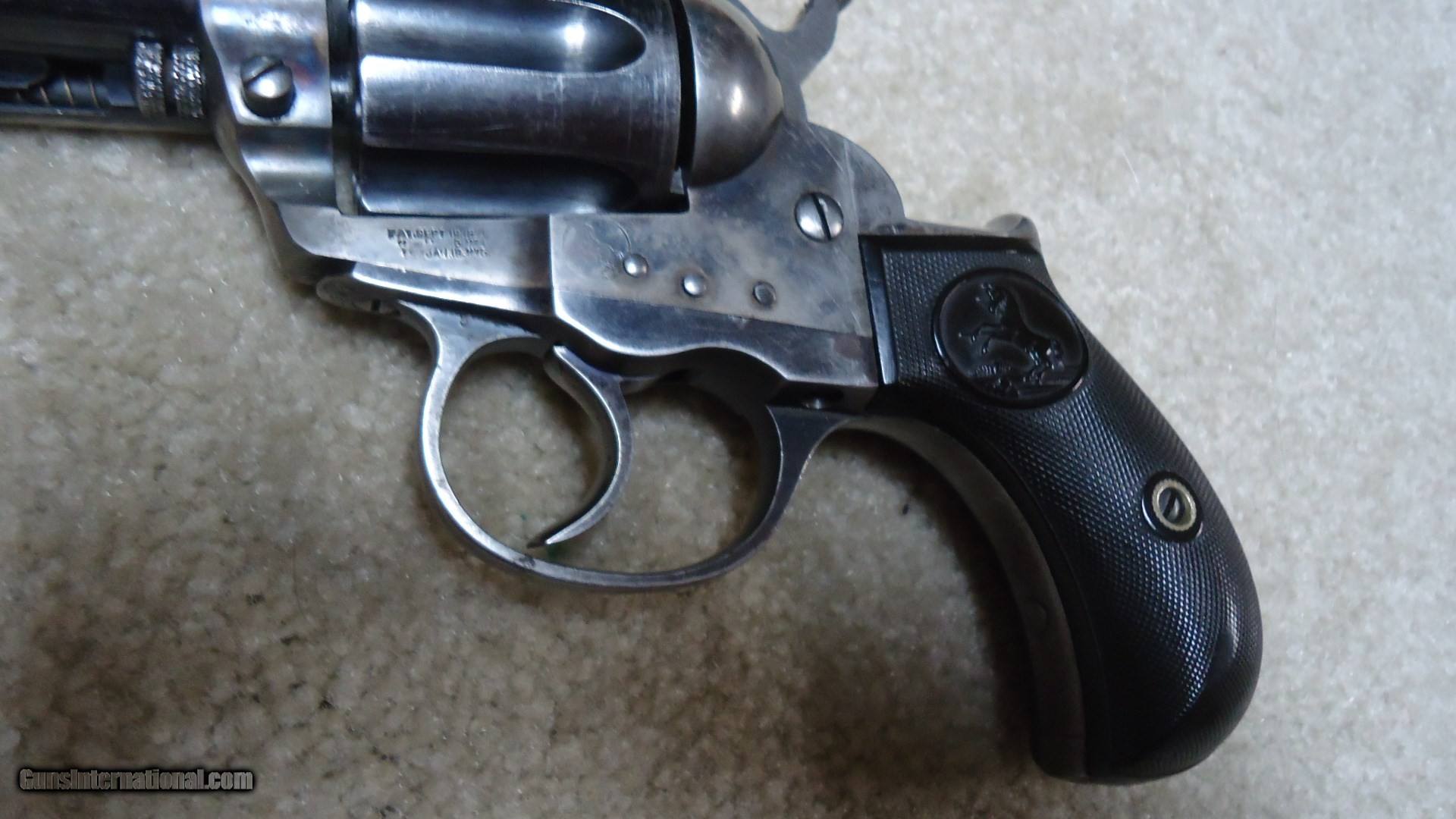 Description: VERY FINE LIGHTNING .38 COLT CALIBER DOUBLE ACTION WITH SCARCE AND DESIRABLE 6” BARREL AND EJECTOR, #151XXX, MADE 1904. A really nice example with excellent tight action (these often not functioning properly). Matching serial numbers. Most of the cylinder blue remains as does the barrel blue with only the usual silver streak down the left side of the barrel and on the outside of the ejector housing- typical of long barrel holster revolvers. Bright fire blue on the top back half of the hammer with the front section fading. Grip straps mostly silvered with nice blue on the sides of the trigger guard, still shows good faded and cloudy case colors with more vivid colors in the protected areas. Minty sharp bore and unaltered front sight, exc. grips. Very hard to find Lightnings in this condition especially in the long barrel with ejector models. SOLD Curio/Relic: Yes Manufacturer: COLT Model: LIGHTNING REVOLVER WITH EJECTOR Serial Number: 151XXX Caliber Info: ,38 COLT Condition: FINE+ Barrels: 6 |