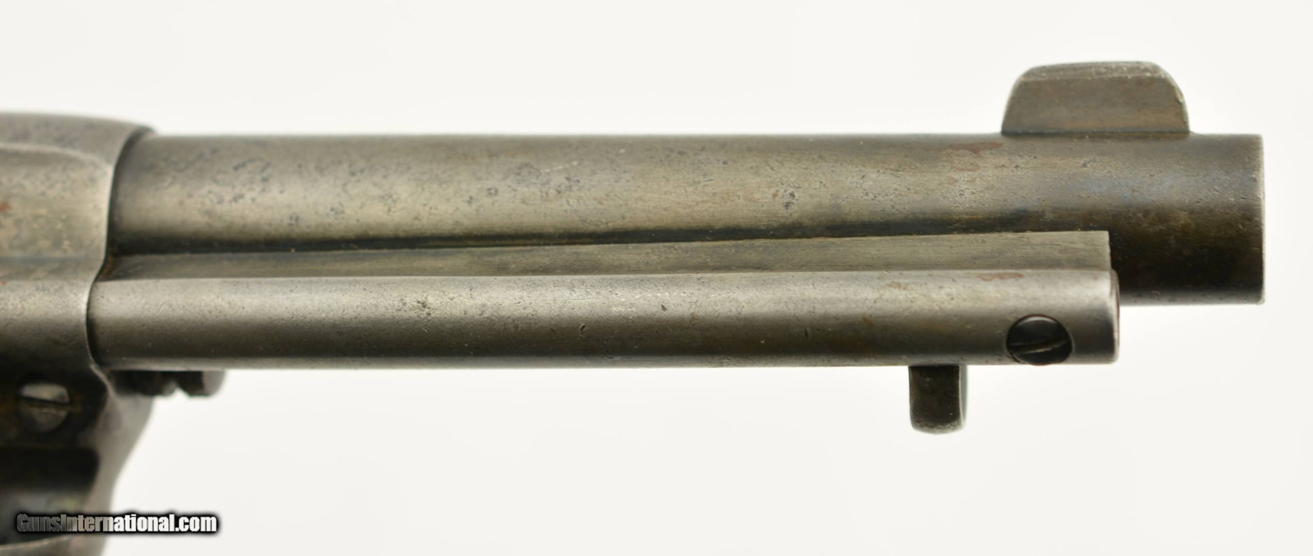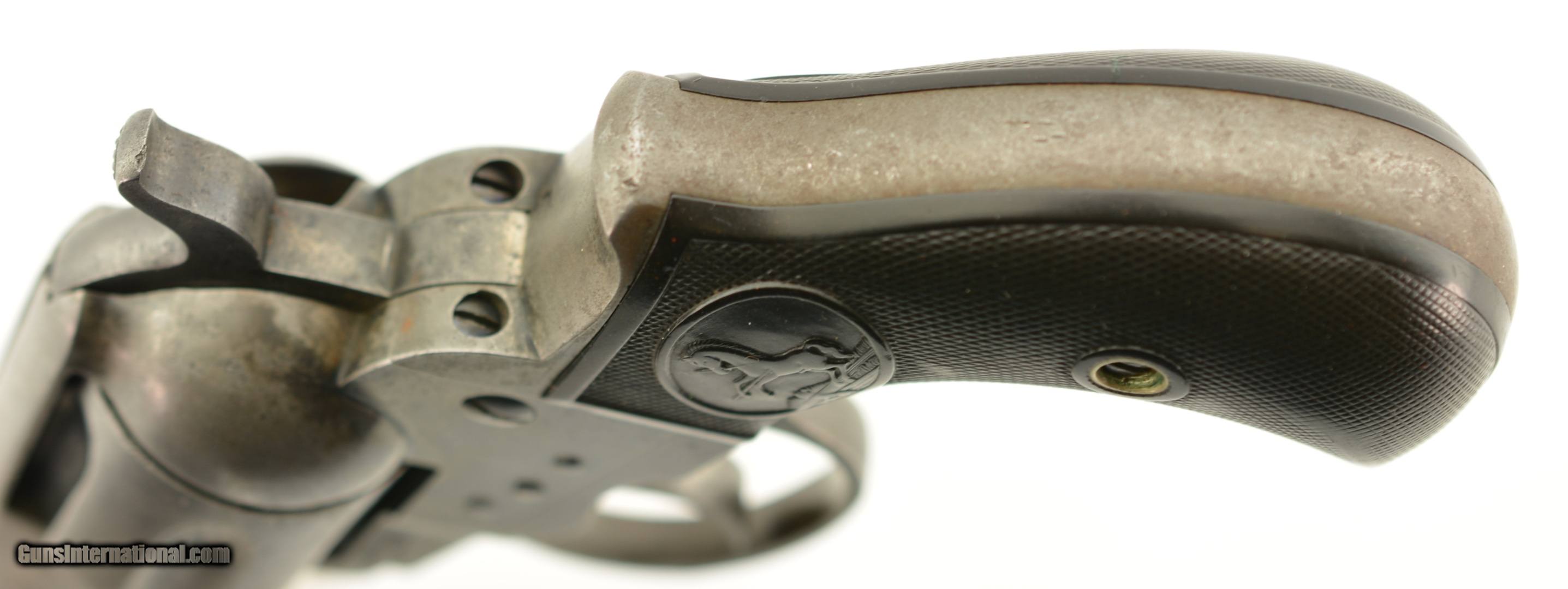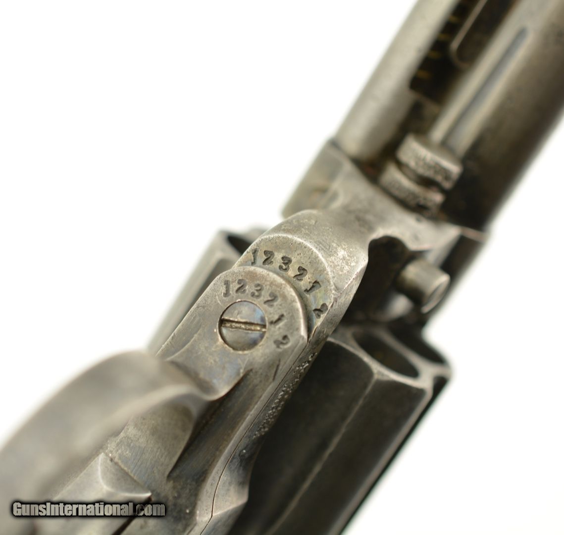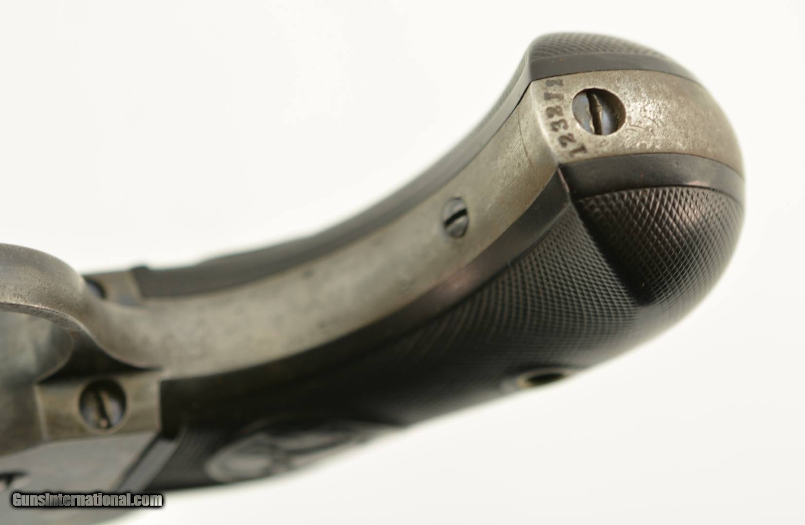 Description: Serial #123212, .38 Colt, 4 1/2" barrel with a good bore that has some minor freckling and pitting within the grooves. This is a 1901-made revolver that has all matching numbers on the frame, cylinder, trigger guard, and backstrap, with the metal having an overall mottled dark gray patina, and traces of original blue on protected areas. Additionally, there are small spots of freckling and pinprick pitting on the barrel, rear of the frame, on the sides of the hammer, and the front sight blade has been regulated. The checkered, hard rubber grips are in very good-near fine shape, and have minor wear and flattening of the points on either side. The action still locks up tightly, and is fully functional in both single and double-action. This is a very good-near fine example of a desirable Colt Lightning overall. FFL or C&R SOLD Curio/Relic: Yes |