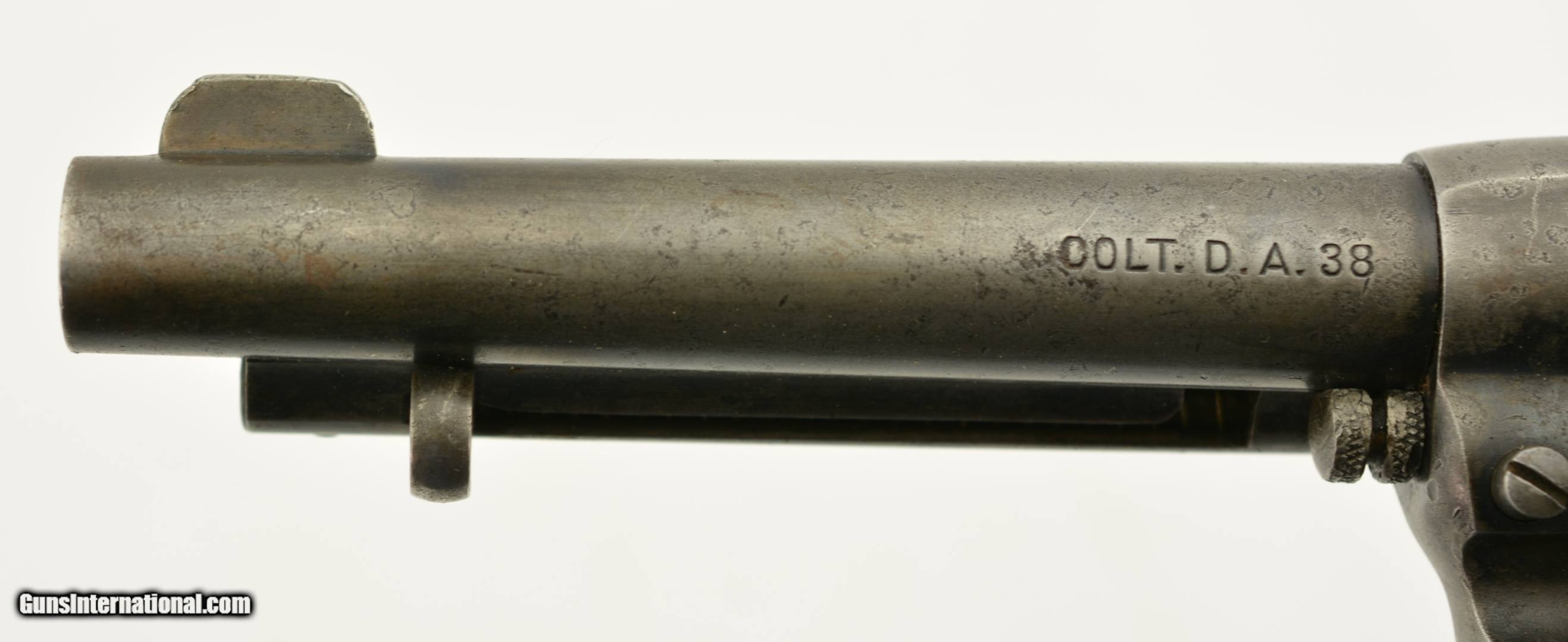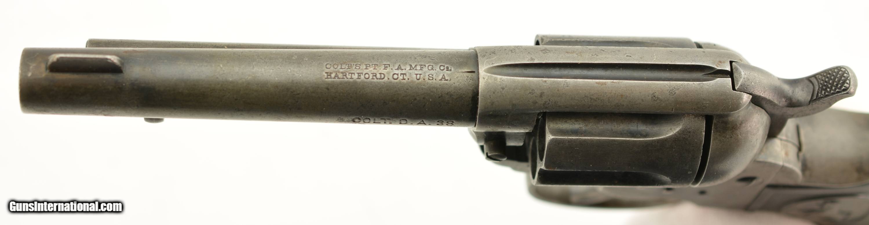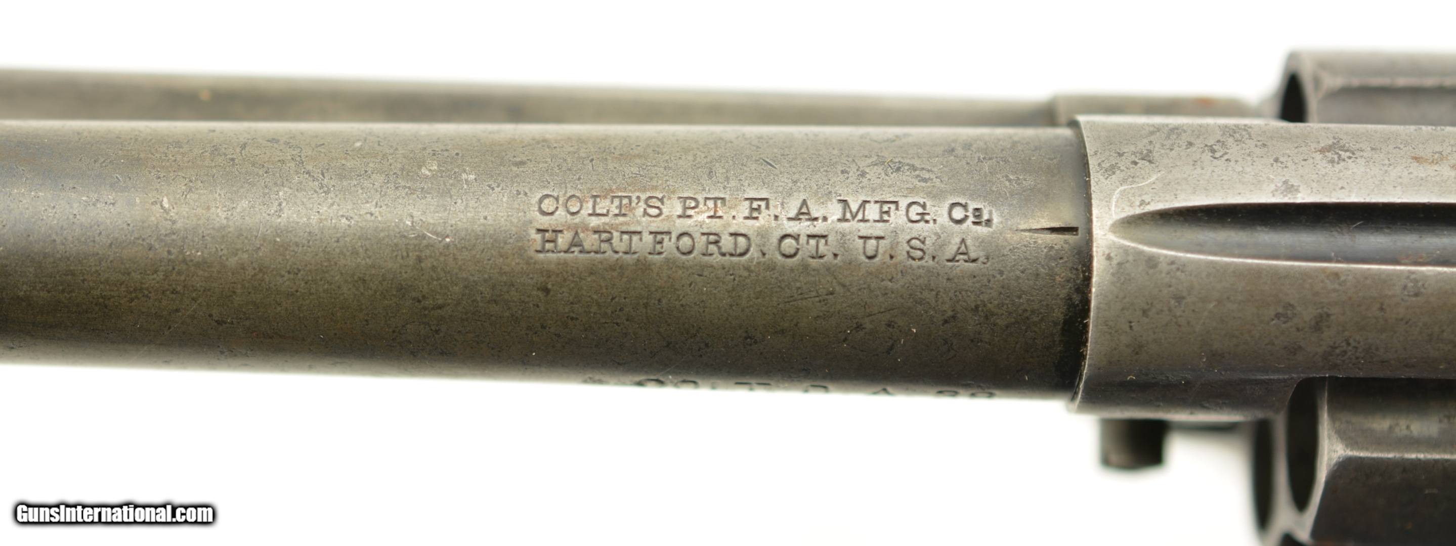 Description: Serial #123212, .38 Colt, 4 1/2" barrel with a good bore that has some minor freckling and pitting within the grooves. This is a 1901-made revolver that has all matching numbers on the frame, cylinder, trigger guard, and backstrap, with the metal having an overall mottled dark gray patina, and traces of original blue on protected areas. Additionally, there are small spots of freckling and pinprick pitting on the barrel, rear of the frame, on the sides of the hammer, and the front sight blade has been regulated. The checkered, hard rubber grips are in very good-near fine shape, and have minor wear and flattening of the points on either side. The action still locks up tightly, and is fully functional in both single and double-action. This is a very good-near fine example of a desirable Colt Lightning overall. FFL or C&R SOLD Curio/Relic: Yes |