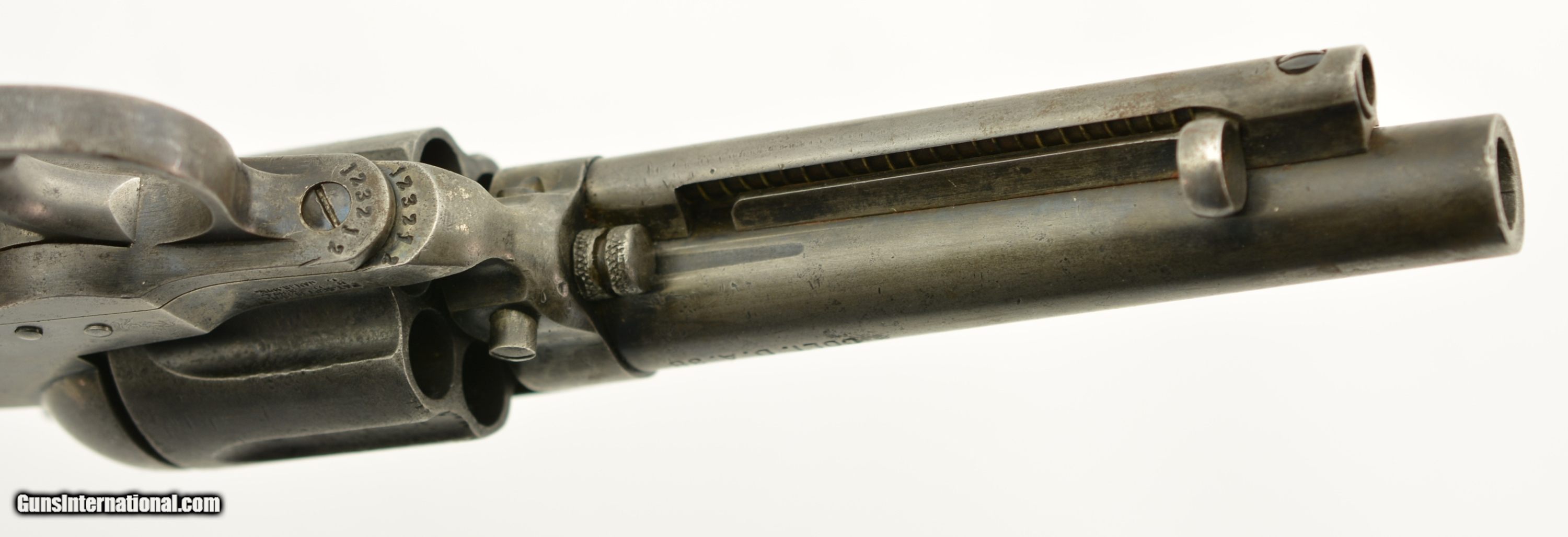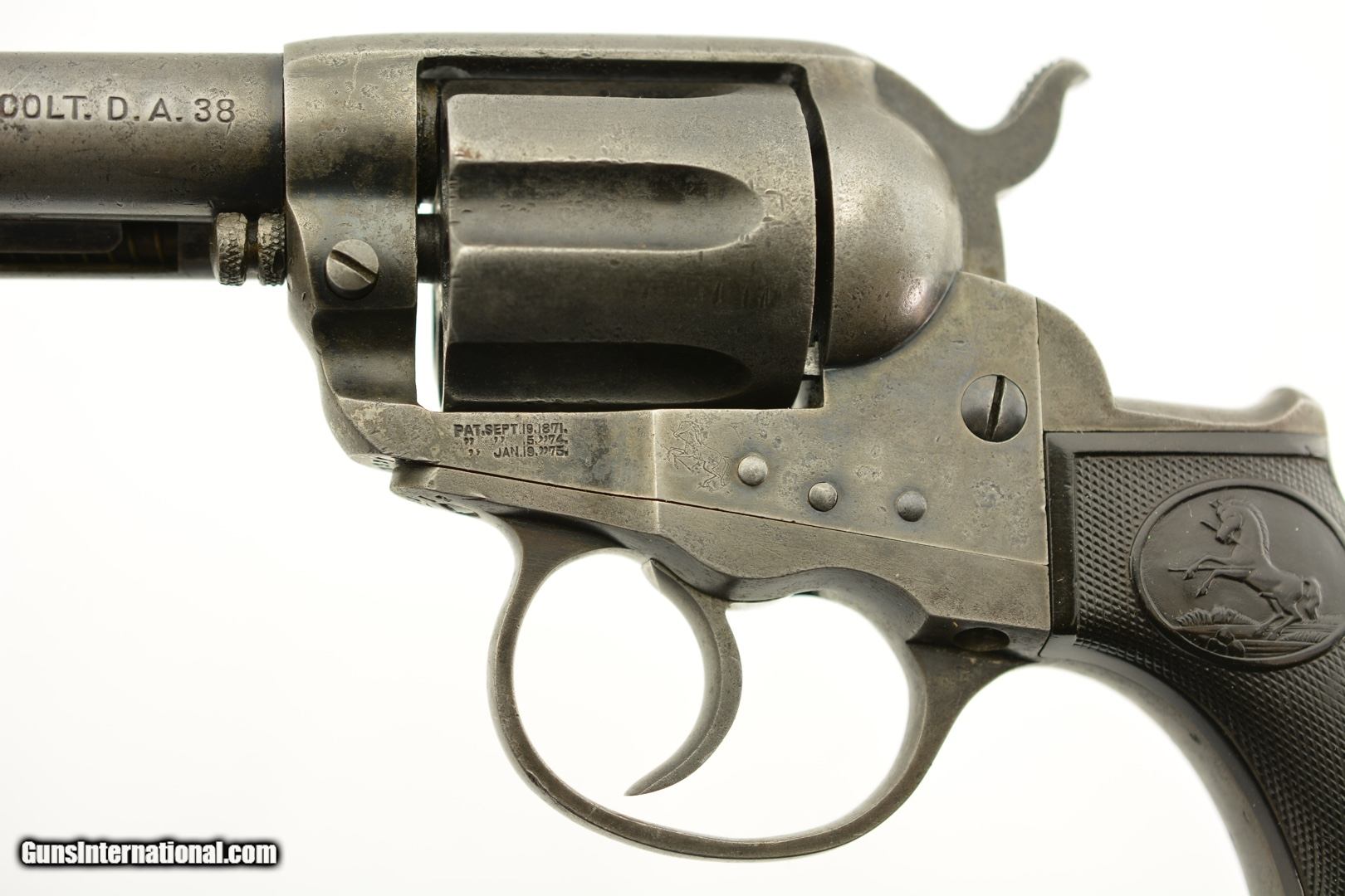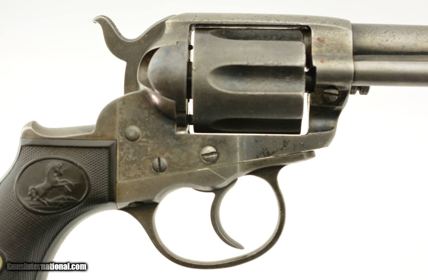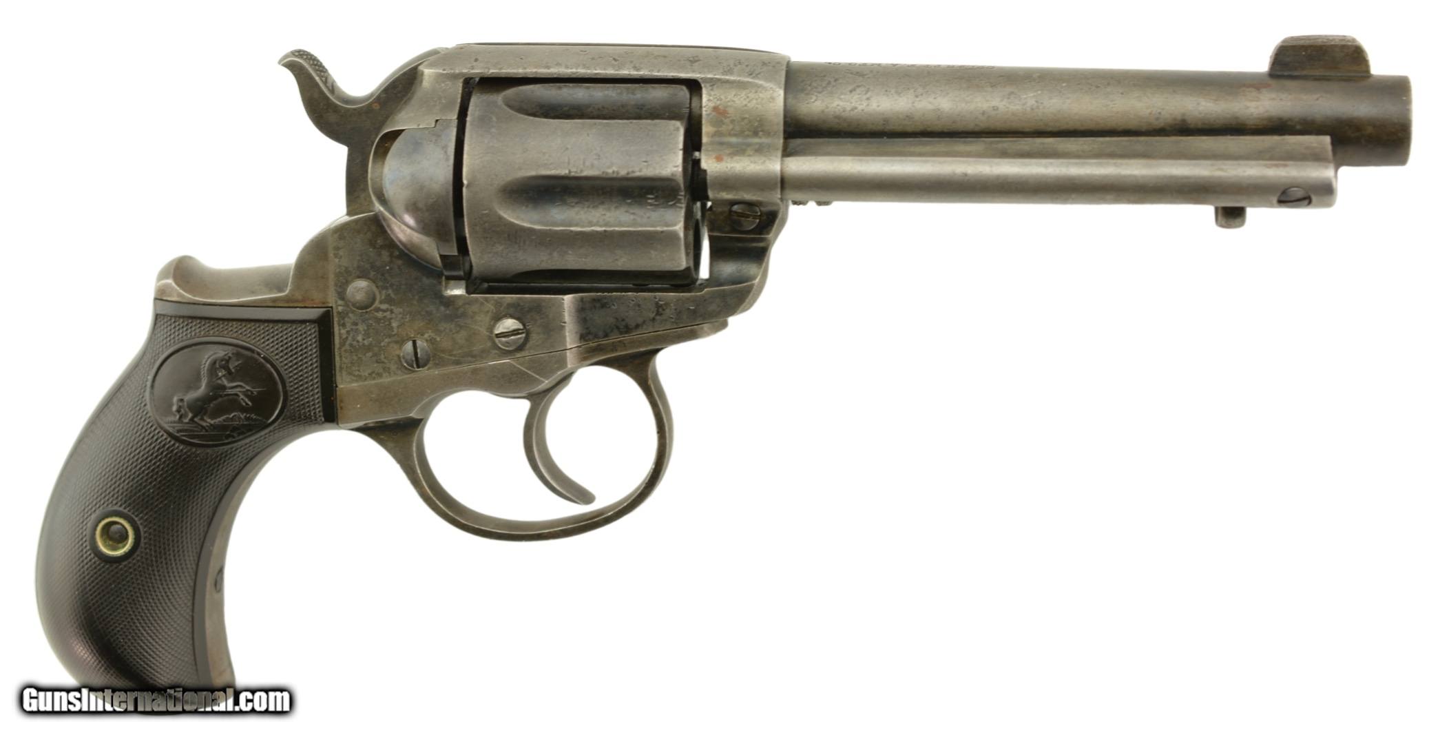 Description: Serial #123212, .38 Colt, 4 1/2" barrel with a good bore that has some minor freckling and pitting within the grooves. This is a 1901-made revolver that has all matching numbers on the frame, cylinder, trigger guard, and backstrap, with the metal having an overall mottled dark gray patina, and traces of original blue on protected areas. Additionally, there are small spots of freckling and pinprick pitting on the barrel, rear of the frame, on the sides of the hammer, and the front sight blade has been regulated. The checkered, hard rubber grips are in very good-near fine shape, and have minor wear and flattening of the points on either side. The action still locks up tightly, and is fully functional in both single and double-action. This is a very good-near fine example of a desirable Colt Lightning overall. FFL or C&R SOLD Curio/Relic: Yes |