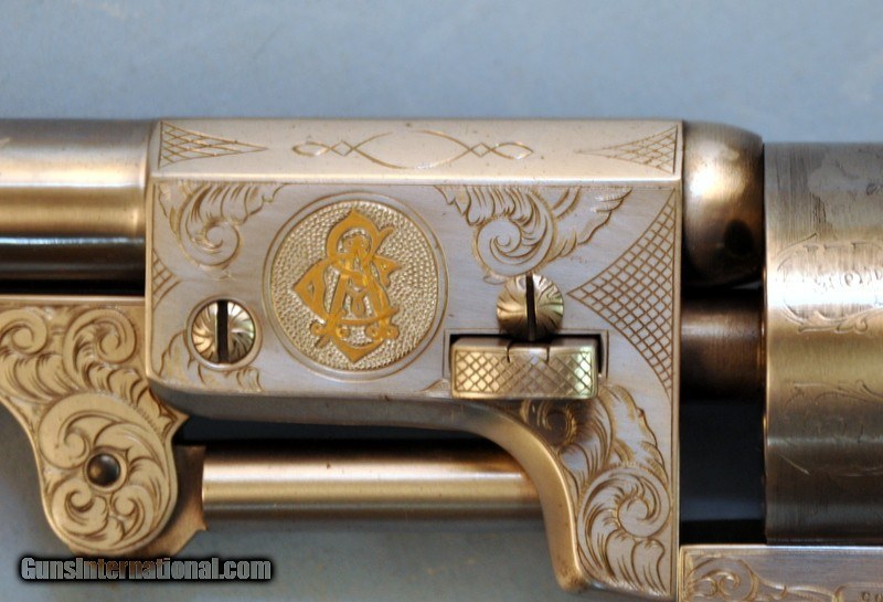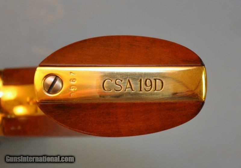 Description: Caliber 44. Serial number 29967. Issue number USA 19D. "The South Colt Dragoon Deluxe Edition" is a hand engraved revolver that commemorative the South's Civil War Heritage. 7-1/2" barrel is marked on the left side "DEO VINDICE" forward of a gold "CSA" emblem. Left isde of frame has a gold banner "ONE OF FIFTY". Butt is marked with issue No. "USA 19D". Antique gray finished revolver has generous coverage of vine type scroll hand engraving that continues on the brass trigger guard & backstrap. Round 6 shot cylinder has Texas Ranger & Indian Fight Scene roll engraving. 1 piece walnut grip. Housed in it's original glass fronted oak presentaion case with fitted interior holding; powder flask, brass bullet mold, nipple wrench & case key. Also includes a full color advertising page, numbered hang tag & descriptive order form. Limited edition of 50 revolvers were issued in approx. the 1996-2002 time period. Original issue price was $2495.00. Revolver is in as new & unfired condition. Priority mail $25.00 SOLD |