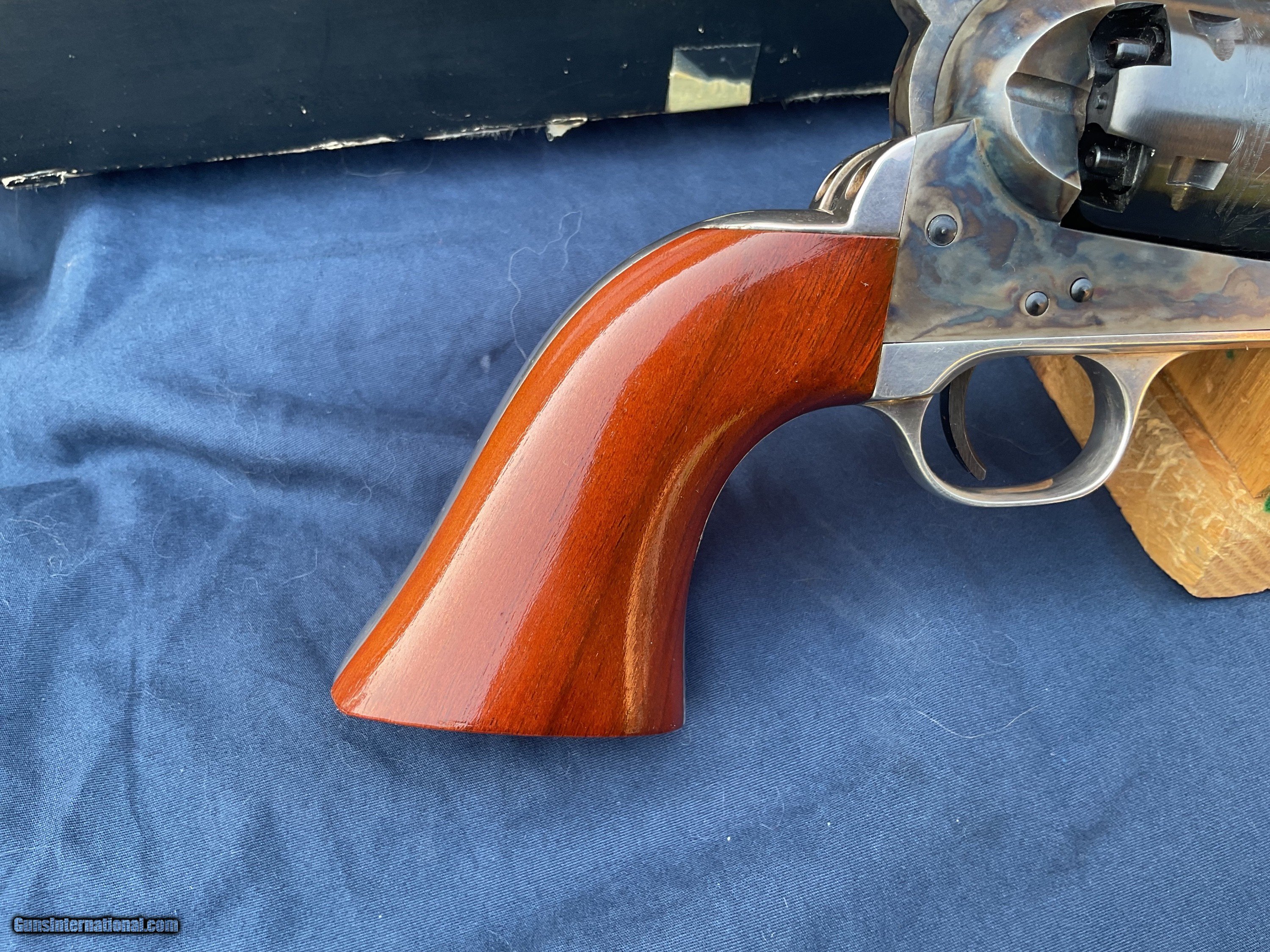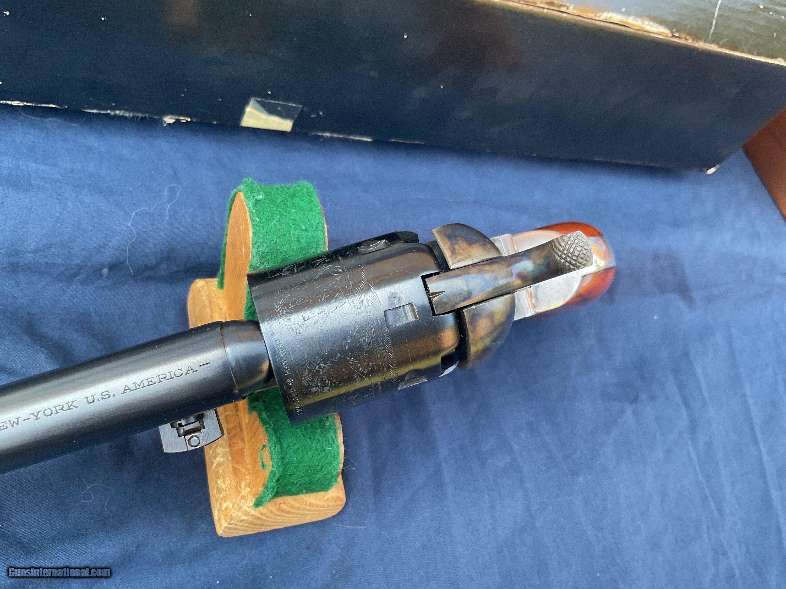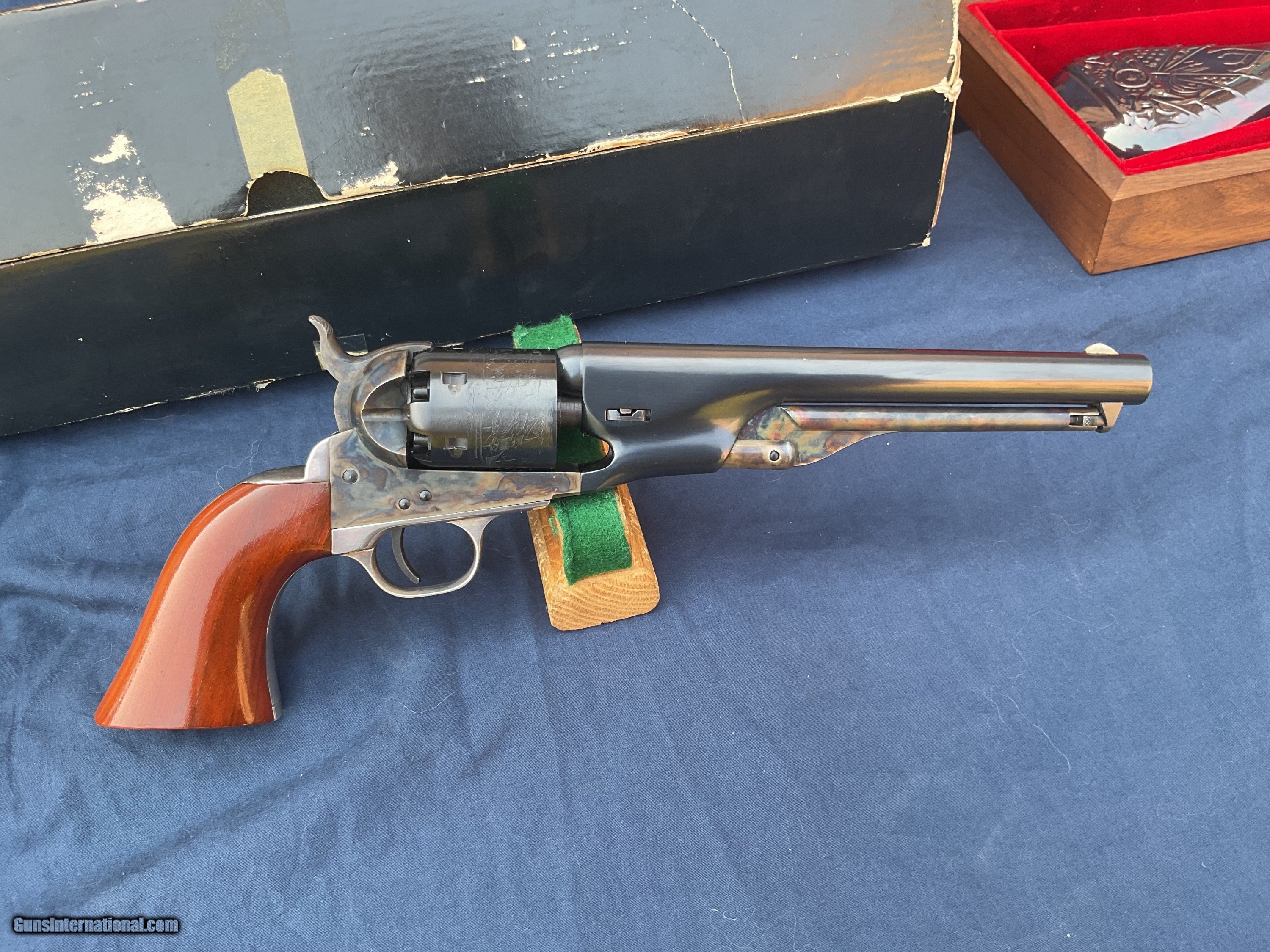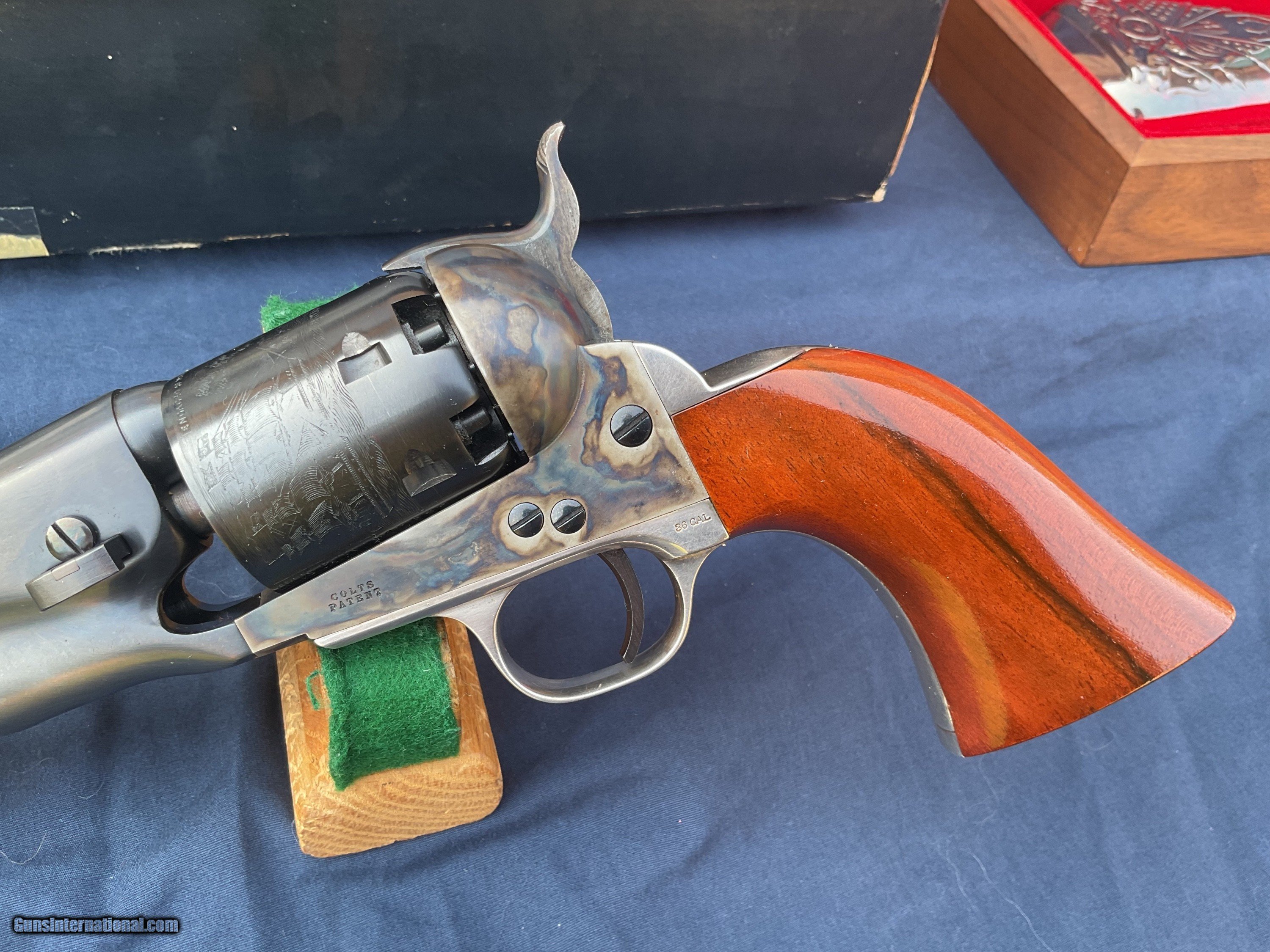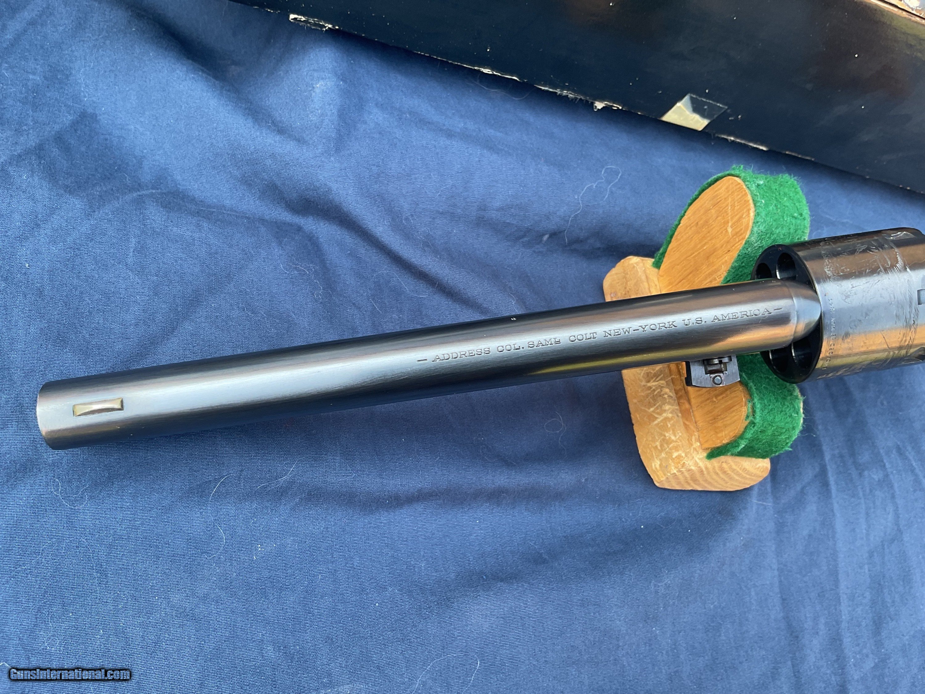 Description: 1861 Navy 2nd generation produced in late 1979 early 1980. Rare model, less than 3200 made, starting with serial number 40,000, this one being in the first 700 made. Colt Authentic Black Powder Series Model 1861 Navy Revolver comes with original box and a nice display case. This is one of the scarcer models from this series and they rarely come up for sale. These 2nd Gen black powder revolvers are avidly collected and when still with the box & display case with some accoutrements they become even more impressive. They are quite eye catching and extremely well made and beautifully finished. Because they are not considered to be modern firearms they do not require paperwork and can be shipped directly to you. This example is in extremely high condition, showing some light handling marks and a tiny trace of a drag line on a couple areas of cylinder. Display case shows some handling marks and some partitions are a little loose. Extremely tough Colt to get in this condition and with all the extras. Original matching box. Please feel free to ask questions. Will consider trades. SOLD |