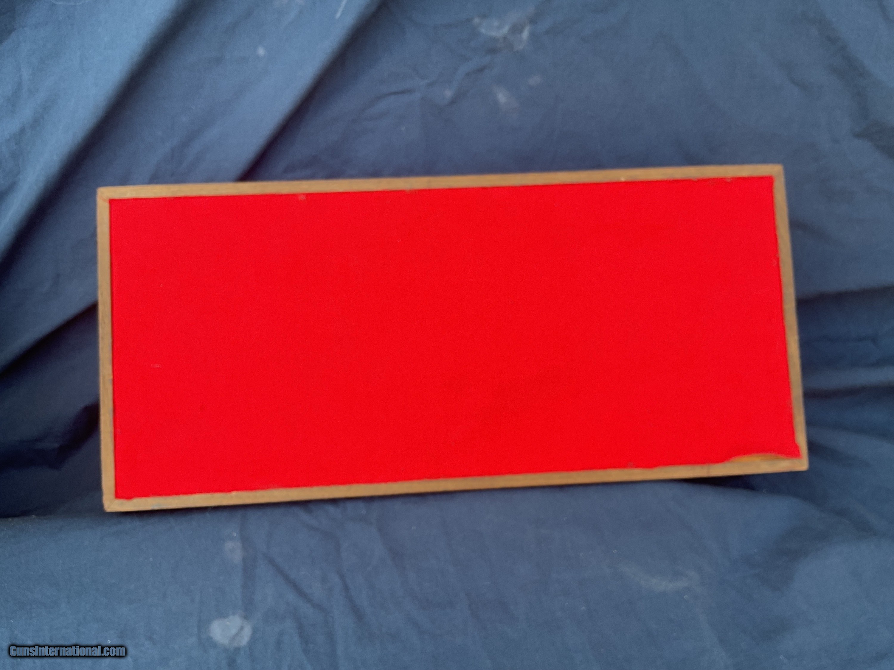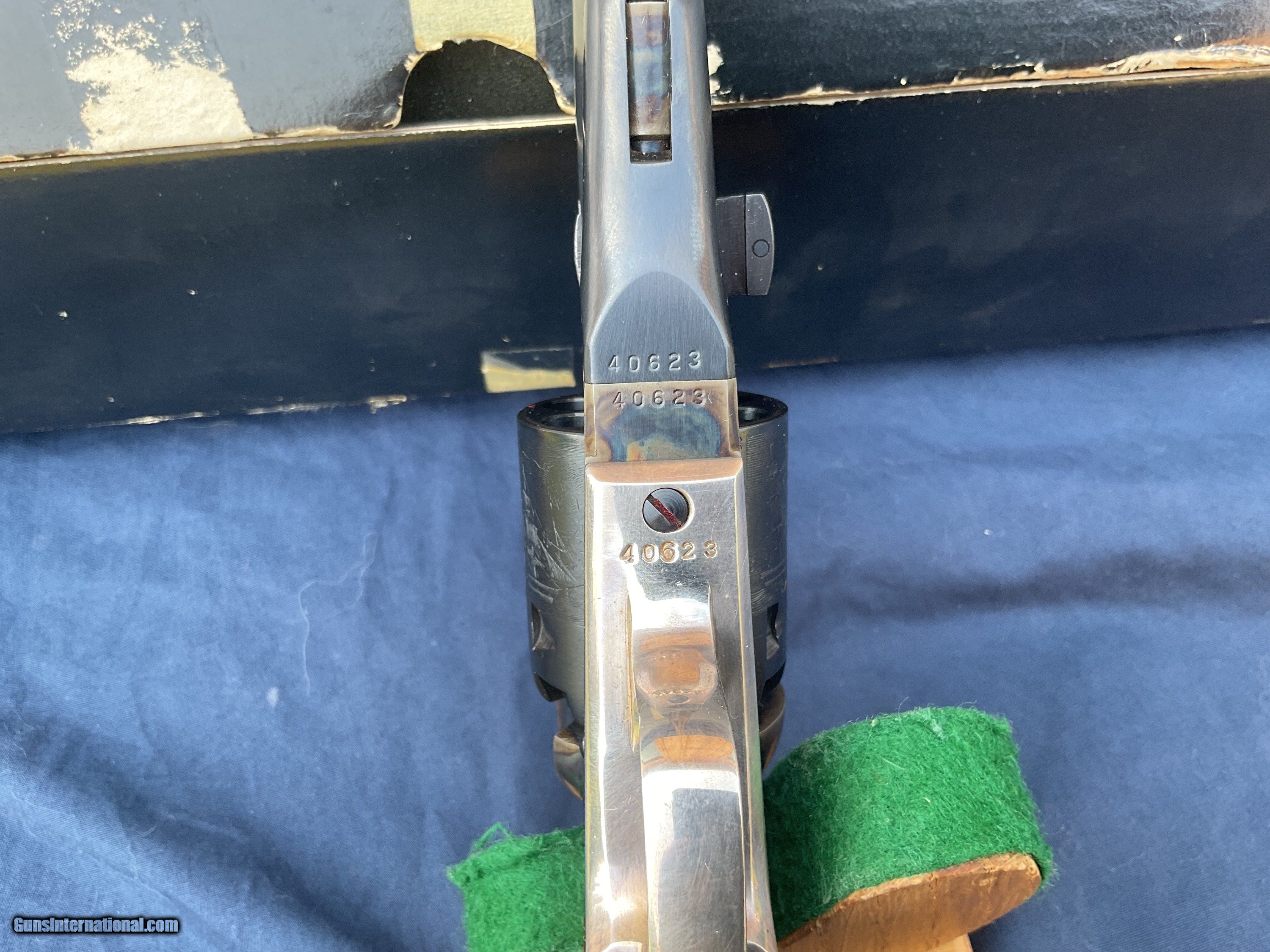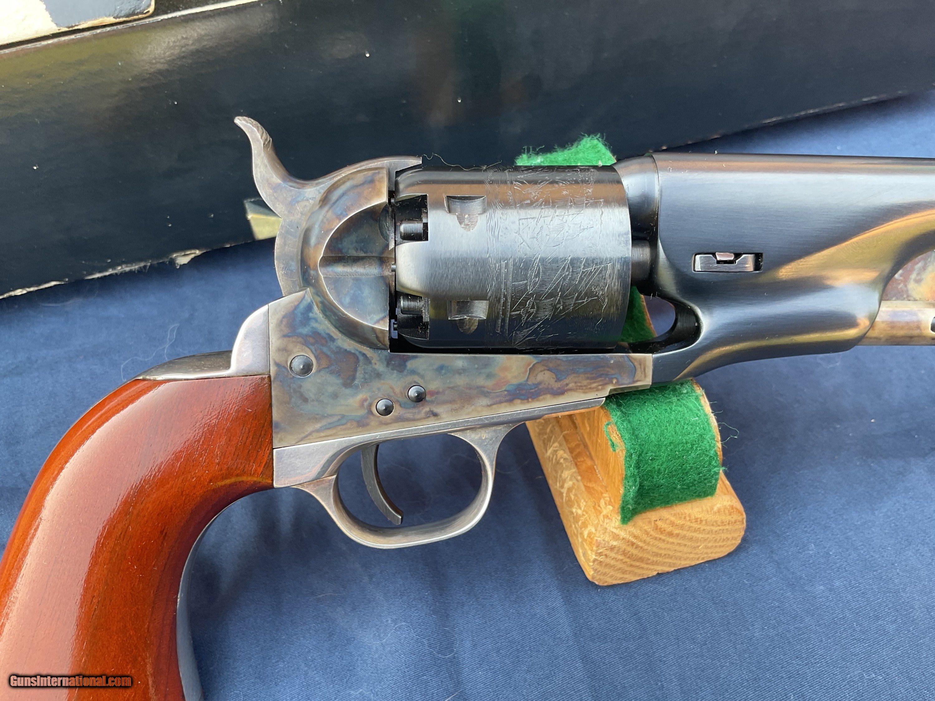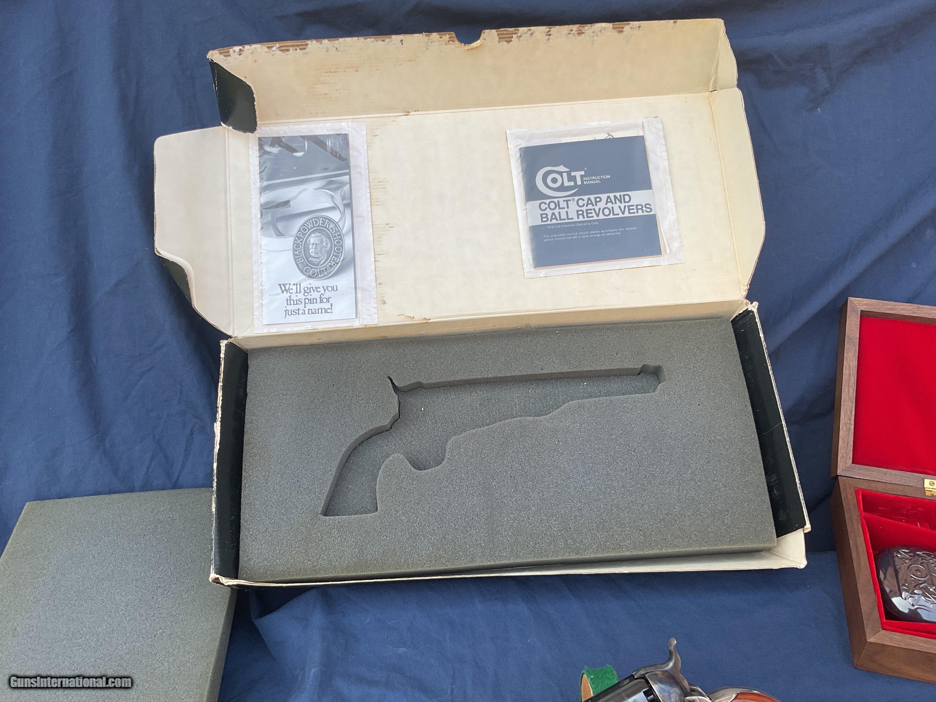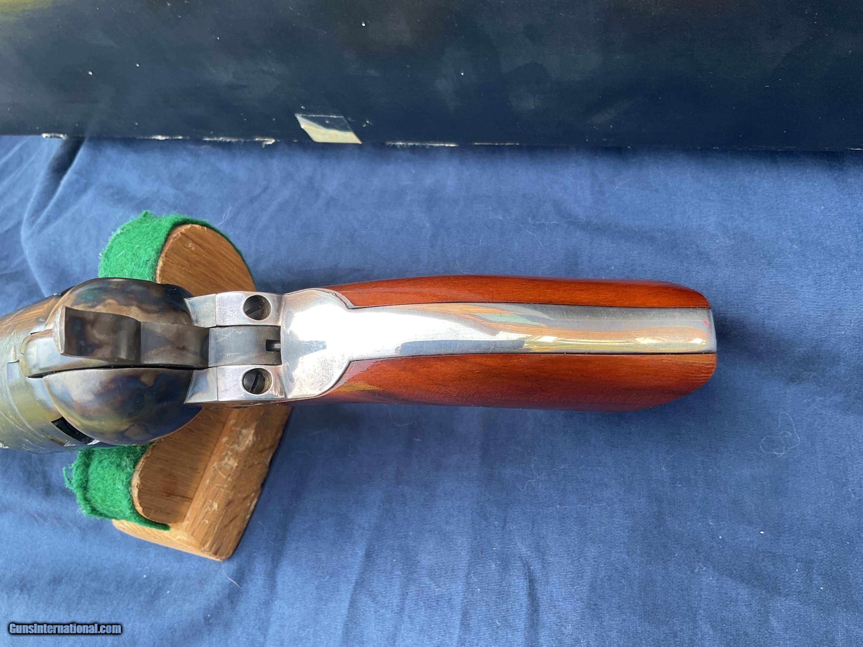 Description: 1861 Navy 2nd generation produced in late 1979 early 1980. Rare model, less than 3200 made, starting with serial number 40,000, this one being in the first 700 made. Colt Authentic Black Powder Series Model 1861 Navy Revolver comes with original box and a nice display case. This is one of the scarcer models from this series and they rarely come up for sale. These 2nd Gen black powder revolvers are avidly collected and when still with the box & display case with some accoutrements they become even more impressive. They are quite eye catching and extremely well made and beautifully finished. Because they are not considered to be modern firearms they do not require paperwork and can be shipped directly to you. This example is in extremely high condition, showing some light handling marks and a tiny trace of a drag line on a couple areas of cylinder. Display case shows some handling marks and some partitions are a little loose. Extremely tough Colt to get in this condition and with all the extras. Original matching box. Please feel free to ask questions. Will consider trades. SOLD |