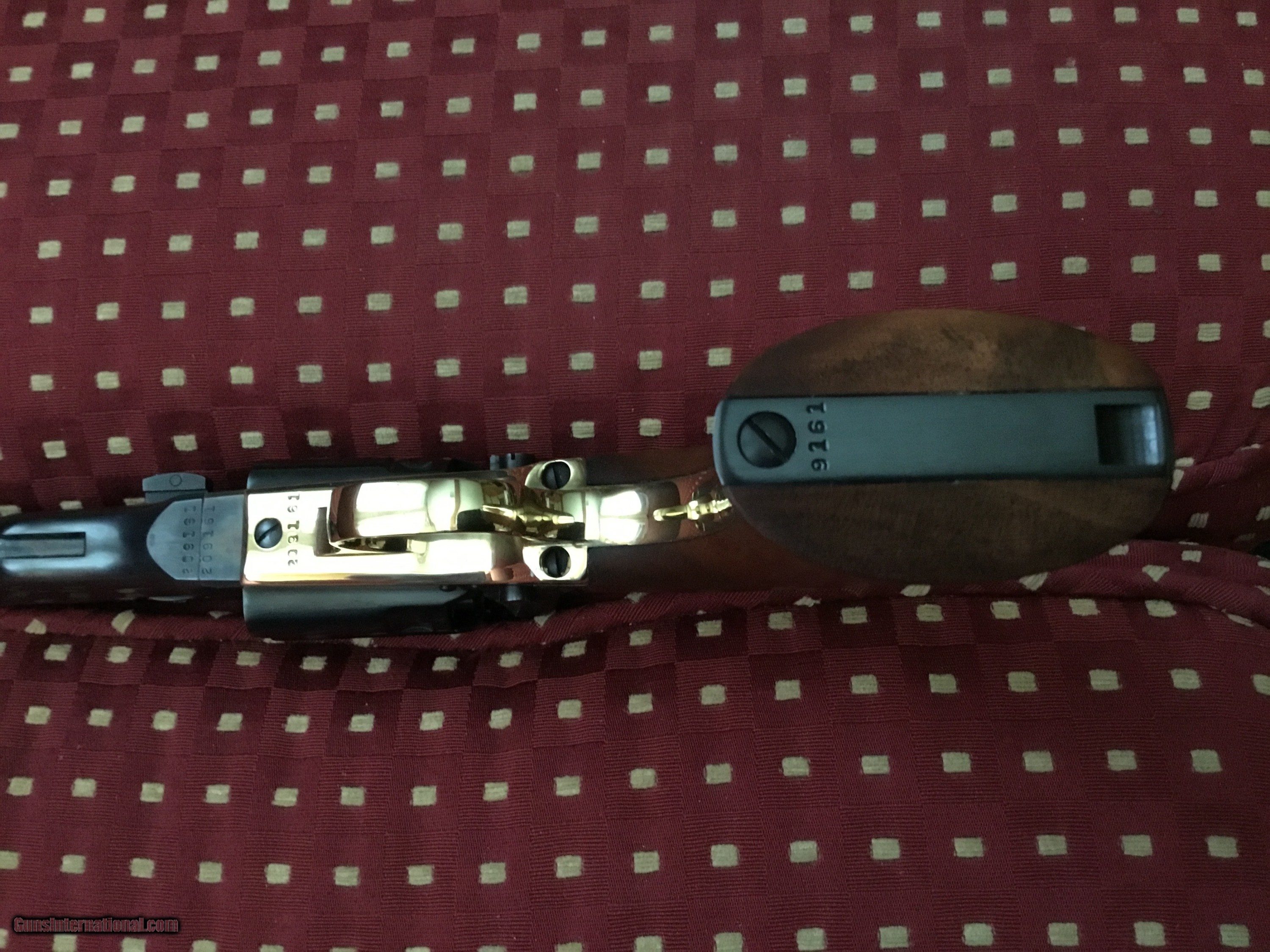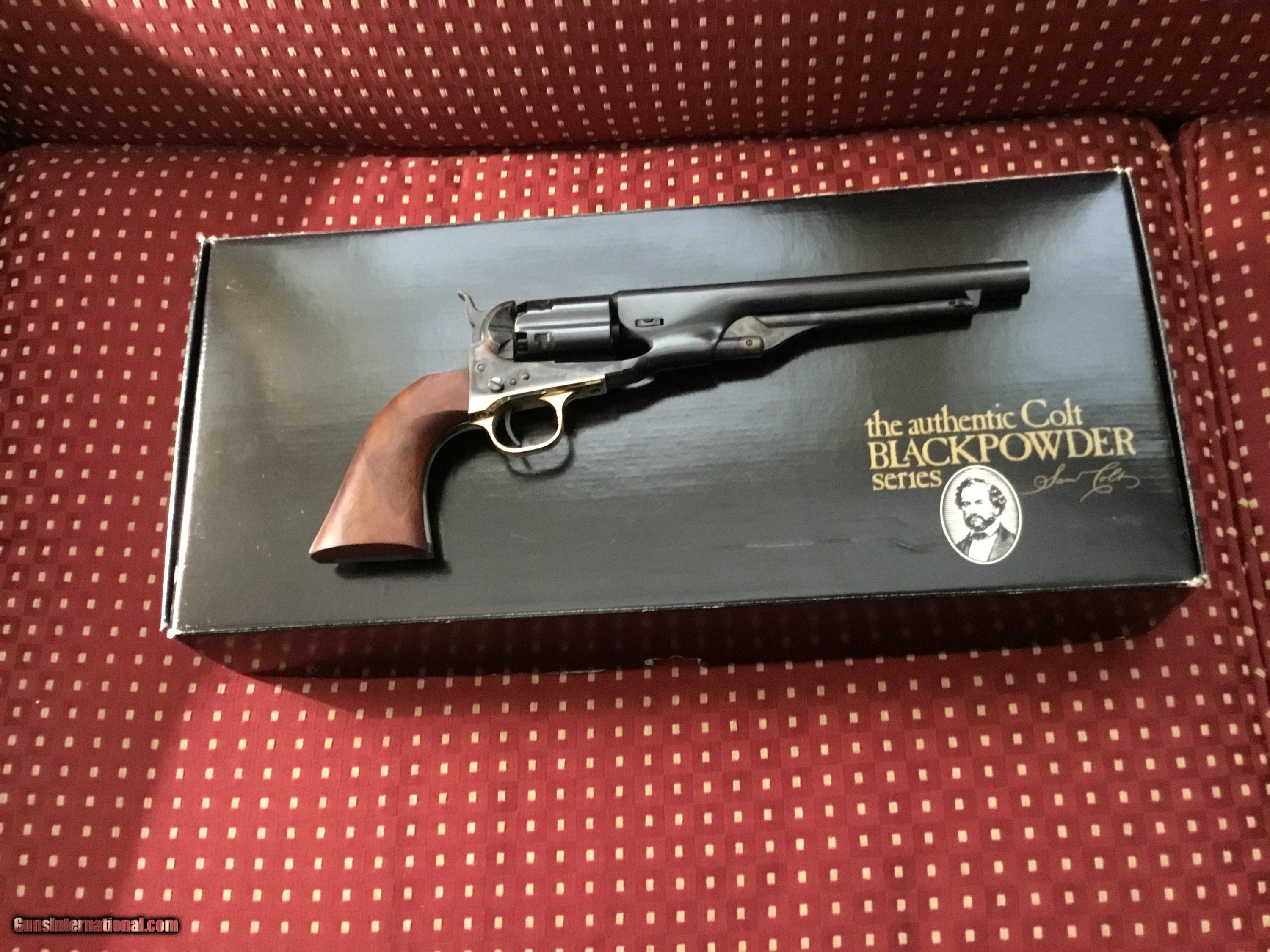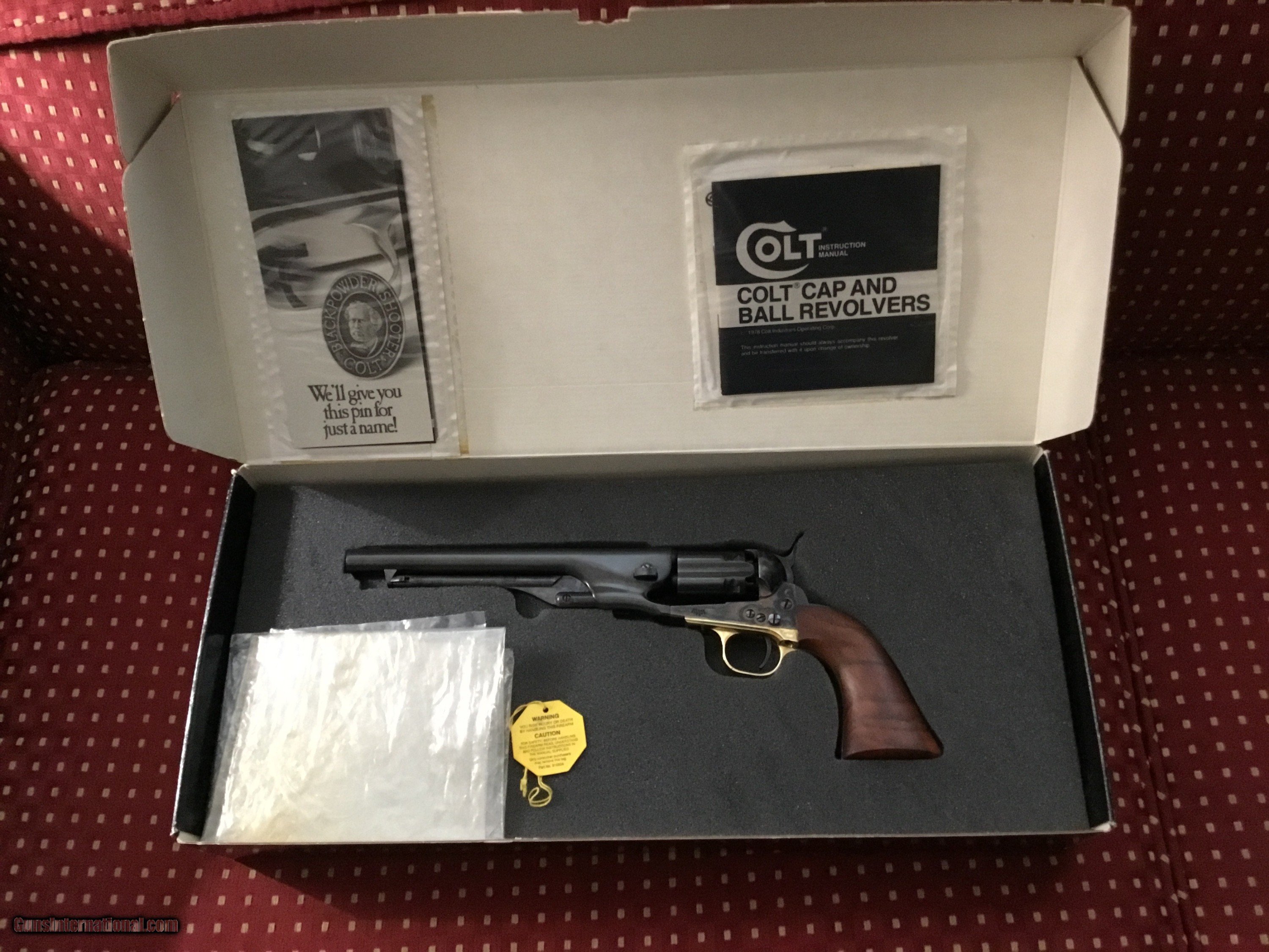 Description: Colt 60 Army with the very seldom seen and highly sought after "fluted" cylinder. This pistol is one of the finest 2nd generation blackpowders I have encountered. Brand new, unfired, no dragline, just perfect. Take a look at the bright and vivid case colors, or the highly grained oil finished wood grips. In the original box with manuals. As good as it gets. Shipping costs $30. SOLD |